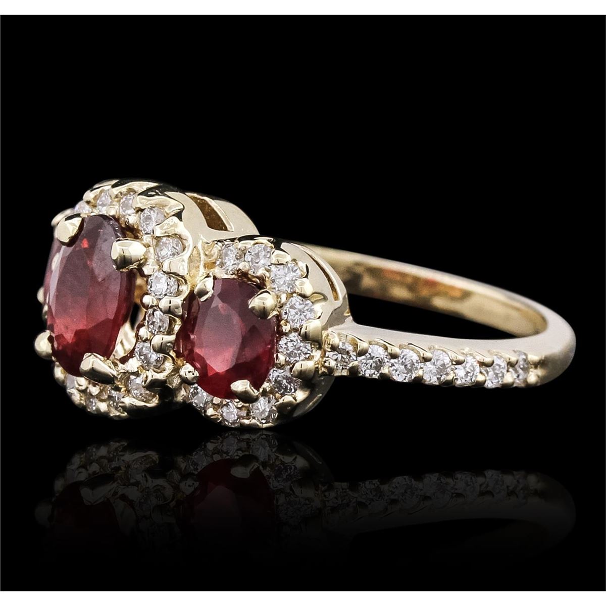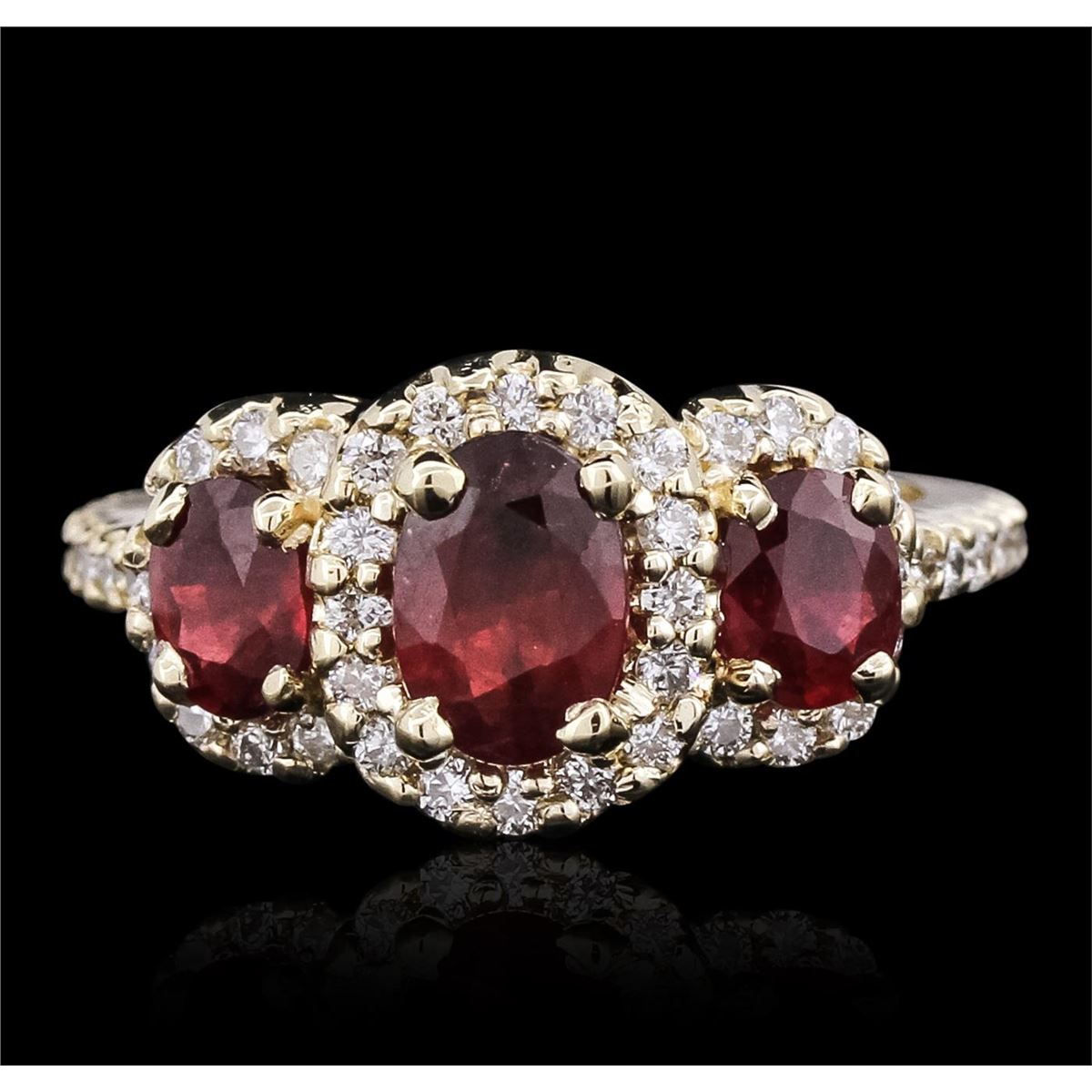 One electronically tested 14KT yellow gold ladies cast ruby and diamond ring with a bright polish finish. The ring features a trio of ruby and diamond bezels supported by diamond set shoulders, completed by a one and one-half millimeter wide band. Identified with markings of "14K". Condition is new, good workmanship. Containing: Three prong set oval mixed cut natural rubies approximate total weight of 2.18ct., clarity is heavily included, type II, medium dark, very slightly brownish, slightly purplish red color, (GIA slpR 6/3), cut is good. Transmitting light somewhat diffusely, transparent to translucent. Naturally occurring internal & external characteristics are present. Indications of laboratory high temperature heat treatment, with glass & flux additives. Color grade is an average for the group. Graded in the setting. Ruby has a low tolerance to rhodium plating, repolishing the surface, & ultrasonic cleaning. Forty-Eight prong set round brilliant cut diamonds, measuring 1.60 - 1.50 x 0.93mm (depth est.) approximate total weight of 48 Stones = 0.75ct. Graded in the setting. Clarity: SI-1 to I-1. Color: G - I. Total Weight of Colored Stones 2.18ct. Total Weight of Diamonds 0.75ct. Total Weight of Ring 5.89 grams. AIG Appraised at $3,615.00.