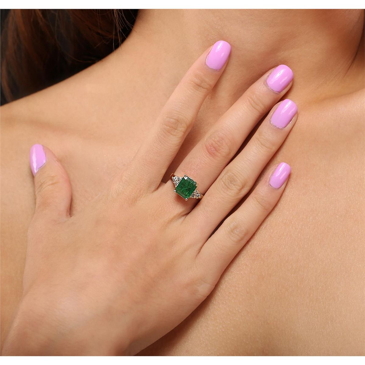 One electronically tested 14KT yellow gold ladies cast emerald and diamond ring with a bright polish finish. The featured emerald is accented by diamond trios on either side supported by split shoulders, completed by a two and one-half millimeter wide band. Identified with markings of "K14". Condition is new, good workmanship. Containing: One prong set rectangular step cut natural emerald, measuring 9.00 x 7.60 x 3.65mm, 8%. bulge factor, approximate weight of 2.20ct., clarity is heavily included, type III, medium, very slightly grayish, very slightly bluish green color, (GIA vslbG 5/3), cut is good. Transmitting light with a minimum of distortion, transparent. Naturally occurring internal & external characteristics are present. Indications of oil & opticon residue. Graded in the setting. Six prong set round brilliant cut diamonds, measuring 2.20 - 2.20 x 1.32mm (depth est.) approximate. Total Weight of 6 Stones = 0.34ct. Graded in the setting. Clarity: SI-1 to I-1 . Color: I - K. Total Weight of Colored Stones 2.20ct. Total Weight of Diamonds 0.34ct. AIG Appraised at $3,290.00.
