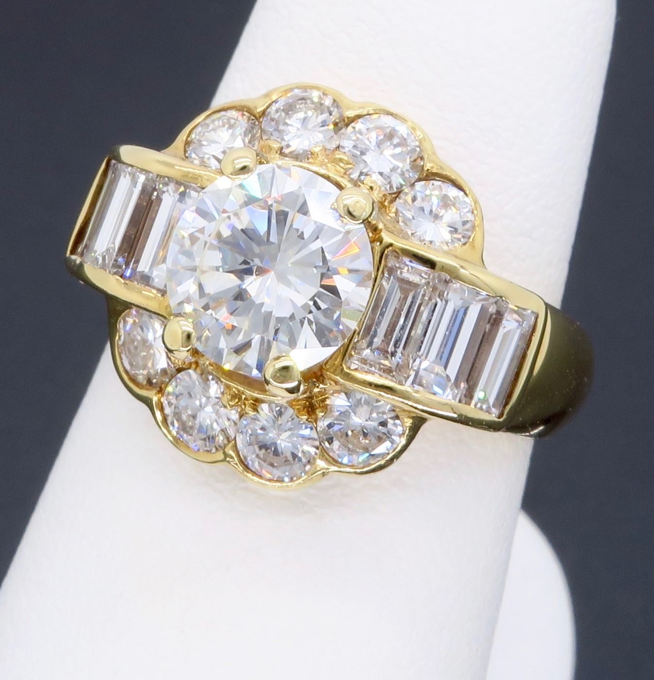 One 14KT Yellow Gold 2.20ctw Diamond Ring. (1) Round center Diamond with a total weight of 1.06cts with a color of H-I and clarity of VS-1. Side Round and Baguette Diamonds with a total weight of 1.14cts. Total weight of this ring is 4.27 grams.