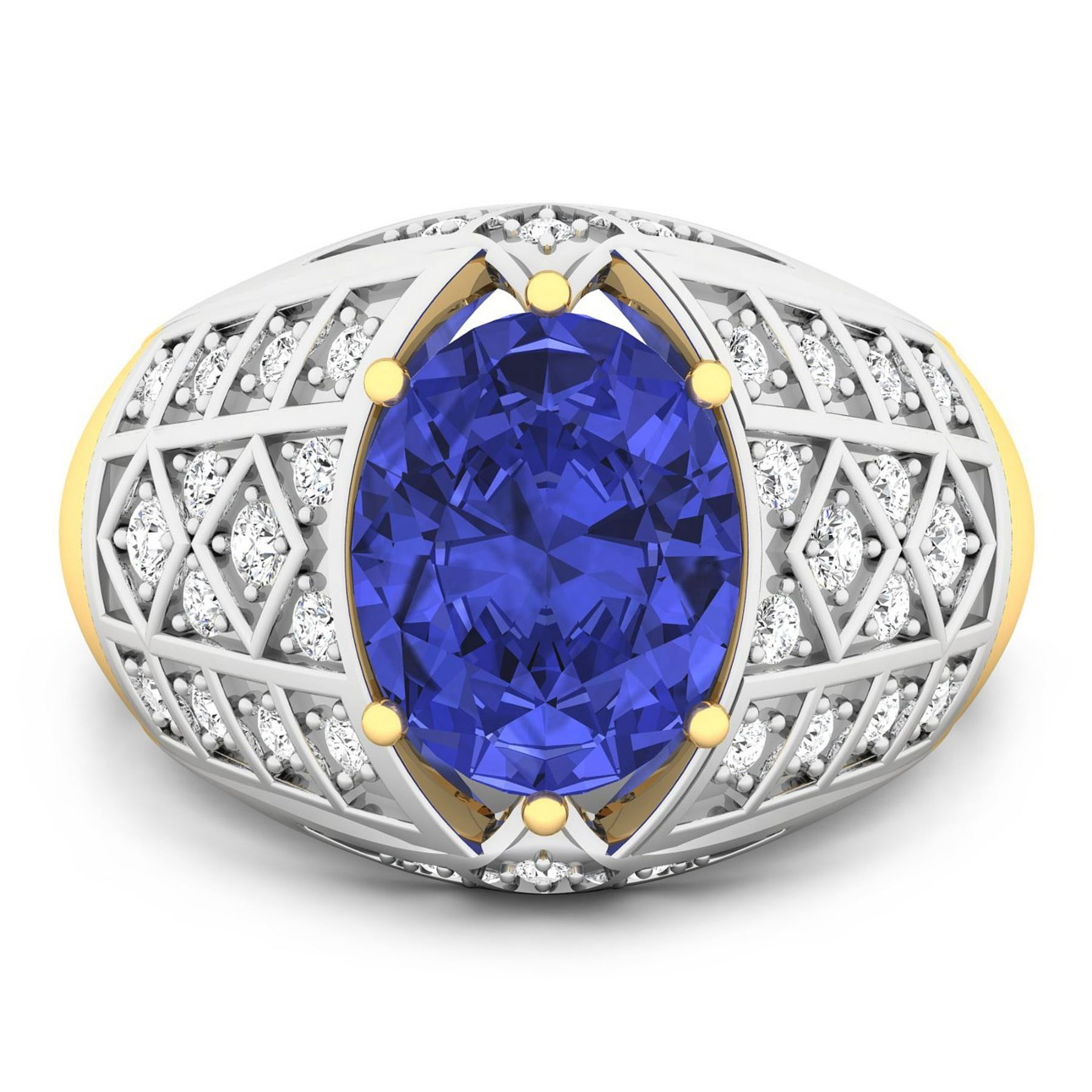 Tanzanite (AA+) Oval 10x8mm - 1Pc + White Diamond F/C Round 1.80mm - 4Pcs + White Diamond F/C Round 1.50mm - 8Pcs + White Diamond F/C Round 1.30mm - 16Pcs + White Diamond F/C Round 1.20mm - 6Pcs ( White Pan Rhodium ) ( SI-2/HI ) Total weight of gemstone is 2.21cts. Total Diamond weight is 0.42cts. Total weight of this ring is 4.6 grams. Ring size 7.
