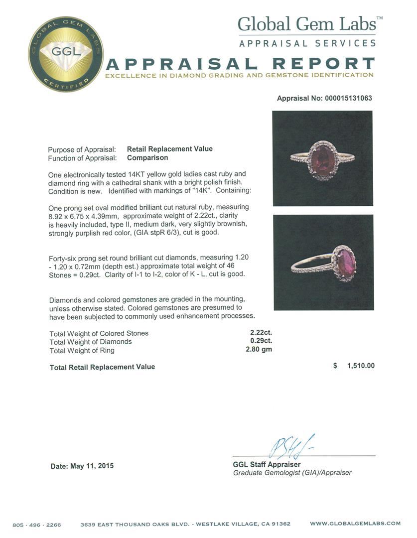 One electronically tested 14KT yellow gold ladies cast ruby and diamond ring with a cathedral shank with a bright polish finish. Identified with markings of "14K". Condition is new. Containing: One prong set oval modified brilliant cut natural ruby, measu GGL Appraised at $1,510.00.