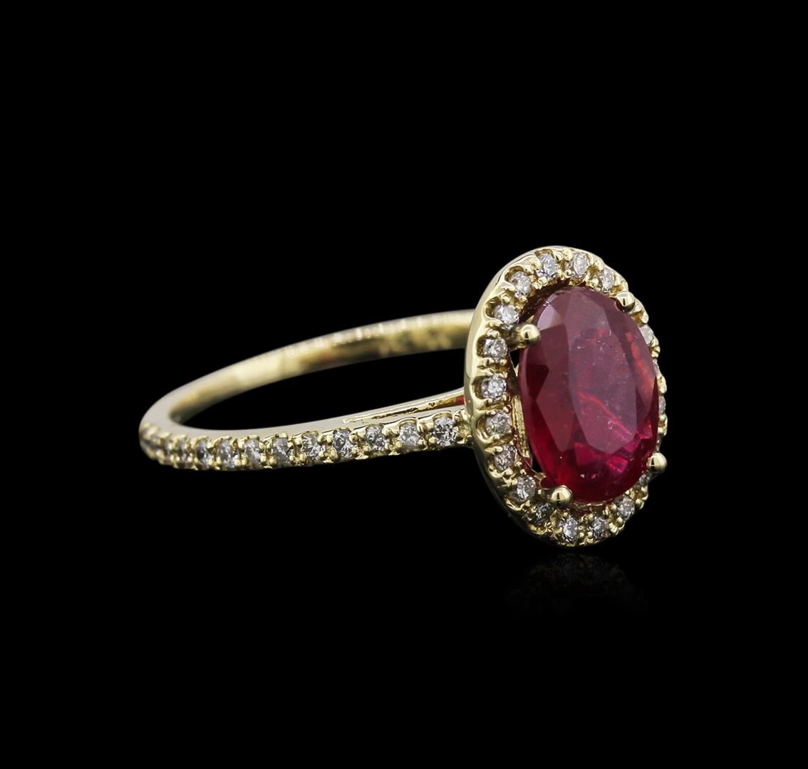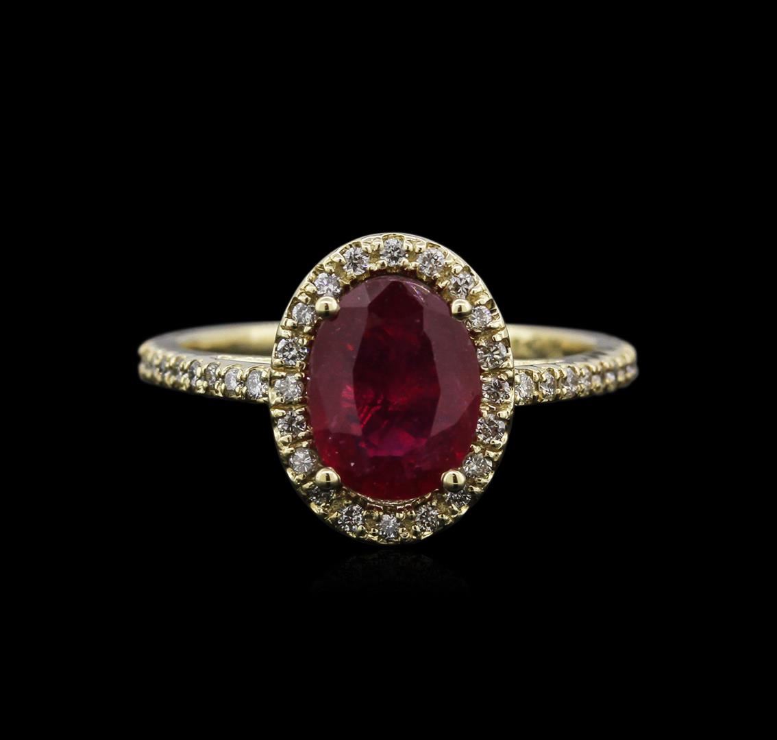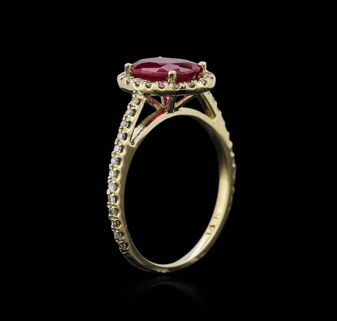 One electronically tested 14KT yellow gold ladies cast ruby and diamond ring with a cathedral shank with a bright polish finish. Identified with markings of "14K". Condition is new. Containing: One prong set oval modified brilliant cut natural ruby, measu GGL Appraised at $1,510.00.