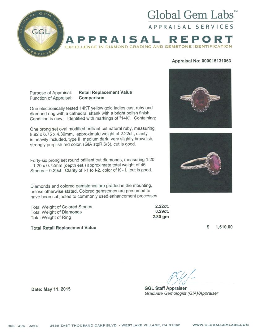 One electronically tested 14KT yellow gold ladies cast ruby and diamond ring with a cathedral shank with a bright polish finish. Identified with markings of "14K". Condition is new. Containing: One prong set oval modified brilliant cut natural ruby, measuring 8.92 x 6.75 x 4.39mm, approximate weight of 2.22ct., clarity is heavily included, type II, medium dark, very slightly brownish, strongly purplish red color, (GIA stpR 6/3), cut is good. Forty-Six prong set round brilliant cut diamonds, measuring 1.20 - 1.20 x 0.72mm (depth est.) approximate total weight of 46 Stones = 0.29ct. Clarity: I-1 to I-2. Color: K - L, Cut is Good. Diamonds and colored gemstones are graded in the mounting, unless otherwise stated. Colored gemstones are presumed to have been subjected to commonly used enhancement processes. Total Weight of Colored Stones 2.22ct. Total Weight of Diamonds 0.29ct. Total Weight of Ring 2.80 grams. GGL Appraised at $1,510.00.