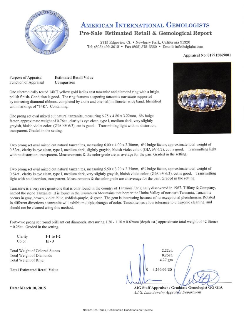 One electronically tested 14KT yellow gold ladies cast tanzanite and diamond ring with a bright polish finish. The ring features a tapering tanzanite curvature supported by mirroring diamond ribbons, completed by a one and one-half millimeter wide band. Identified with markings of "14K". Condition is good. Containing: One prong set oval mixed cut natural tanzanite, measuring 6.75 x 4.80 x 3.22mm, 6% bulge factor, approximate weight of 0.76ct., clarity is eye clean, type I, medium dark, very slightly grayish, bluish violet color, (GIA bV 6/3), cut is good. Transmitting light with no distortion, transparent. Graded in the setting. Two prong set oval mixed cut natural tanzanites, measuring 6.00 x 4.00 x 2.30mm, 6% bulge factor, approximate total weight of 0.82ct., clarity is eye clean, type I, medium dark, slightly grayish, bluish violet color, (GIA bV 6/2), cut is good. Transmitting light with no distortion, transparent. Measurements & the color grade are an average for the pair. Graded in the setting. Two prong set oval mixed cut natural tanzanites, measuring 5.50 x 3.20 x 2.35mm, 6% bulge factor, approximate total weight of 0.64ct., clarity is eye clean, type I, medium dark, very slightly grayish, bluish violet color, (GIA bV 6/3), cut is good. Transmitting light with no distortion, transparent. Measurements & the color grade are an average for the pair. Graded in the setting. Tanzanite is a very rare gemstone that is only found in the country of Tanzania. Originally discovered in 1967. Tiffany & Company, named the stone Tanzanite. It is found in the Usumburu Mountains that border the Umba Valley of northern Tanzania. Tanzanite occurs in gray, brown, violet, blue, reddish-purple, & green. The gem is interesting because of its exceptional pleochroism. Rotated in different directions a tanzanite will exhibit multiple changes of color. Tanzanite has a low tolerance to ultrasonic cleaning, and should not be cleaned using this method. Forty-Two prong set round brilliant cut diamonds, measuring 1.20 - 1.10 x 0.69mm (depth est.) approximate total weight of 42 Stones = 0.25ct. Graded in the setting. Clarity: I-1 to I-2. Color: H - J. Total Weight of Colored Stones 2.22ct. Total Weight of Diamonds 0.25ct. Total Weight of Ring 4.27 grams. AIG Appraised at $4,260.00.