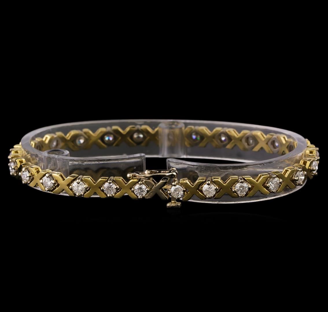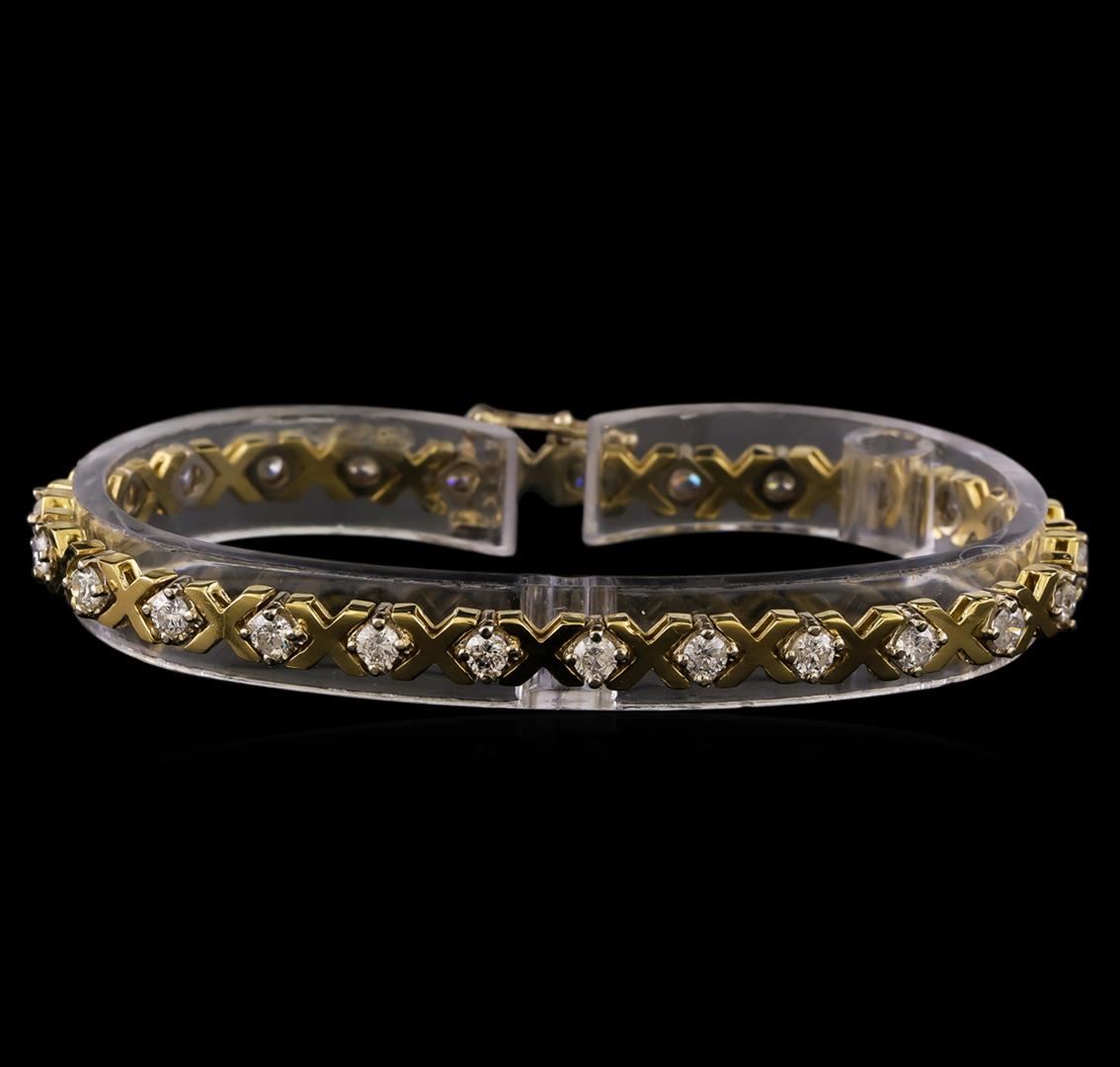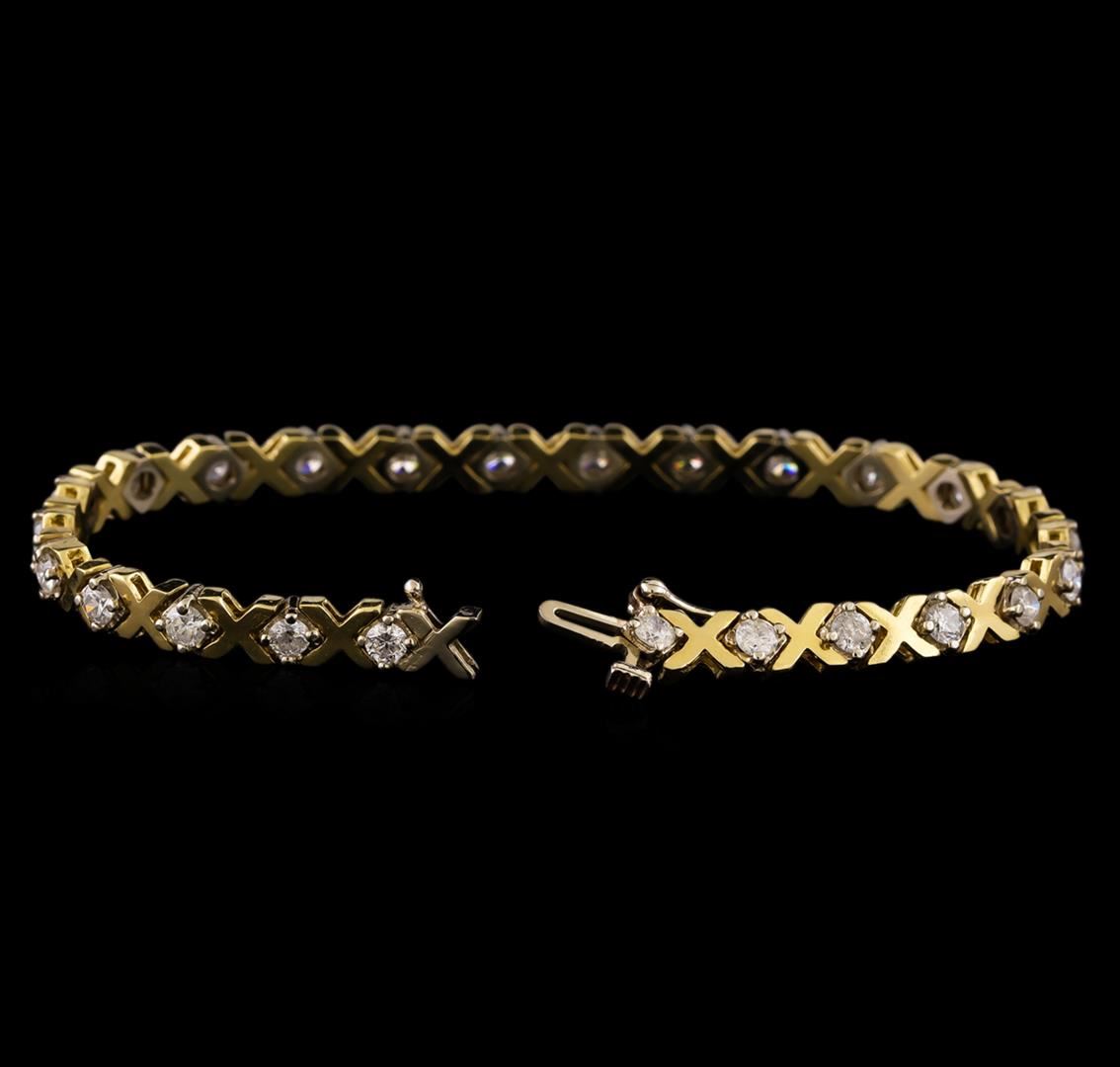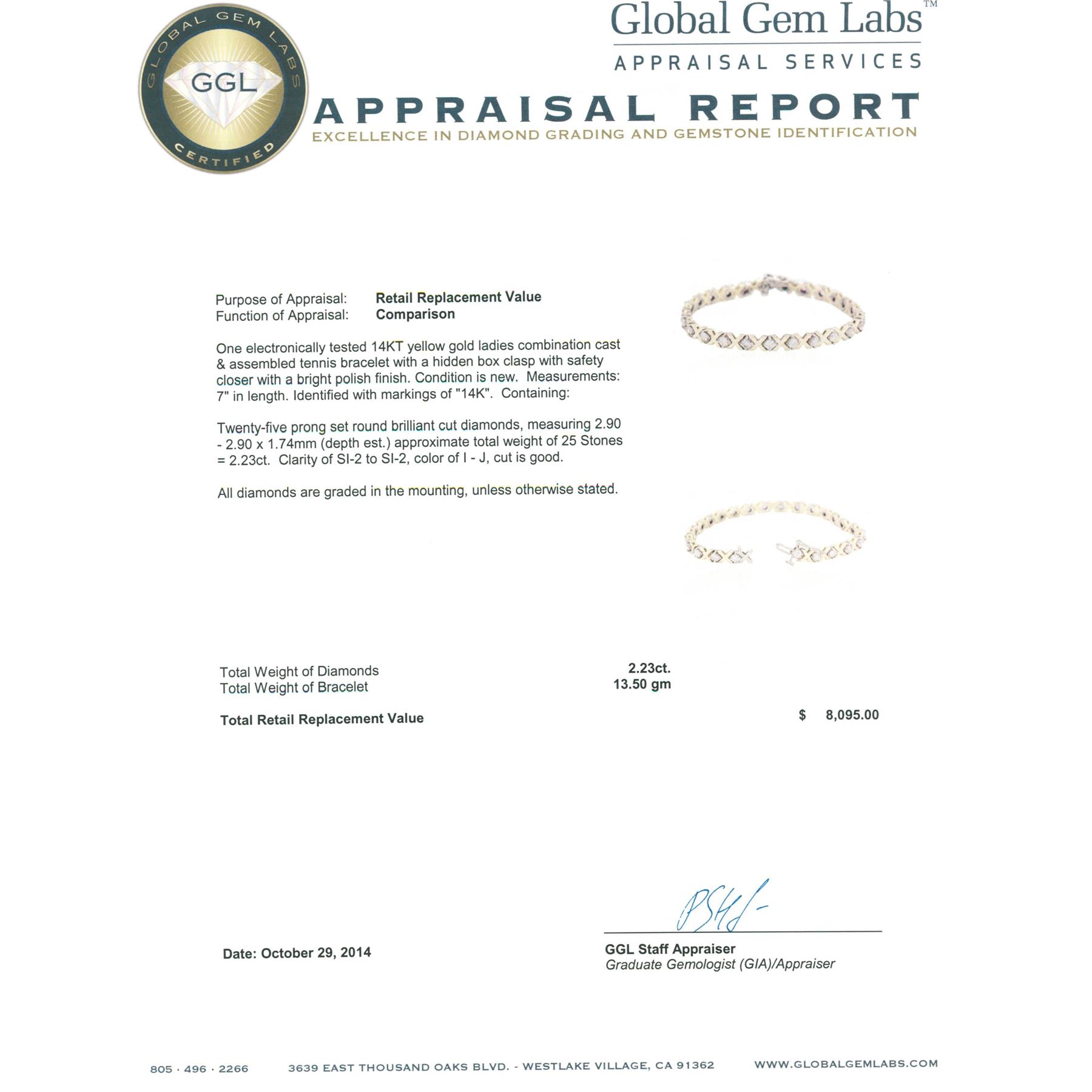 One electronically tested 14KT yellow gold ladies combination cast & assembled tennis bracelet with a hidden box clasp with safety closer with a bright polish finish. Measurements: 7 in length. Identified with markings of 14K. Condition is new. Containing: Twenty-Five prong set round brilliant cut diamonds, measuring 2.90 - 2.90 x 1.74mm (depth est.) approximate total weight of 25 Stones = 2.23ct. Clarity: SI-2 to SI-2. Color: I - J, Cut is Good. All diamonds are graded in the mounting, unless otherwise stated. Total Weight of Diamonds 2.23ct. Total Weight of Bracelet 13.50 grams. GGL Appraised at $8,095.00.