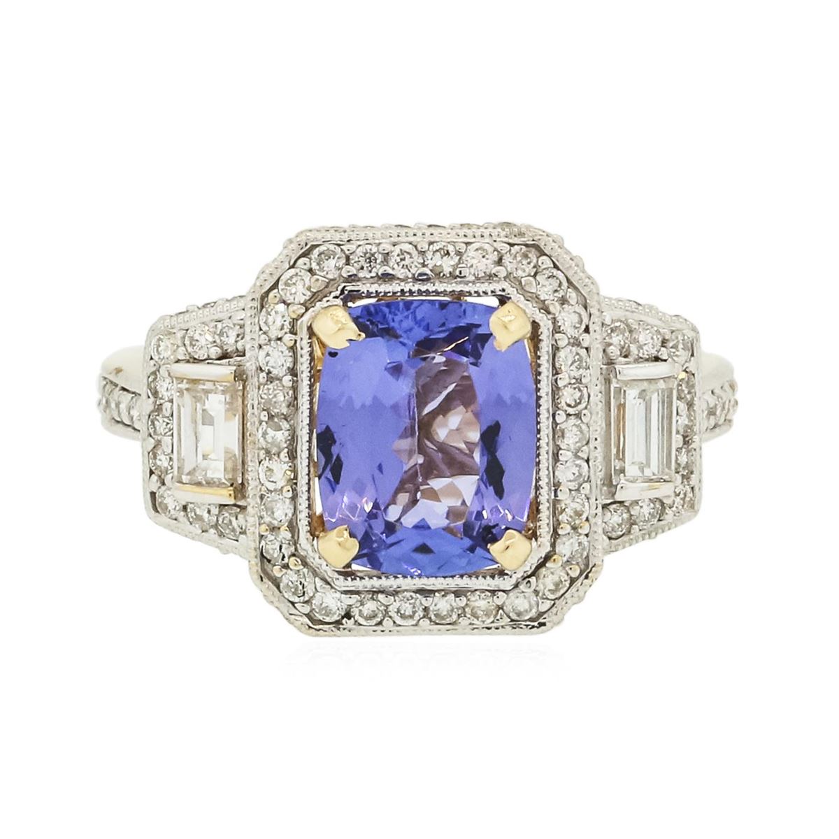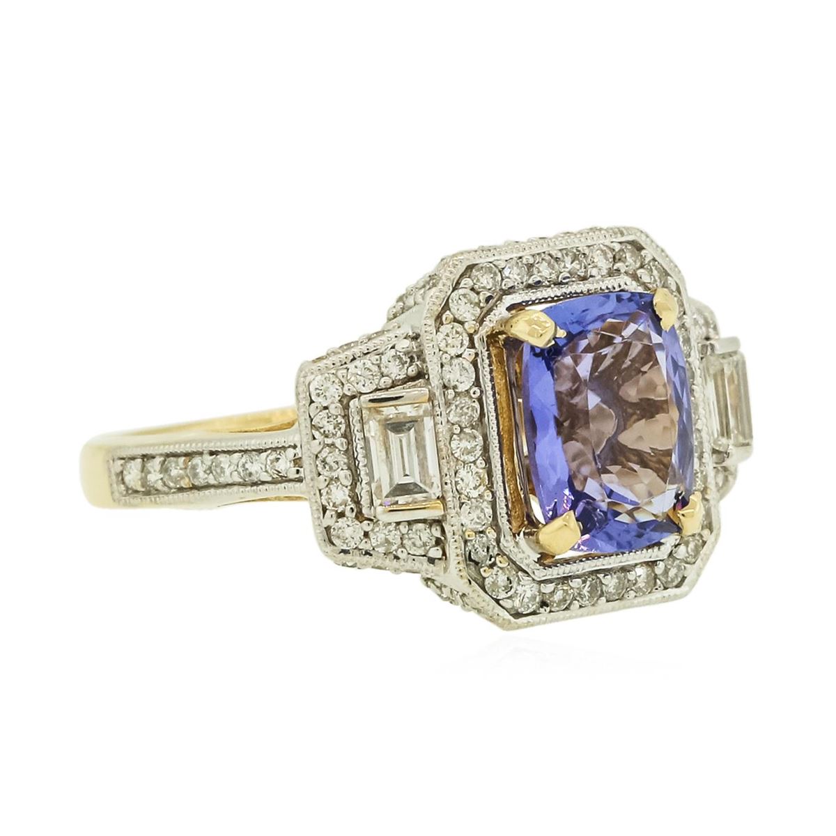One electronically tested 14KT yellow gold ladies combination cast & assembled tanzanite and diamond ring with a flat shank with a bright polish finish. Identified with markings of "14K". Condition is new. Containing: One prong set rectangular cushion modified brilliant cut natural tanzanite, measuring 8.89 x 7.01 x 4.56mm, approximate weight of 2.24ct., clarity is eye clean, type I, medium, very slightly grayish, violet color, (GIA V 5/3), cut is good. One Hundred prong set round brilliant cut diamonds, measuring 1.00 - 1.00 x 0.60mm (depth est.) approximate total weight of 100 Stones = 0.36ct. Clarity: SI-2 to I-1. Color: I - J, Cut is Good. Two prong set baguette cut diamonds, measuring 3.00 x 2.00 x 1.70mm (depth est.) approximate total weight of 2 Stones = 0.19ct. Clarity: SI-1. Color: I, Cut is Good. Colored gemstones are presumed to have been subjected to commonly used enhancement processes. All diamonds and colored gemstones are graded in the mounting, unless otherwise stated. Total Weight of Colored Stones 2.24ct. Total Weight of Diamonds 0.55ct. Total Weight of Ring 4.90 grams. GGL Appraised at $5,720.00.