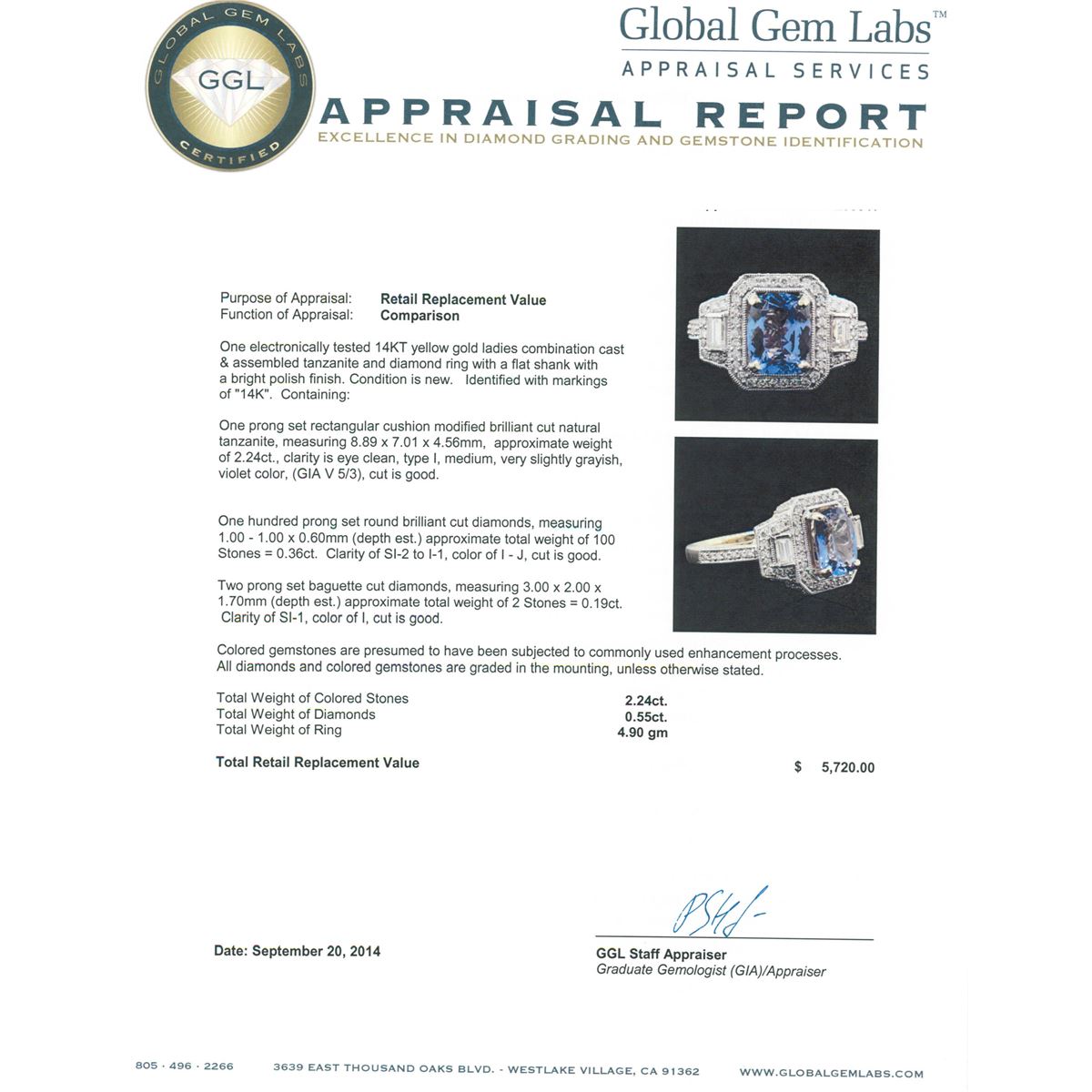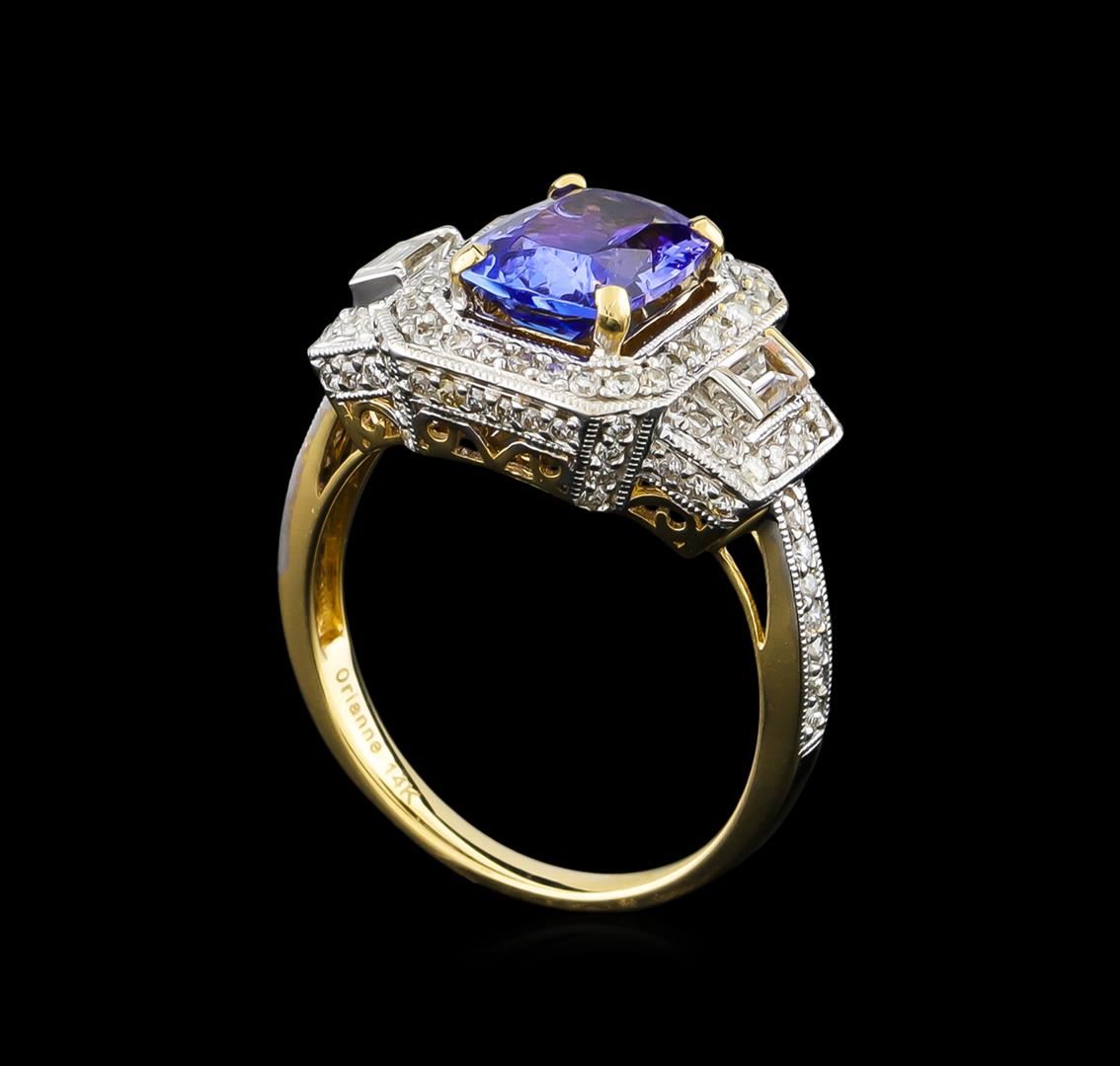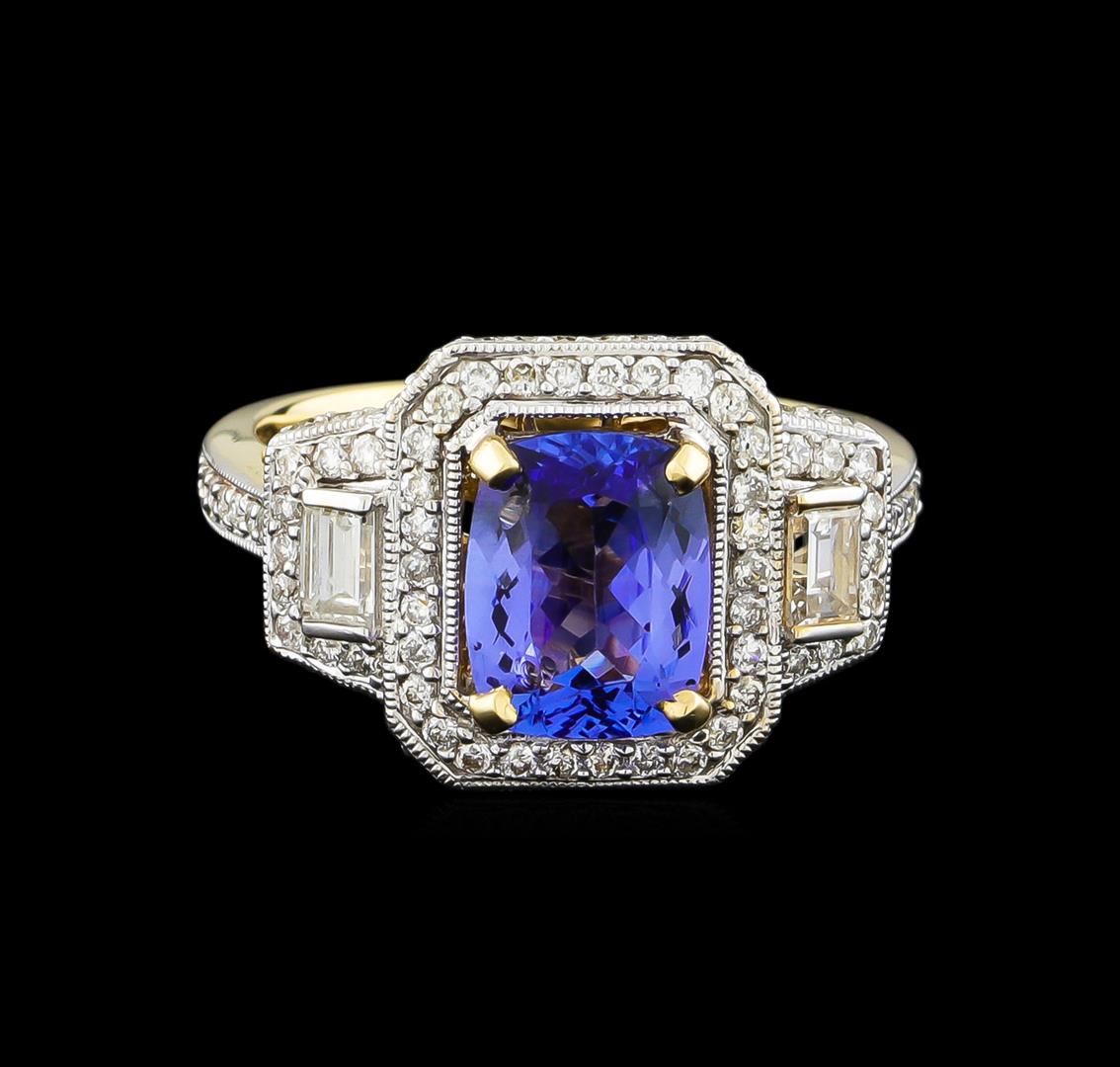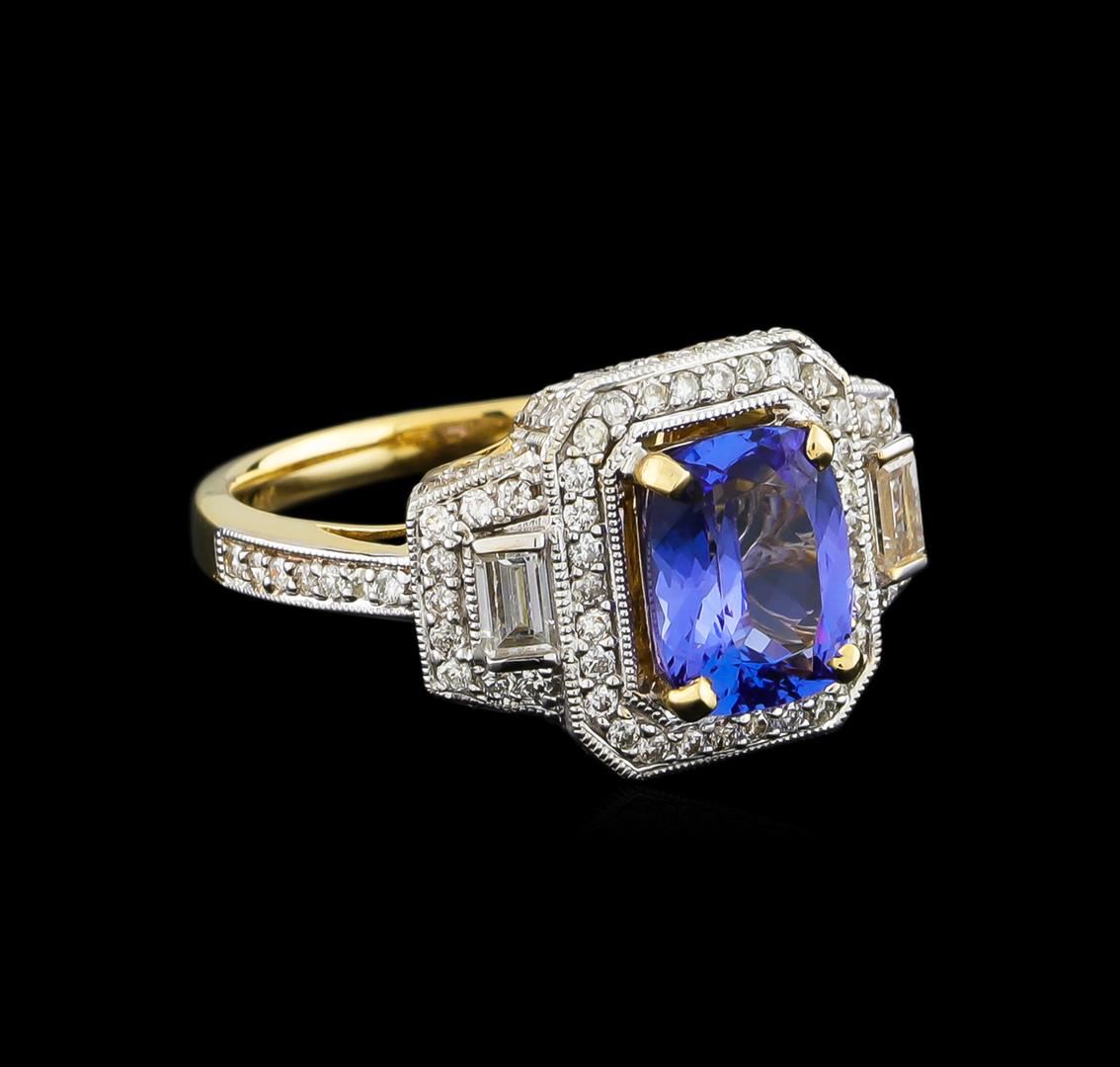 One electronically tested 14KT yellow gold ladies combination cast & assembled tanzanite and diamond ring with a flat shank with a bright polish finish. Identified with markings of "14K". Condition is new. Containing: One prong set rectangular cushion modified brilliant cut natural tanzanite, measuring 8.89 x 7.01 x 4.56mm, approximate weight of 2.24ct., clarity is eye clean, type I, medium, very slightly grayish, violet color, (GIA V 5/3), cut is good. One Hundred prong set round brilliant cut diamonds, measuring 1.00 - 1.00 x 0.60mm (depth est.) approximate total weight of 100 Stones = 0.36ct. Clarity: SI-2 to I-1. Color: I - J, Cut is Good. Two prong set baguette cut diamonds, measuring 3.00 x 2.00 x 1.70mm (depth est.) approximate total weight of 2 Stones = 0.19ct. Clarity: SI-1. Color: I, Cut is Good. Colored gemstones are presumed to have been subjected to commonly used enhancement processes. All diamonds and colored gemstones are graded in the mounting, unless otherwise stated. Total Weight of Colored Stones 2.24ct. Total Weight of Diamonds 0.55ct. Total Weight of Ring 4.90 grams. GGL Appraised at $5,720.00.