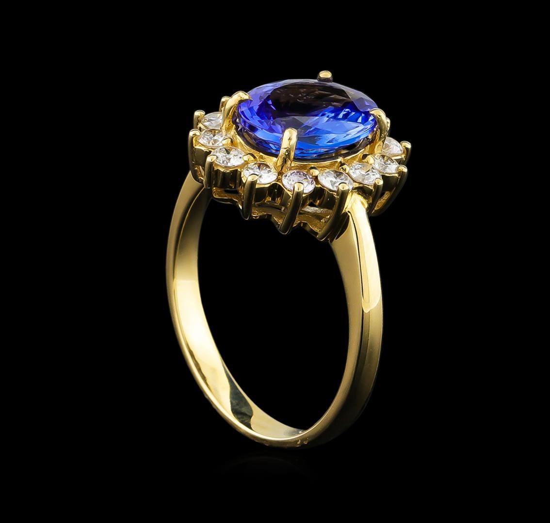 One electronically tested 14KT yellow gold ladies combination cast & assembled tanzanite and diamond ring with a flat shank with a bright polish finish. Identified with markings of "14K". Condition is new. Containing: One prong set oval modified brilliant cut natural tanzanite, measuring 9.72 x 8.35 x 4.10mm, approximate weight of 2.24ct., clarity is eye clean, type I, medium, moderately strong, bluish violet color, (GIA bV 5/4), cut is good. Fourteen prong set round brilliant cut diamonds, measuring 2.00 - 2.00 x 1.20mm (depth est.) approximate total weight of 14 Stones = 0.41ct. Clarity: SI-2 to I-1. Color: I - J, Cut is Good. Colored gemstones are presumed to have been subjected to commonly used enhancement processes. All diamonds and colored gemstones are graded in the mounting, unless otherwise stated total weight of Colored Stones 2.24ct. Total Weight of Diamonds 0.41ct. Total Weight of Ring 4.20 grams. GGL Appraised at $6,155.00.