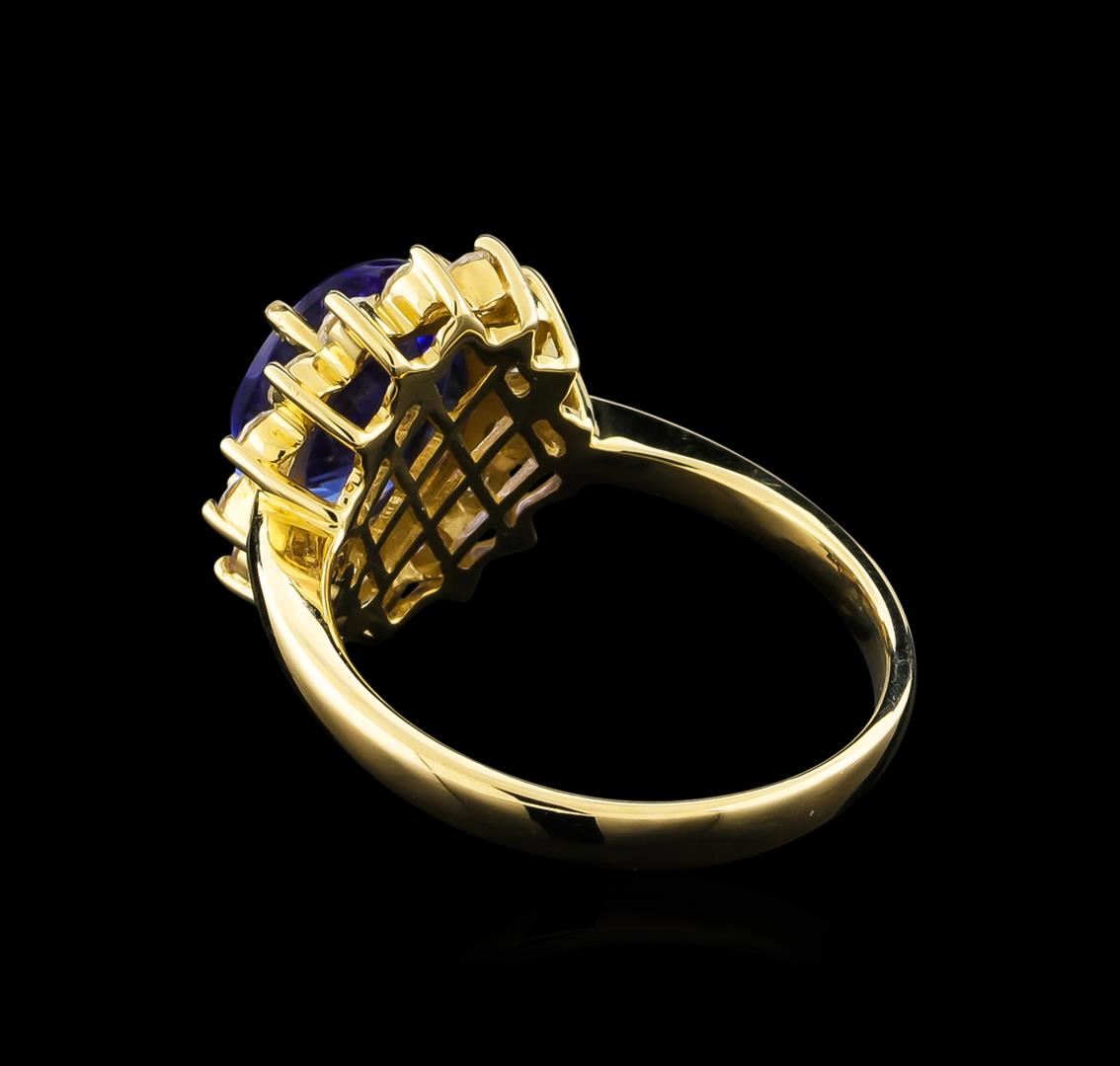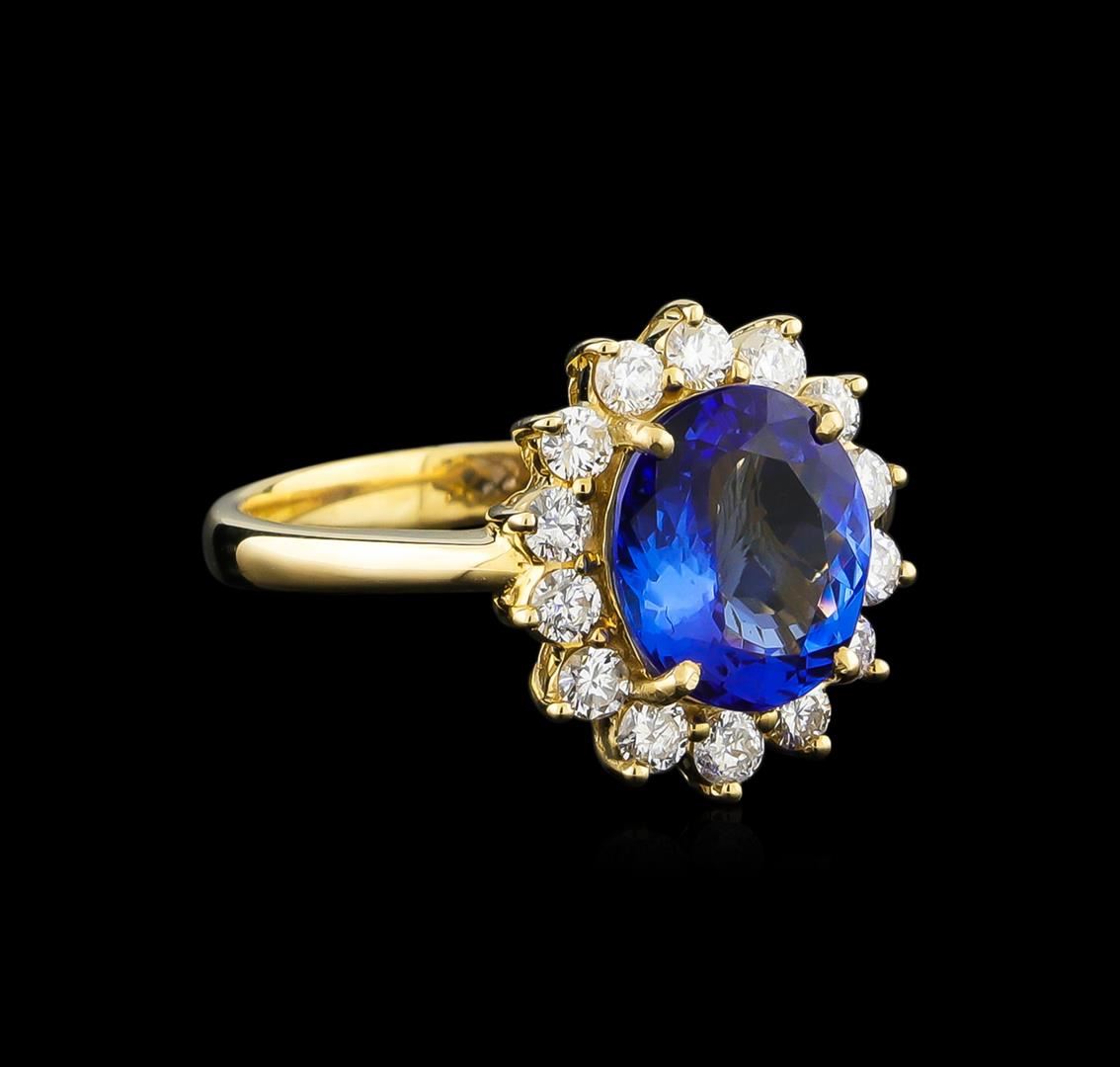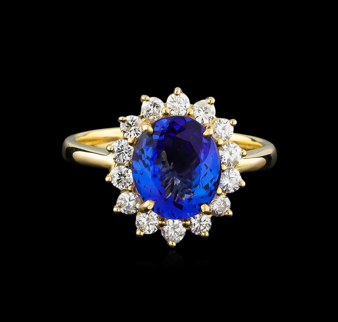 One electronically tested 14KT yellow gold ladies combination cast & assembled tanzanite and diamond ring with a flat shank with a bright polish finish. Identified with markings of "14K". Condition is new. Containing: One prong set oval modified brilliant cut natural tanzanite, measuring 9.72 x 8.35 x 4.10mm, approximate weight of 2.24ct., clarity is eye clean, type I, medium, moderately strong, bluish violet color, (GIA bV 5/4), cut is good. Fourteen prong set round brilliant cut diamonds, measuring 2.00 - 2.00 x 1.20mm (depth est.) approximate total weight of 14 Stones = 0.41ct. Clarity: SI-2 to I-1. Color: I - J, Cut is Good. Colored gemstones are presumed to have been subjected to commonly used enhancement processes. All diamonds and colored gemstones are graded in the mounting, unless otherwise stated total weight of Colored Stones 2.24ct. Total Weight of Diamonds 0.41ct. Total Weight of Ring 4.20 grams. GGL Appraised at $6,155.00.