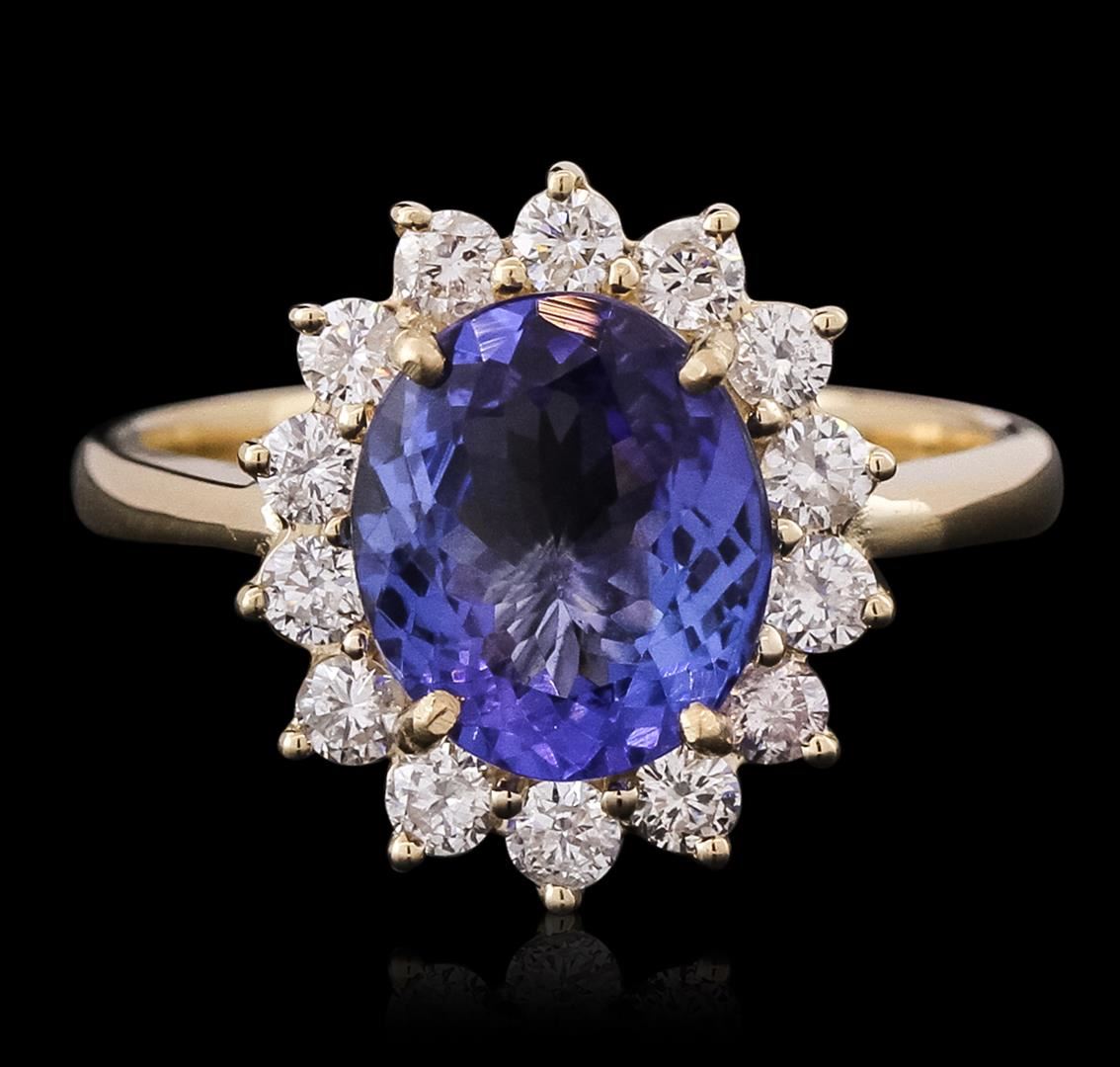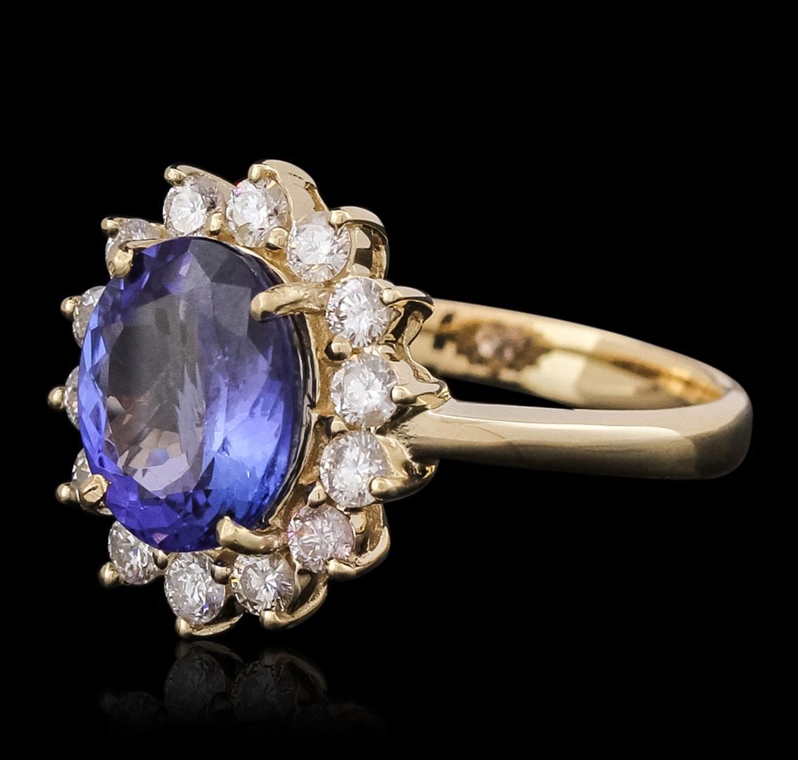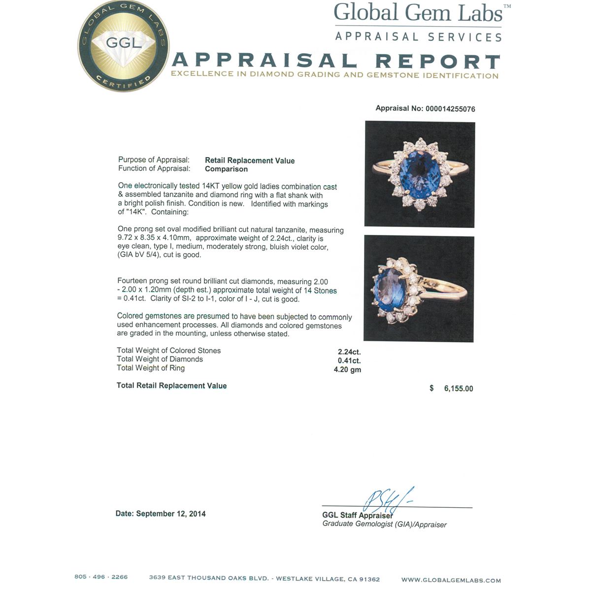 One electronically tested 14KT yellow gold ladies combination cast & assembled tanzanite and diamond ring with a flat shank with a bright polish finish. Identified with markings of "14K". Condition is new. Containing: One prong set oval modified brilliant cut natural tanzanite, measuring 9.72 x 8.35 x 4.10mm, approximate weight of 2.24ct., clarity is eye clean, type I, medium, moderately strong, bluish violet color, (GIA bV 5/4), cut is good. Fourteen prong set round brilliant cut diamonds, measuring 2.00 - 2.00 x 1.20mm (depth est.) approximate total weight of 14 Stones = 0.41ct. Clarity: SI-2 to I-1. Color: I - J, Cut is Good. Colored gemstones are presumed to have been subjected to commonly used enhancement processes. All diamonds and colored gemstones are graded in the mounting, unless otherwise stated total weight of Colored Stones 2.24ct. Total Weight of Diamonds 0.41ct. Total Weight of Ring 4.20 grams. GGL Appraised at $6,155.00.