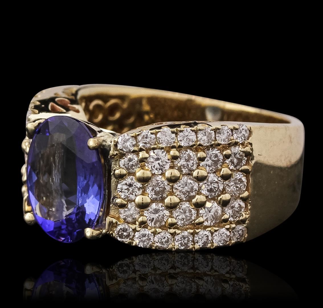 One electronically tested 14KT yellow gold ladies combination cast & assembled tanzanite and diamond ring with a flat shank with a bright polish finish. Identified with markings of "14K". Condition is new. Containing: One prong set oval modified brilliant cut natural tanzanite, measuring 10.41 x 8.28 x 3.83mm, approximate weight of 2.24ct., clarity is eye clean, type I, medium light, moderately strong, bluish violet color, (GIA bV 4/4), cut is good. Fifty-Eight prong set round brilliant cut diamonds, measuring 1.90 - 1.50 x 1.02mm (depth est.) stated total weight of 58 Stones = 1.04ct. Clarity: I-1 to I-2. Color: J - K, Cut is Good. Colored gemstones are presumed to have been subjected to commonly used enhancement processes. All diamonds and colored gemstones are graded in the mounting, unless otherwise stated total weight of Colored Stones 2.24ct. Total Weight of Diamonds 1.04ct. Total Weight of Ring 10.10 grams. GGL Appraised at $8,445.00.