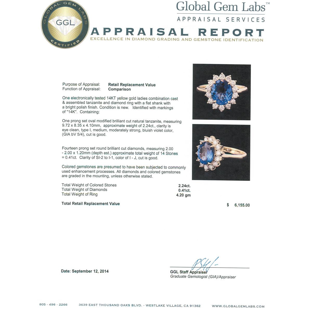 One electronically tested 14KT yellow gold ladies combination cast & assembled tanzanite and diamond ring with a flat shank with a bright polish finish. Identified with markings of "14K". Condition is new. Containing: One prong set oval modified brilliant cut natural tanzanite, measuring 9.72 x 8.35 x 4.10mm, approximate weight of 2.24ct., clarity is eye clean, type I, medium, moderately strong, bluish violet color, (GIA bV 5/4), cut is good. Fourteen prong set round brilliant cut diamonds, measuring 2.00 - 2.00 x 1.20mm (depth est.) approximate total weight of 14 Stones = 0.41ct. Clarity: SI-2 to I-1. Color: I - J, Cut is Good. Colored gemstones are presumed to have been subjected to commonly used enhancement processes. All diamonds and colored gemstones are graded in the mounting, unless otherwise stated total weight of Colored Stones 2.24ct. Total Weight of Diamonds 0.41ct. Total Weight of Ring 4.20 grams. GGL Appraised at $6,155.00.