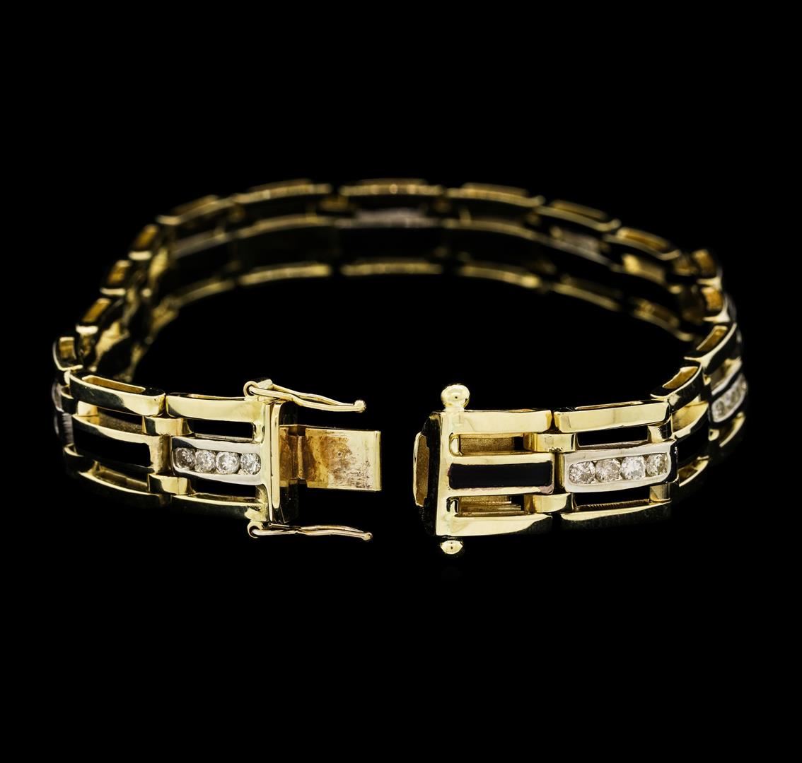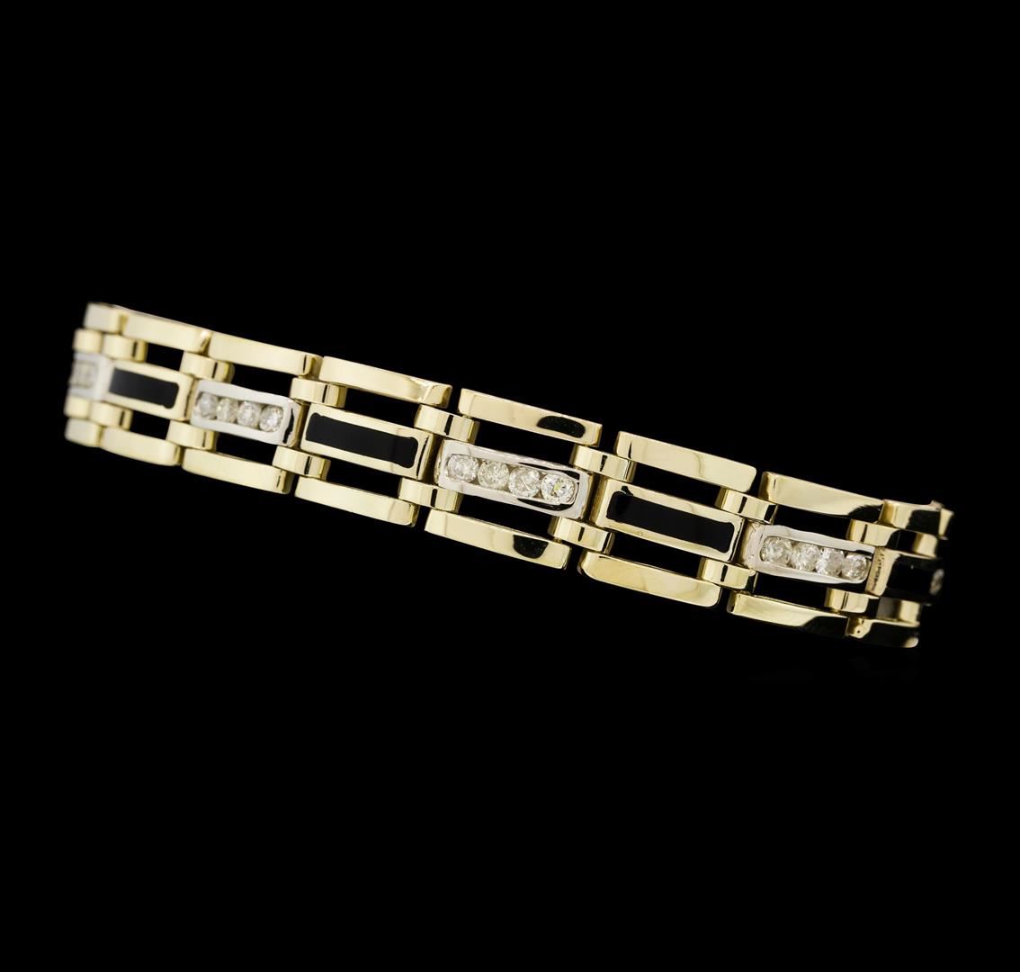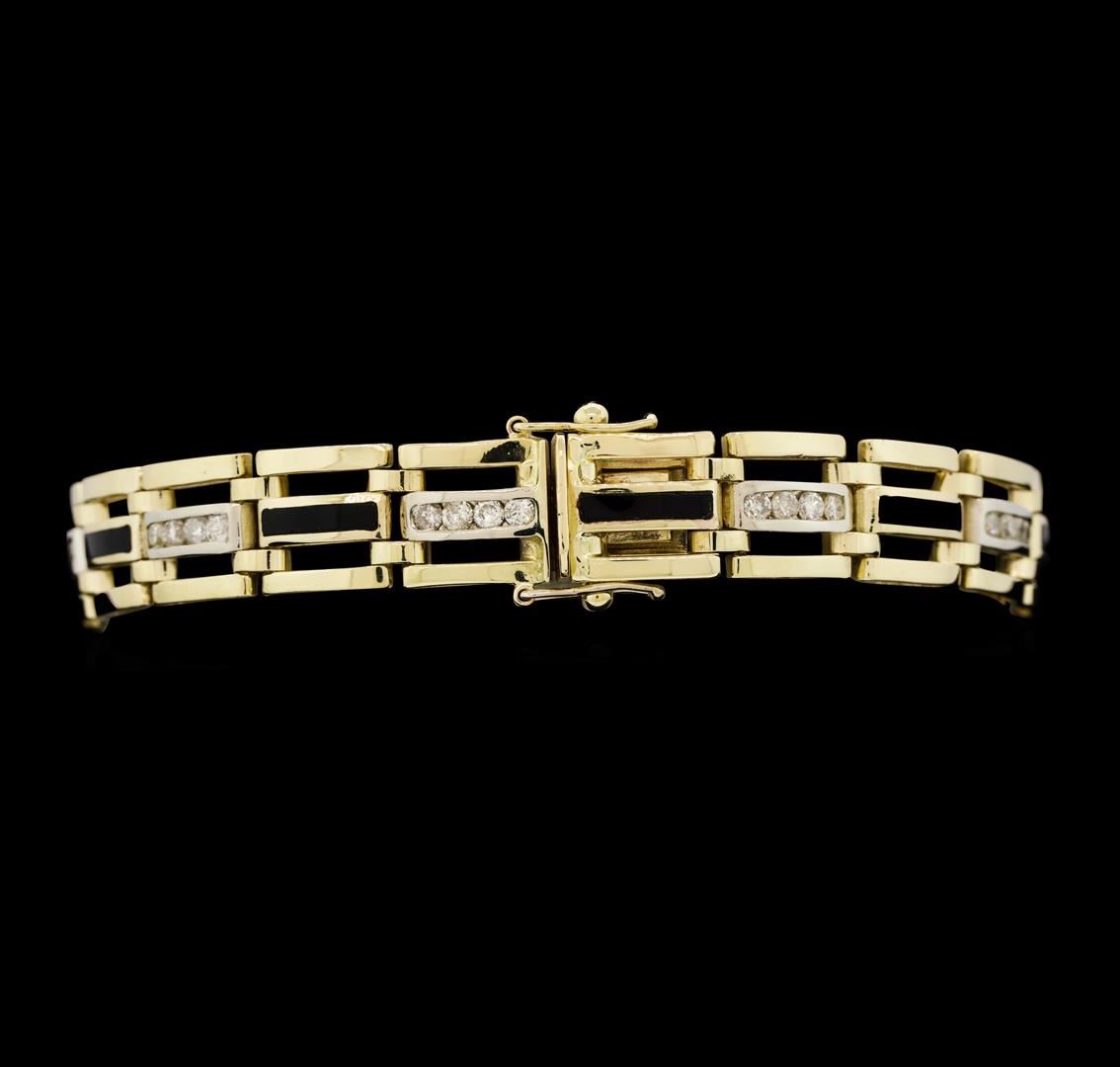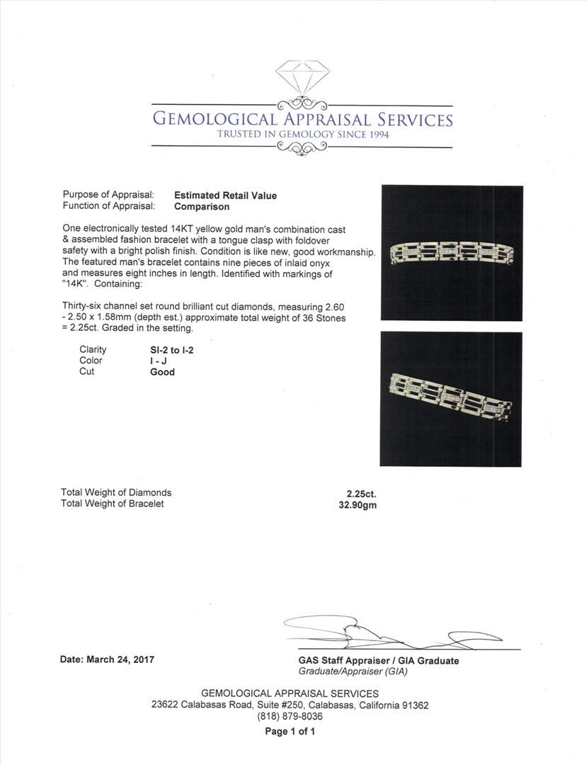 One electronically tested 14KT yellow gold man's combination cast & assembled fashion bracelet with a tongue clasp with foldover safety with a bright polish finish. The featured man's bracelet contains nine pieces of inlaid onyx and measures eight inches in length. Identified with markings of "14K". Condition is like new, good workmanship. Containing: Thirty-Six channel set round brilliant cut diamonds, measuring 2.60 - 2.50 x 1.58mm (depth est.) approximate. Total Weight of 36 Stones = 2.25ct. Graded in the setting. Color I - JClarity SI-2 to I-2 Cut Good. Total Weight of Diamonds 2.25ct.. Total Weight of Bracelet 32.90gm. GAS Appraised.