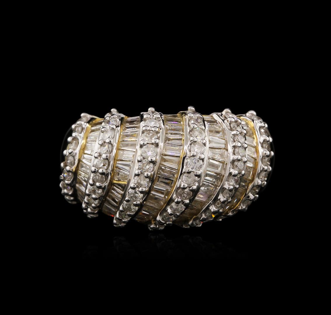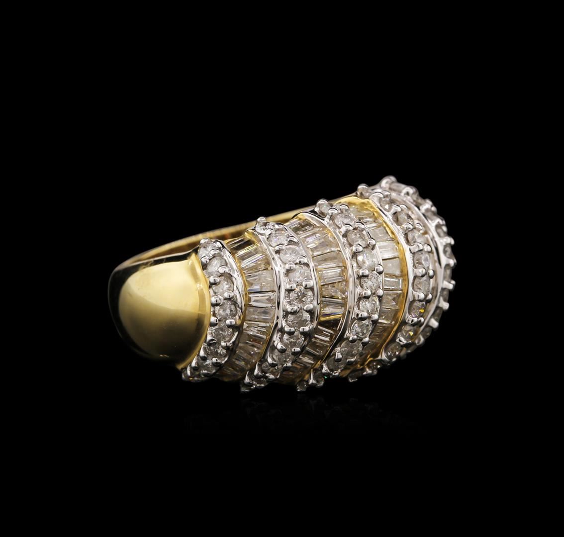 One electronically tested 14KT yellow gold ladies cast diamond ring with a bright polish finish. Identified with markings of "14K". Condition is new. Containing: Seventy-Eight channel set baguette cut diamonds, measuring 2.00. x 1.30 x 1.11mm (depth est.) approximate total weight of 78 Stones = 1.25ct. Clarity: I-1 to I-2. Color: H - I, Cut is Good. Sixty-Two prong set round brilliant cut diamonds, measuring 1.00. - 1.00. x 0.60mm (depth est.) approximate total weight of 62 Stones = 1.00.ct. Clarity: I-1 to I-2. Color: G - H, Cut is Good. Diamonds are graded in the mounting, unless otherwise stated. Total Weight of Diamonds 2.25ct. Total Weight of Ring 8.50 grams. GGL Appraised at $4,005.00.