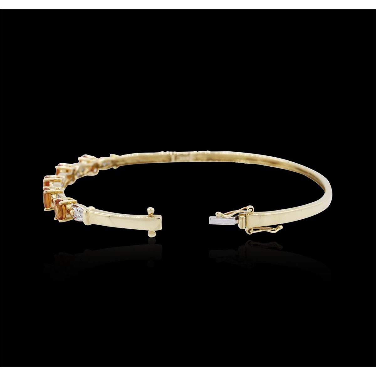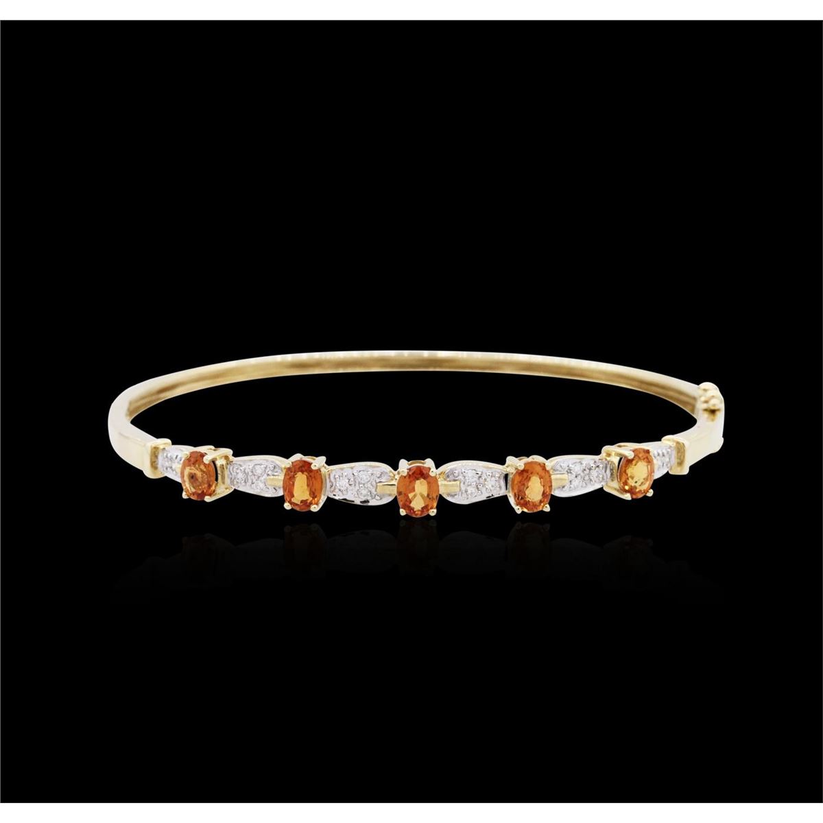One bangle bracelet featuring: 14KT yellow gold weighing 7.33 grams containing five orange sapphires with a total weight of 2.26cts and 16 round cut diamonds with a total weight of 0.14cts.