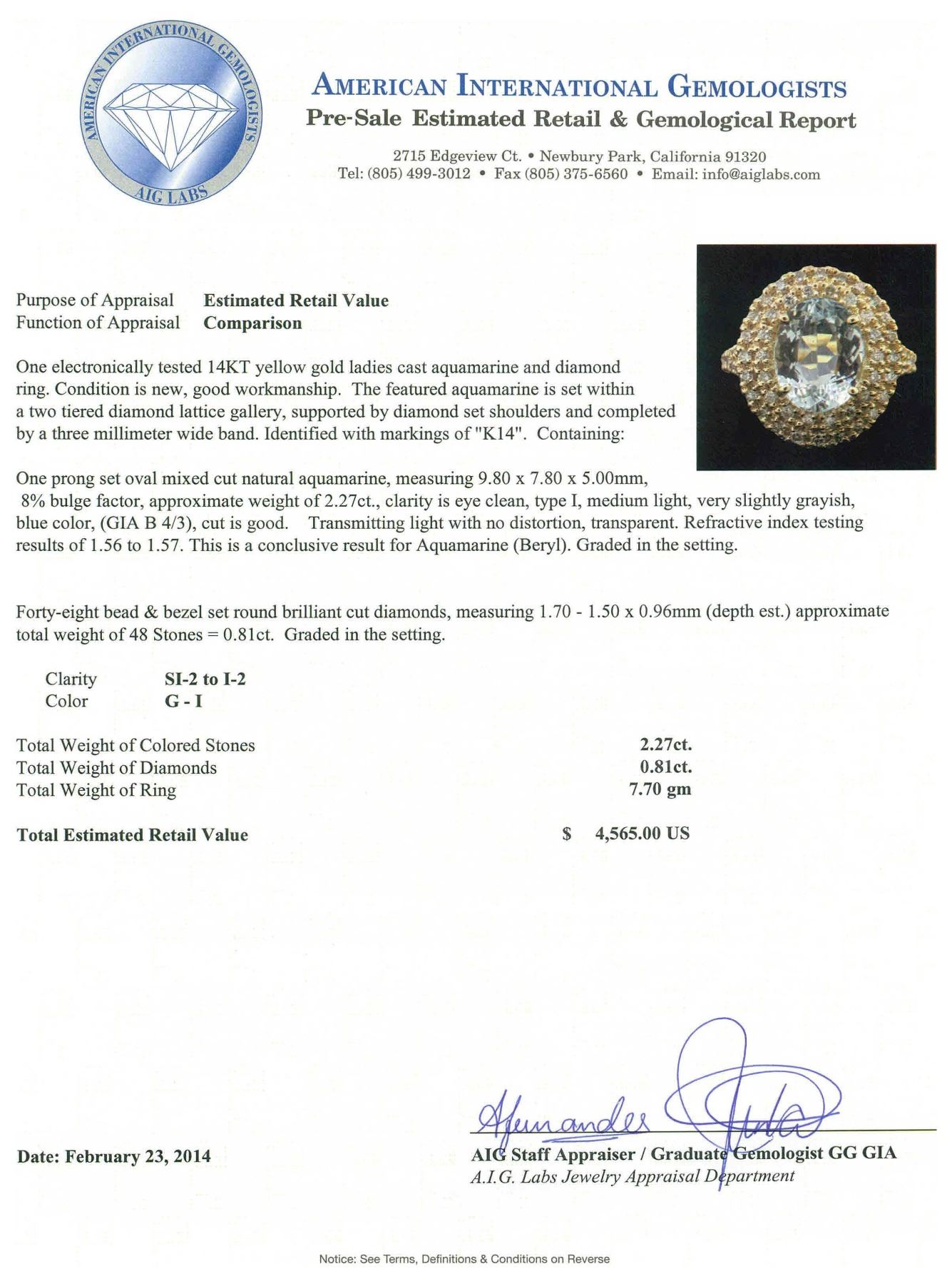 One electronically tested 14KT yellow gold ladies cast aquamarine and diamond ring. Condition is new, good workmanship. The featured aquamarine is set within a two tiered diamond lattice gallery, supported by diamond set shoulders and completed by a three millimeter wide band. Identified with markings of "K14". Containing: One prong set oval mixed cut natural aquamarine, measuring 9.80 x 7.80 x 5.00mm, 8%. bulge factor, approximate weight of 2.27ct., clarity is eye clean, type I, medium light, very slightly grayish, blue color, (GIA B 4/3), cut is good. Transmitting light with no distortion, transparent. Refractive index testing results of 1.56 to 1.57. This is a conclusive result for Aquamarine (Beryl). Graded in the setting. Forty-Eight bead & bezel set round brilliant cut diamonds, measuring 1.70 - 1.50 x 0.96mm (depth est.) approximate. Total Weight of 48 Stones = 0.81ct. Graded in the setting. Clarity: SI-2 to I-2. Color: G - I. Total Weight of Colored Stones 2.27ct. Total Weight of Diamonds 0.81ct. Total Weight of Ring 7.70 grams. AIG Appraised.