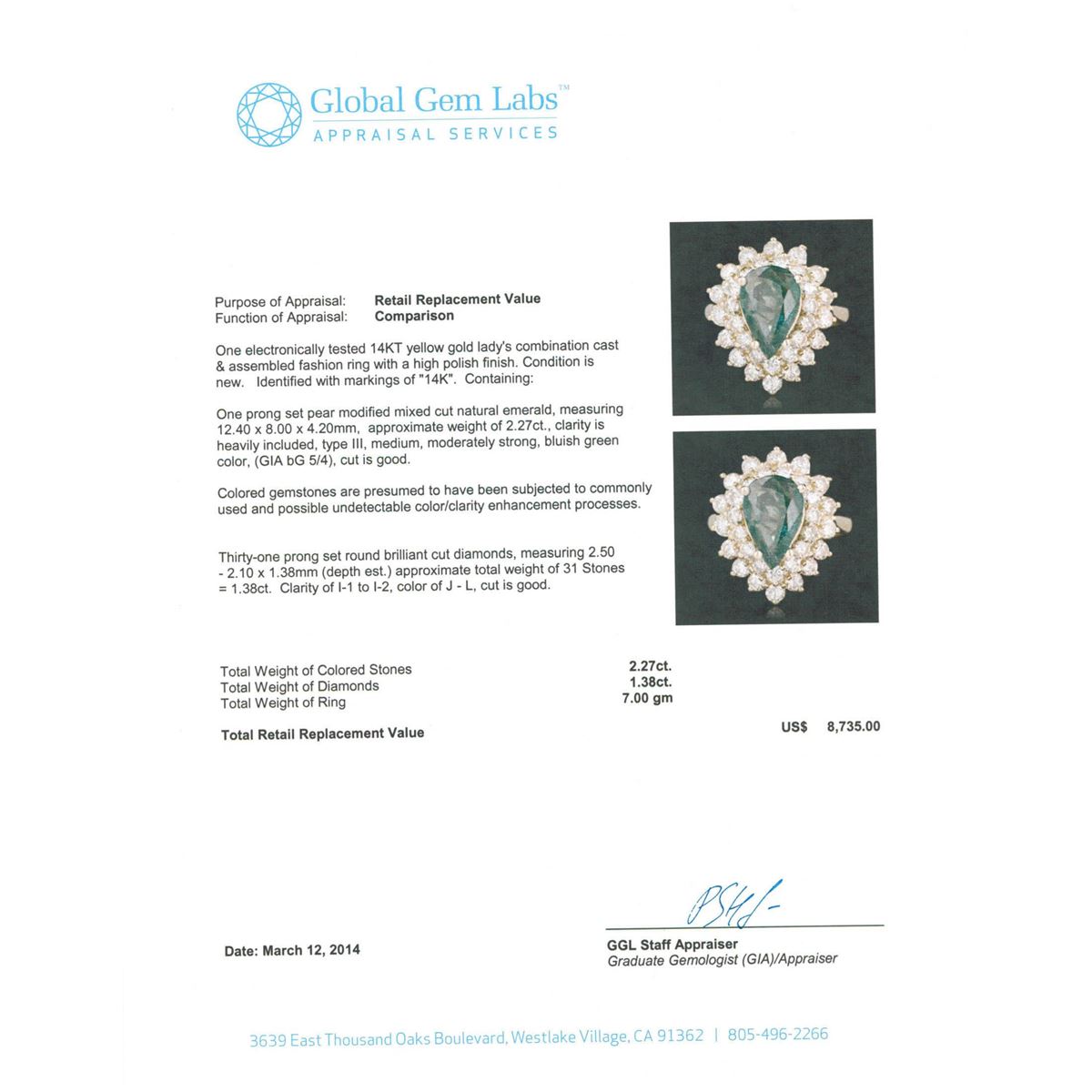 One electronically tested 14KT yellow gold Ladies combination cast & assembled fashion ring with a high polish finish. Condition is new. Identified with markings of "14K". Containing: One prong set pear modified mixed cut natural emerald, measuring 12.40 x 8.00 x 4.20mm, approximate weight of 2.27ct., clarity is heavily included, type III, medium, moderately strong, bluish green color, (GIA bG 5/4), cut is good. Colored gemstones are presumed to have been subjected to commonly used and possible undetectable color/clarity enhancement processes. Thirty-One prong set round brilliant cut diamonds, measuring 2.50 - 2.10 x 1.38mm (depth est.) approximate total weight of 31 Stones = 1.38ct. Clarity of I-1 to I-2, Color of J - L, Cut is Good. Total Weight of Colored Stones 2.27ct. Total Weight of Diamonds 1.38ct. Total Weight of Ring 7.00 grams. GGL Appraised at $8,735.00.
