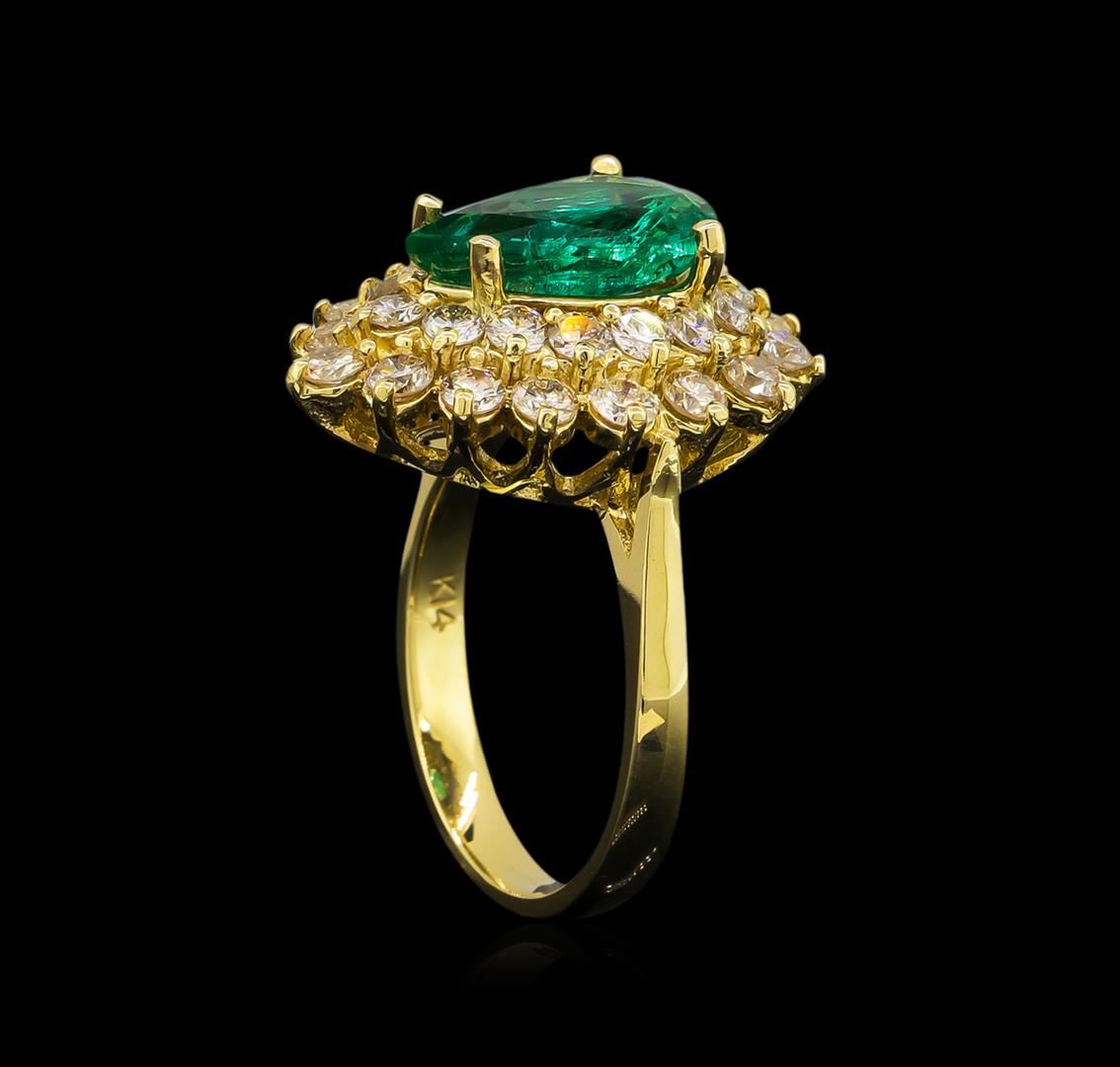 One electronically tested 14KT yellow gold Ladies combination cast & assembled fashion ring with a high polish finish. Condition is new. Identified with markings of "14K". Containing: One prong set pear modified mixed cut natural emerald, measuring 12.40 x 8.00 x 4.20mm, approximate weight of 2.27ct., clarity is heavily included, type III, medium, moderately strong, bluish green color, (GIA bG 5/4), cut is good. Colored gemstones are presumed to have been subjected to commonly used and possible undetectable color/clarity enhancement processes. Thirty-One prong set round brilliant cut diamonds, measuring 2.50 - 2.10 x 1.38mm (depth est.) approximate total weight of 31 Stones = 1.38ct. Clarity of I-1 to I-2, Color of J - L, Cut is Good. Total Weight of Colored Stones 2.27ct. Total Weight of Diamonds 1.38ct. Total Weight of Ring 7.00 grams. GGL Appraised at $8,735.00.