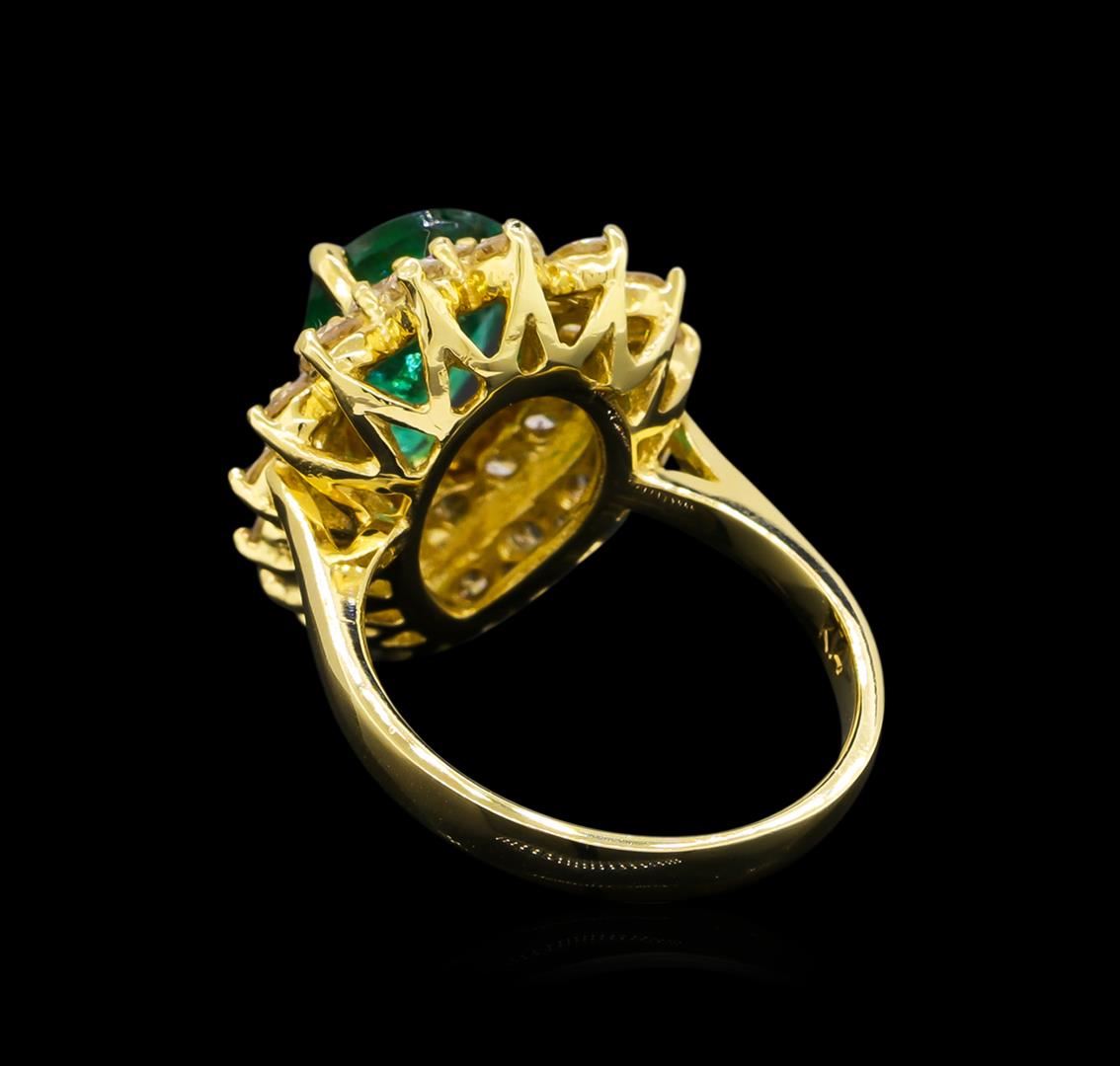 One electronically tested 14KT yellow gold Ladies combination cast & assembled fashion ring with a high polish finish. Condition is new. Identified with markings of "14K". Containing: One prong set pear modified mixed cut natural emerald, measuring 12.40 x 8.00 x 4.20mm, approximate weight of 2.27ct., clarity is heavily included, type III, medium, moderately strong, bluish green color, (GIA bG 5/4), cut is good. Colored gemstones are presumed to have been subjected to commonly used and possible undetectable color/clarity enhancement processes. Thirty-One prong set round brilliant cut diamonds, measuring 2.50 - 2.10 x 1.38mm (depth est.) approximate total weight of 31 Stones = 1.38ct. Clarity of I-1 to I-2, Color of J - L, Cut is Good. Total Weight of Colored Stones 2.27ct. Total Weight of Diamonds 1.38ct. Total Weight of Ring 7.00 grams. GGL Appraised at $8,735.00.
