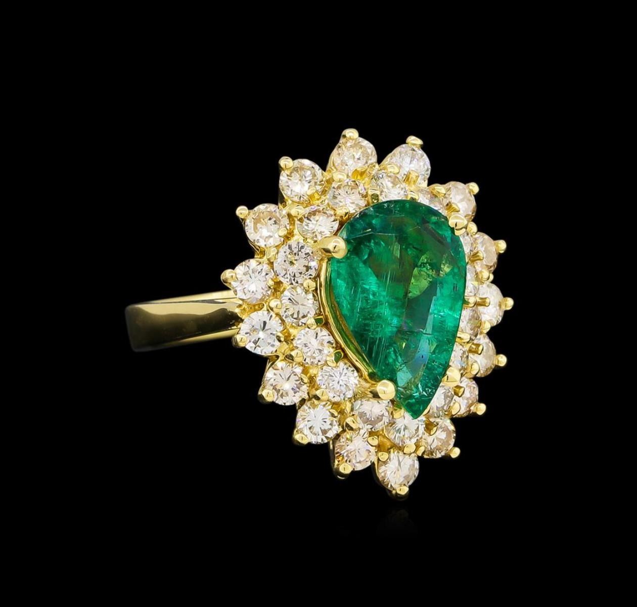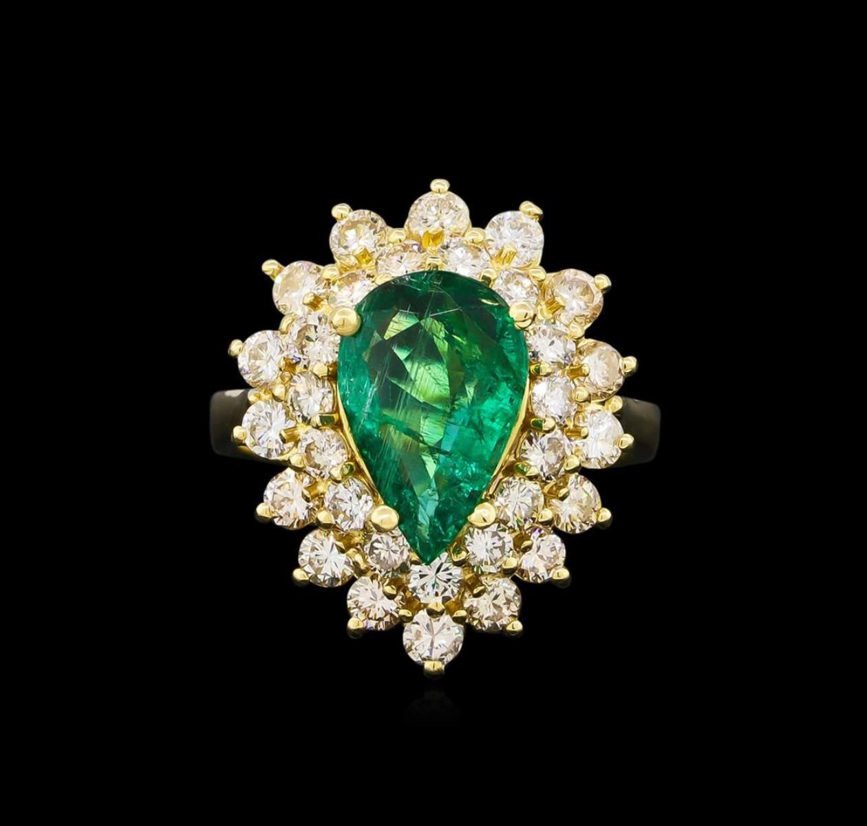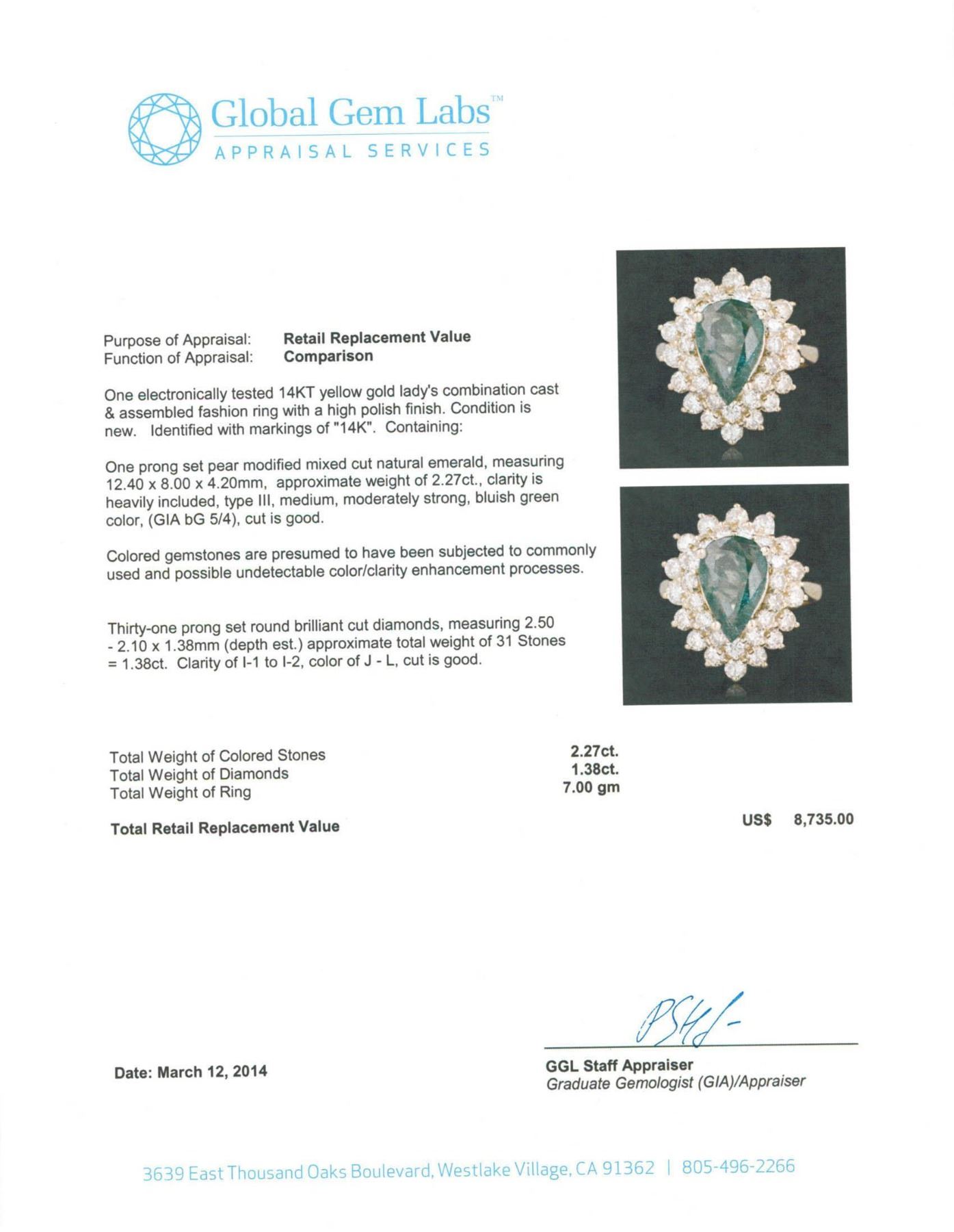 One electronically tested 14KT yellow gold Ladies combination cast & assembled fashion ring with a high polish finish. Condition is new. Identified with markings of "14K". Containing: One prong set pear modified mixed cut natural emerald, measuring 12.40 x 8.00 x 4.20mm, approximate weight of 2.27ct., clarity is heavily included, type III, medium, moderately strong, bluish green color, (GIA bG 5/4), cut is good. Colored gemstones are presumed to have been subjected to commonly used and possible undetectable color/clarity enhancement processes. Thirty-One prong set round brilliant cut diamonds, measuring 2.50 - 2.10 x 1.38mm (depth est.) approximate total weight of 31 Stones = 1.38ct. Clarity of I-1 to I-2, Color of J - L, Cut is Good. Total Weight of Colored Stones 2.27ct. Total Weight of Diamonds 1.38ct. Total Weight of Ring 7.00 grams. GGL Appraised.