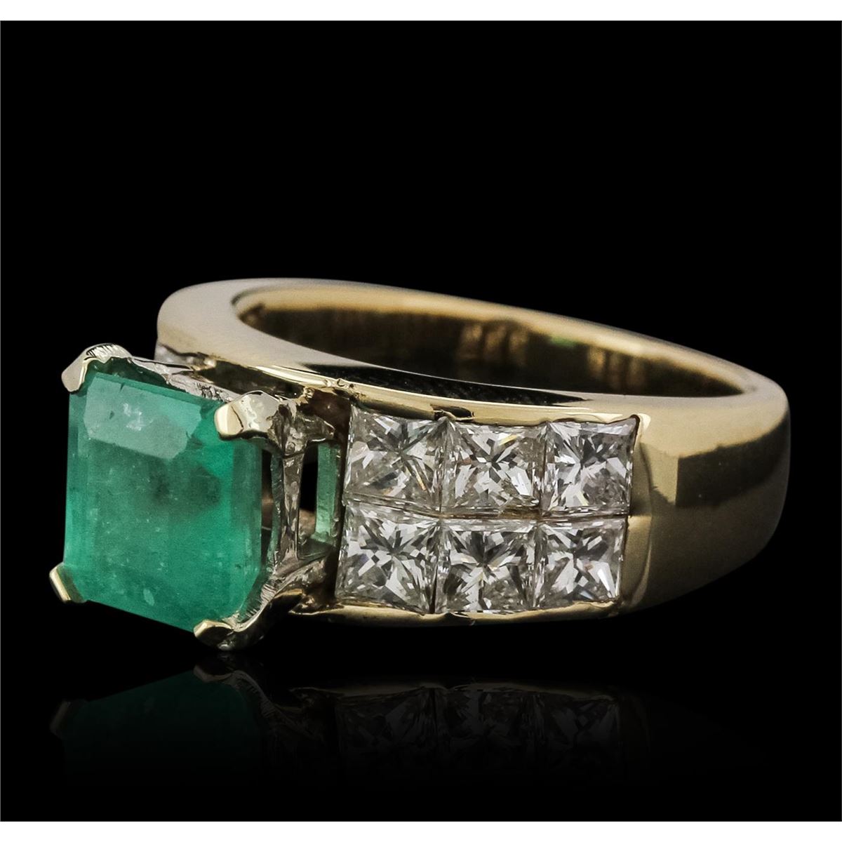 One electronically tested 14KT yellow gold ladies combination cast & assembled emerald and diamond ring with a flat shank with a bright polish finish. Condition is very good. Containing: One prong set emerald standard step cut natural emerald, measuring 7.36 x 7.36 x 5.70mm, approximate weight of 2.27ct., clarity is moderately included, type III, medium light, very slightly grayish, very slightly bluish green color, (GIA vslbG 4/3), cut is good. Twelve invisible set princess cut diamonds, measuring 3.00 x 3.00 x 2.25mm (depth est.) approximate total weight of 12 Stones = 1.99ct. Clarity: SI-1 to SI-2. Color: J, Cut is Good. Colored gemstones are presumed to have been subjected to commonly used enhancement processes. All diamonds and colored gemstones are graded in the mounting, unless otherwise stated. Total Weight of Colored Stones 2.27ct. Total Weight of Diamonds 1.99ct. Total Weight of Ring 7.70 grams. GGL Appraised at $10,690.00.