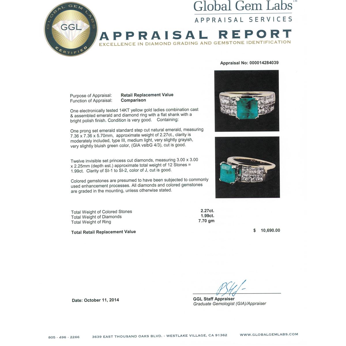 One electronically tested 14KT yellow gold ladies combination cast & assembled emerald and diamond ring with a flat shank with a bright polish finish. Condition is very good. Containing: One prong set emerald standard step cut natural emerald, measuring 7.36 x 7.36 x 5.70mm, approximate weight of 2.27ct., clarity is moderately included, type III, medium light, very slightly grayish, very slightly bluish green color, (GIA vslbG 4/3), cut is good. Twelve invisible set princess cut diamonds, measuring 3.00 x 3.00 x 2.25mm (depth est.) approximate total weight of 12 Stones = 1.99ct. Clarity: SI-1 to SI-2. Color: J, Cut is Good. Colored gemstones are presumed to have been subjected to commonly used enhancement processes. All diamonds and colored gemstones are graded in the mounting, unless otherwise stated. Total Weight of Colored Stones 2.27ct. Total Weight of Diamonds 1.99ct. Total Weight of Ring 7.70 grams. GGL Appraised at $10,690.00.