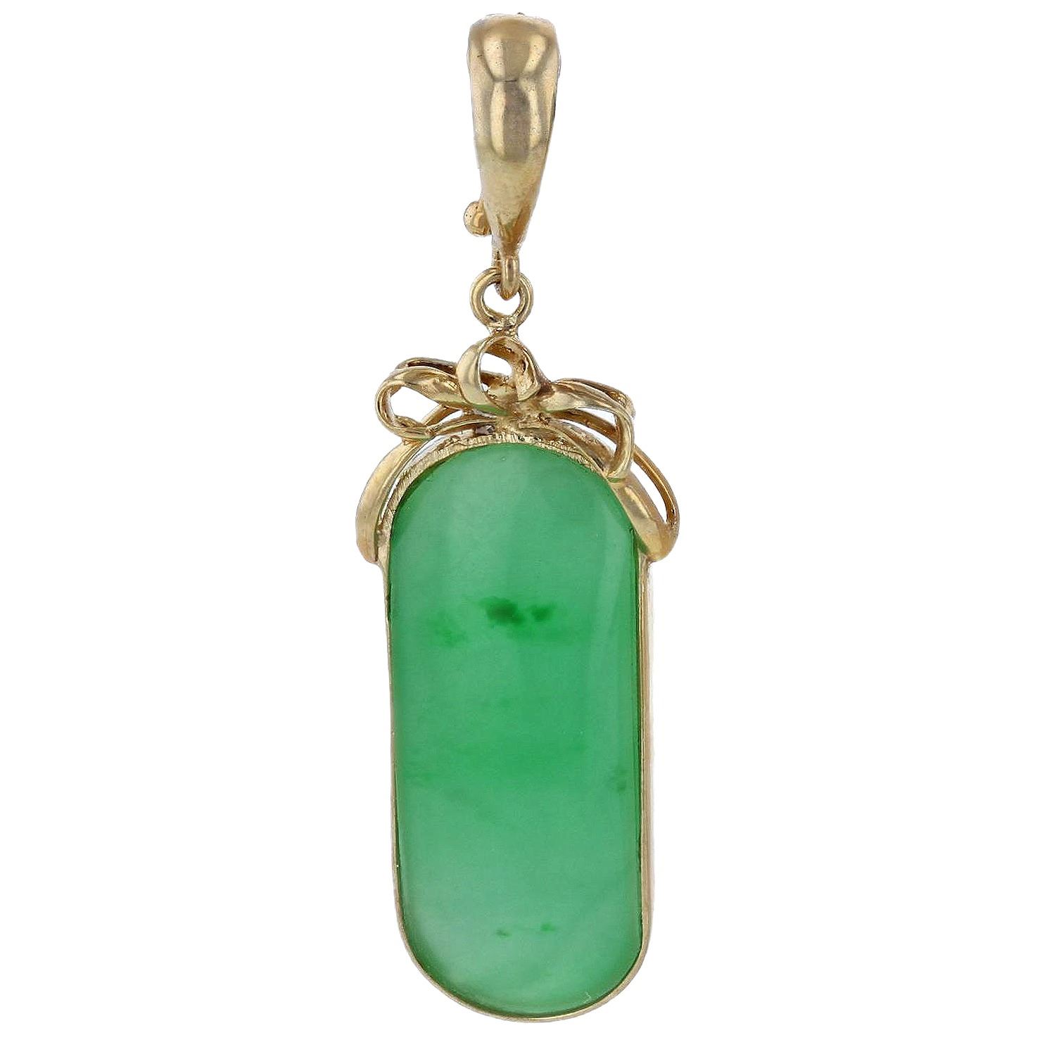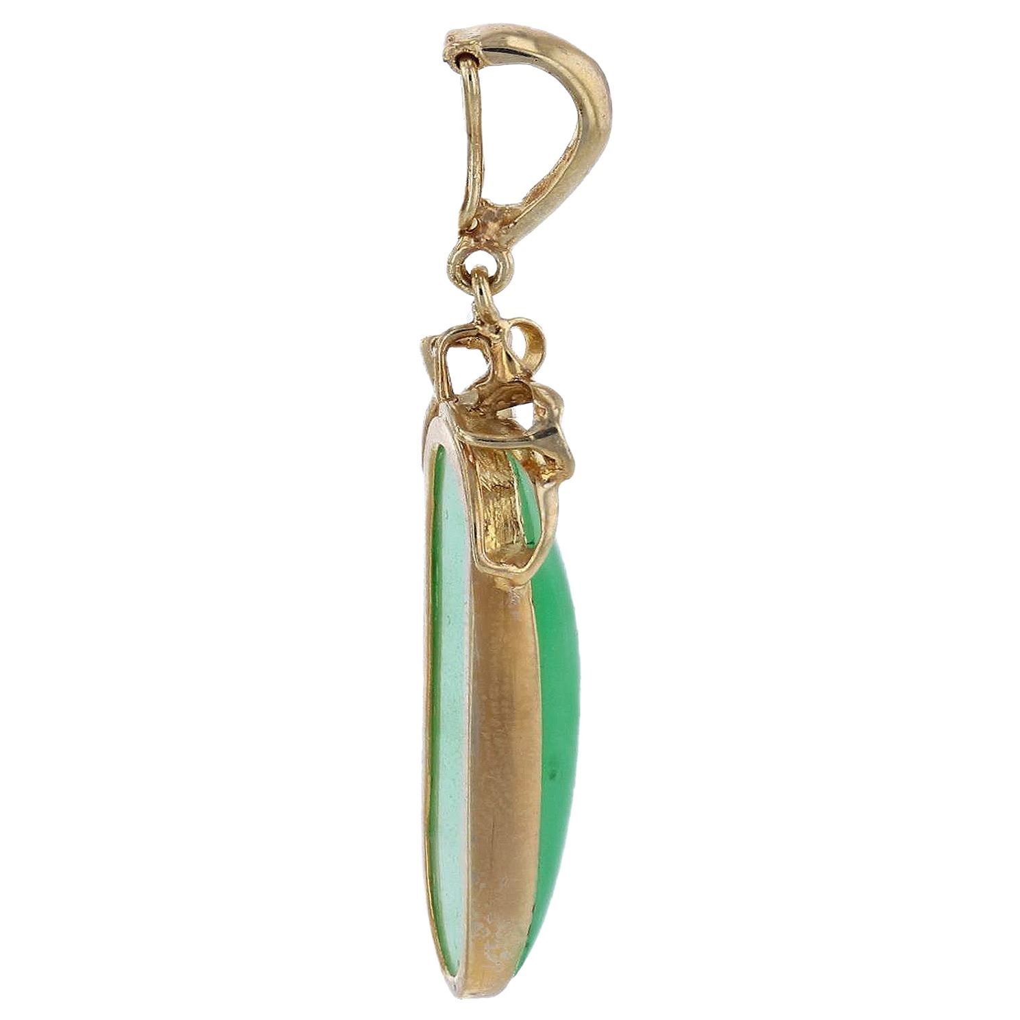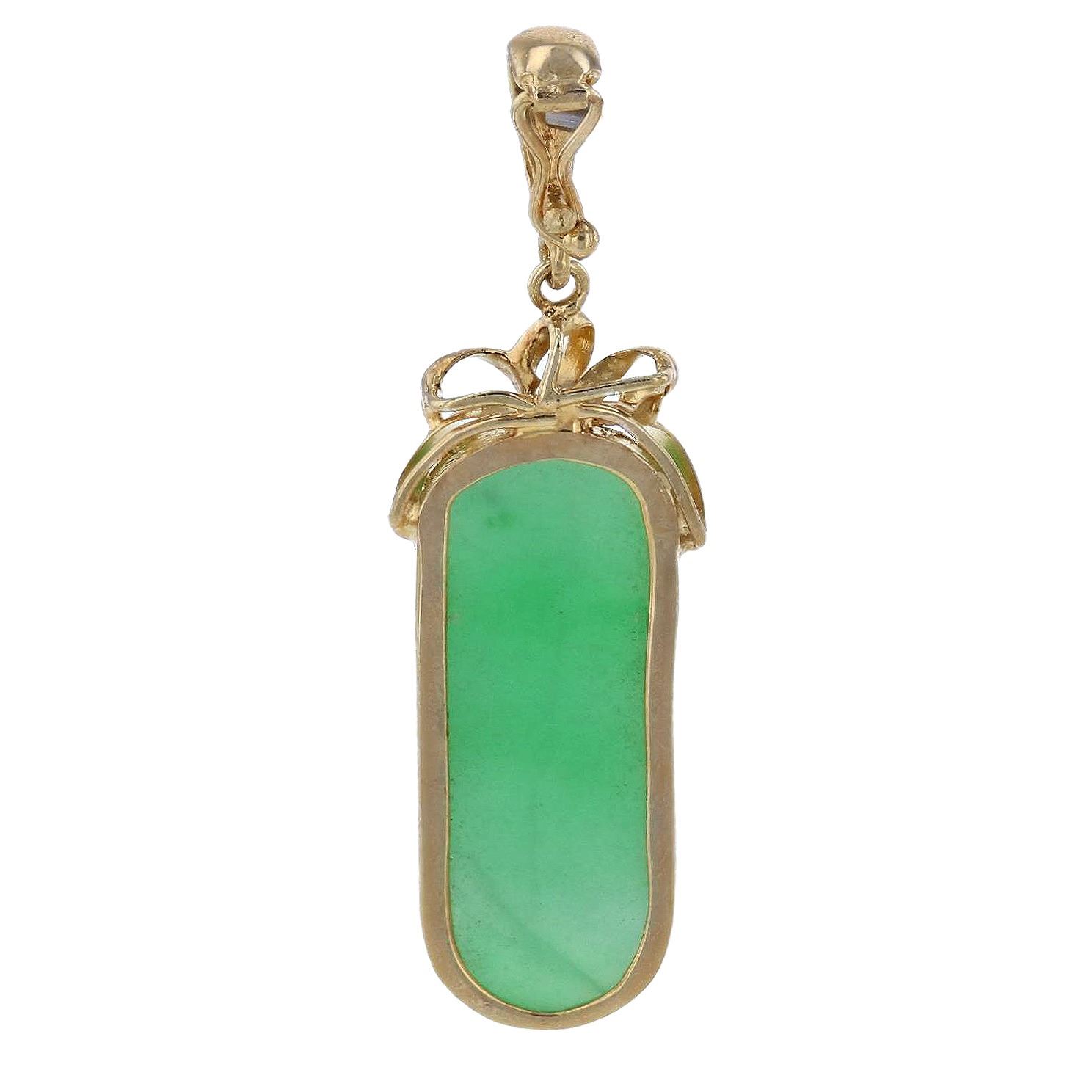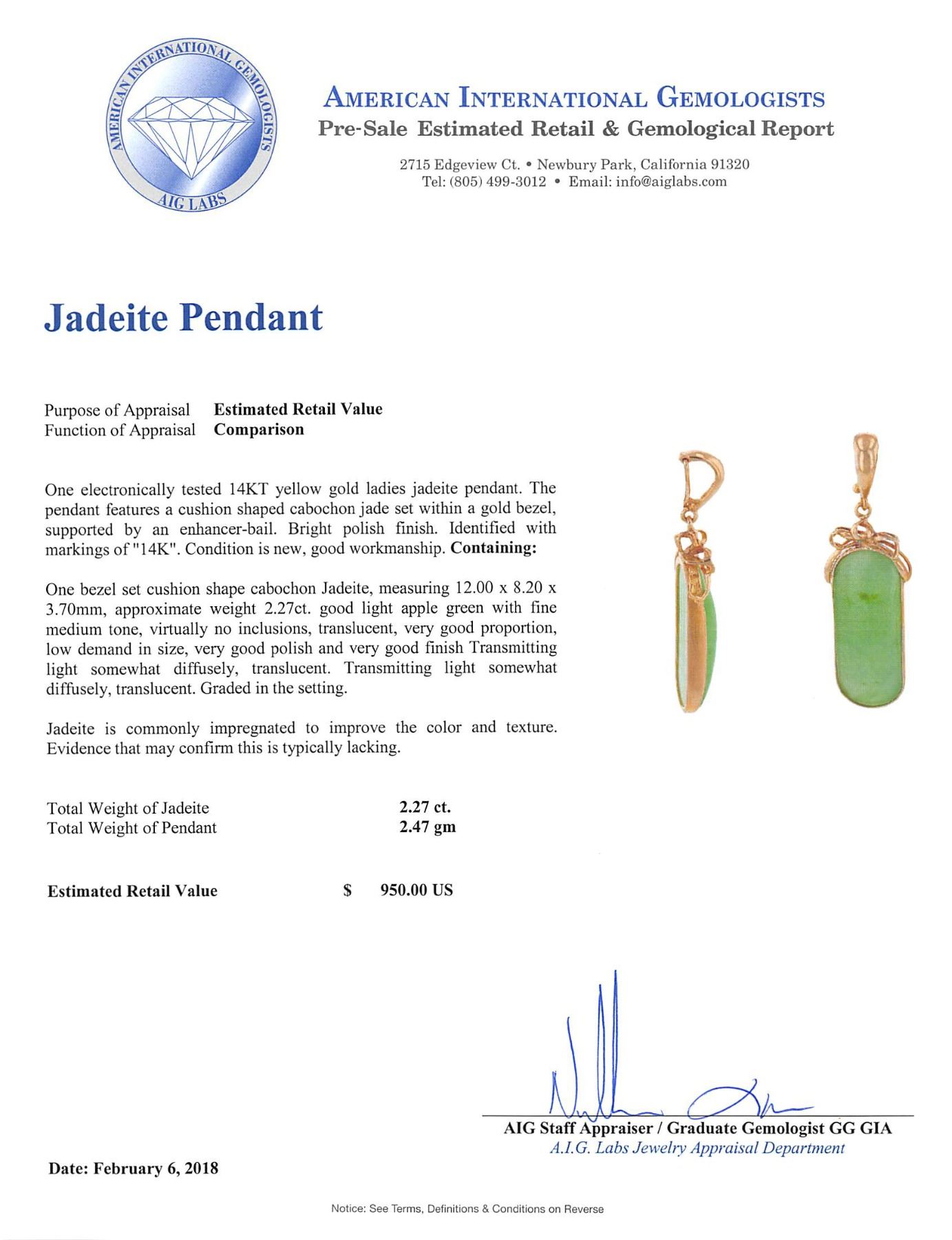 One 14KT Yellow Gold 2.27ctw Jadeite Earrings. One electronically tested 14KT yellow gold ladies cast & assembled jade pendant. The pendant features a cushion shaped cabochon cut jade set within a gold bezel, supported by an enhancer-bail. Bright polish finish. Identified with markings of "14K". Condition is new, good workmanship. Containing: One bezel set cushion shape cabochon Jadeite, measuring (12.00 x 8.20) 3.70mm, approximate weight 2.27ct. good light apple green with fine medium tone, virtually no inclusions, translucent, very good proportion, low demand in size, very good polish and very good finish Transmitting light somewhat diffusely, translucent, Transmitting light somewhat diffusely, translucent. Graded in the setting. A-Jadeite is natural, untreated jadeite, only undergoes a traditional process, including plum juice washing and polishing with bee wax. These procedures are internationally recognized as standard practice and are not defined as "artificial treatments". Total Weight of Jade 2.27 ct. Total Weight of Pendant 2.47 gm.