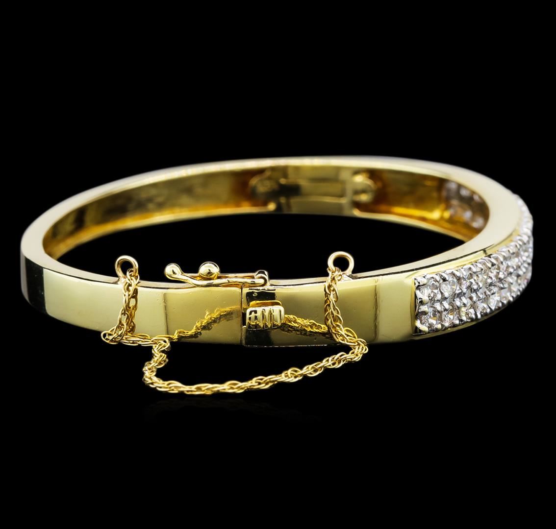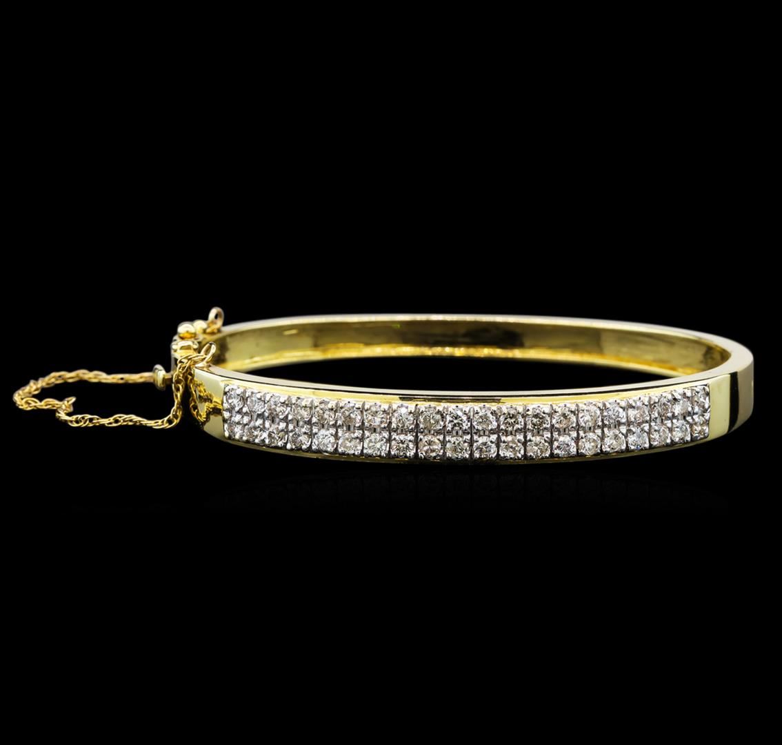 One electronically tested 14KT yellow gold ladies cast diamond bangle bracelet with a hidden box clasp with safety closer with a bright polish finish. Condition is very good. Containing: Forty prong set round brilliant cut diamonds, measuring 2.50 - 2.50 x 1.50mm (depth est.) approximate total weight of 40 Stones = 2.28ct. Clarity: I-1 to I-2. Color: I - J, Cut is Good. All diamonds are graded in the mounting, unless otherwise stated. Total Weight of Diamonds 2.28ct. Total Weight of Bangle Bracelet 23.60 grams. GGL Appraised at $6,270.00.