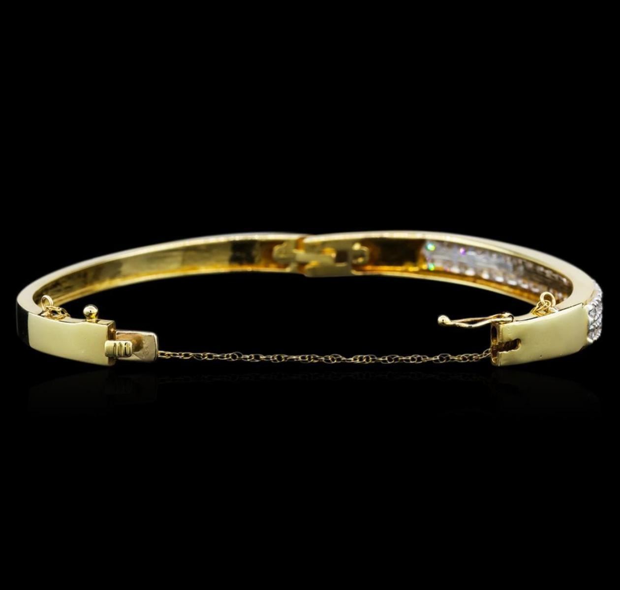 One electronically tested 14KT yellow gold ladies cast diamond bangle bracelet with a hidden box clasp with safety closer with a bright polish finish. Condition is very good. Containing: Forty prong set round brilliant cut diamonds, measuring 2.50 - 2.50 x 1.50mm (depth est.) approximate total weight of 40 Stones = 2.28ct. Clarity: I-1 to I-2. Color: I - J, Cut is Good. All diamonds are graded in the mounting, unless otherwise stated. Total Weight of Diamonds 2.28ct. Total Weight of Bangle Bracelet 23.60 grams. GGL Appraised.
