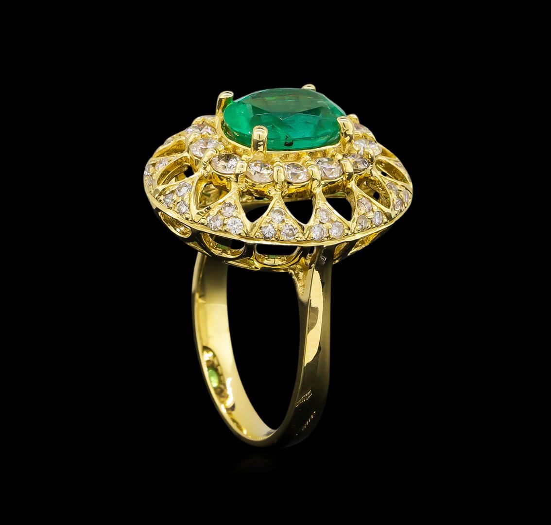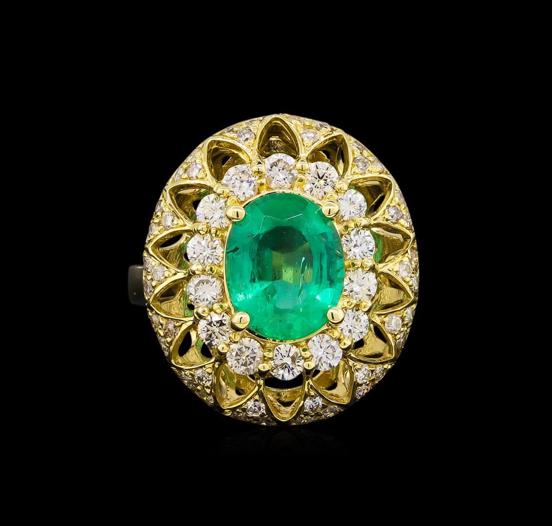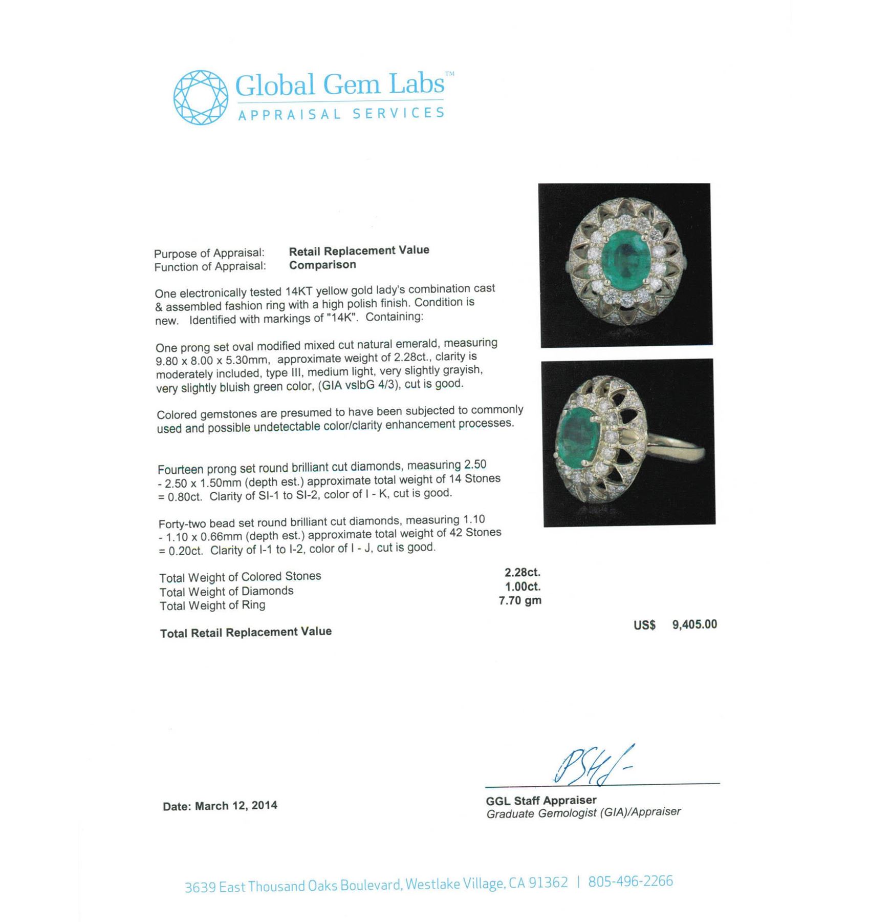 One electronically tested 14KT yellow gold Ladies combination cast & assembled fashion ring with a high polish finish. Condition is new. Identified with markings of "14K". Containing: One prong set oval modified mixed cut natural emerald, measuring 9.80 x 8.00 x 5.30mm, approximate weight of 2.28ct., clarity is moderately included, type III, medium light, very slightly grayish, very slightly bluish green color, (GIA vslbG 4/3), cut is good. Colored gemstones are presumed to have been subjected to commonly used and possible undetectable color/clarity enhancement processes. Fourteen prong set round brilliant cut diamonds, measuring 2.50 - 2.50 x 1.50mm (depth est.) approximate total weight of 14 Stones = 0.80ct. Clarity of SI-1 to SI-2, Color of I - K, Cut is Good. Forty-Two bead set round brilliant cut diamonds, measuring 1.10 - 1.10 x 0.66mm (depth est.) approximate total weight of 42 Stones = 0.20ct. Clarity of I-1 to I-2, Color of I - J, Cut is Good. Total Weight of Colored Stones 2.28ct. Total Weight of Diamonds 1.00ct. Total Weight of Ring 7.70 grams. GGL Appraised at $9,405.00.