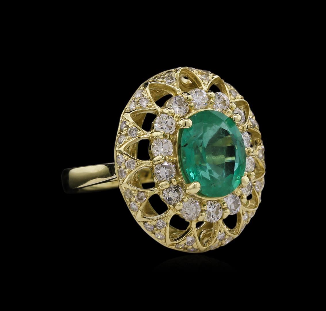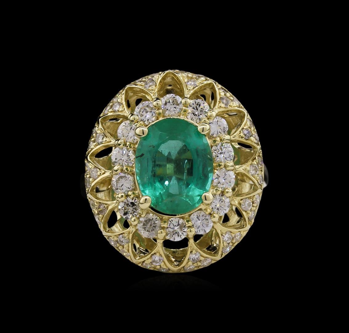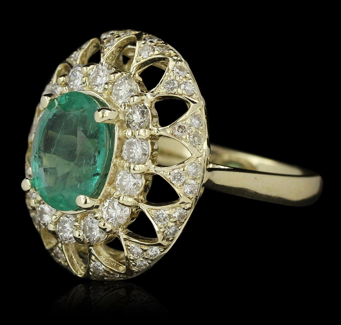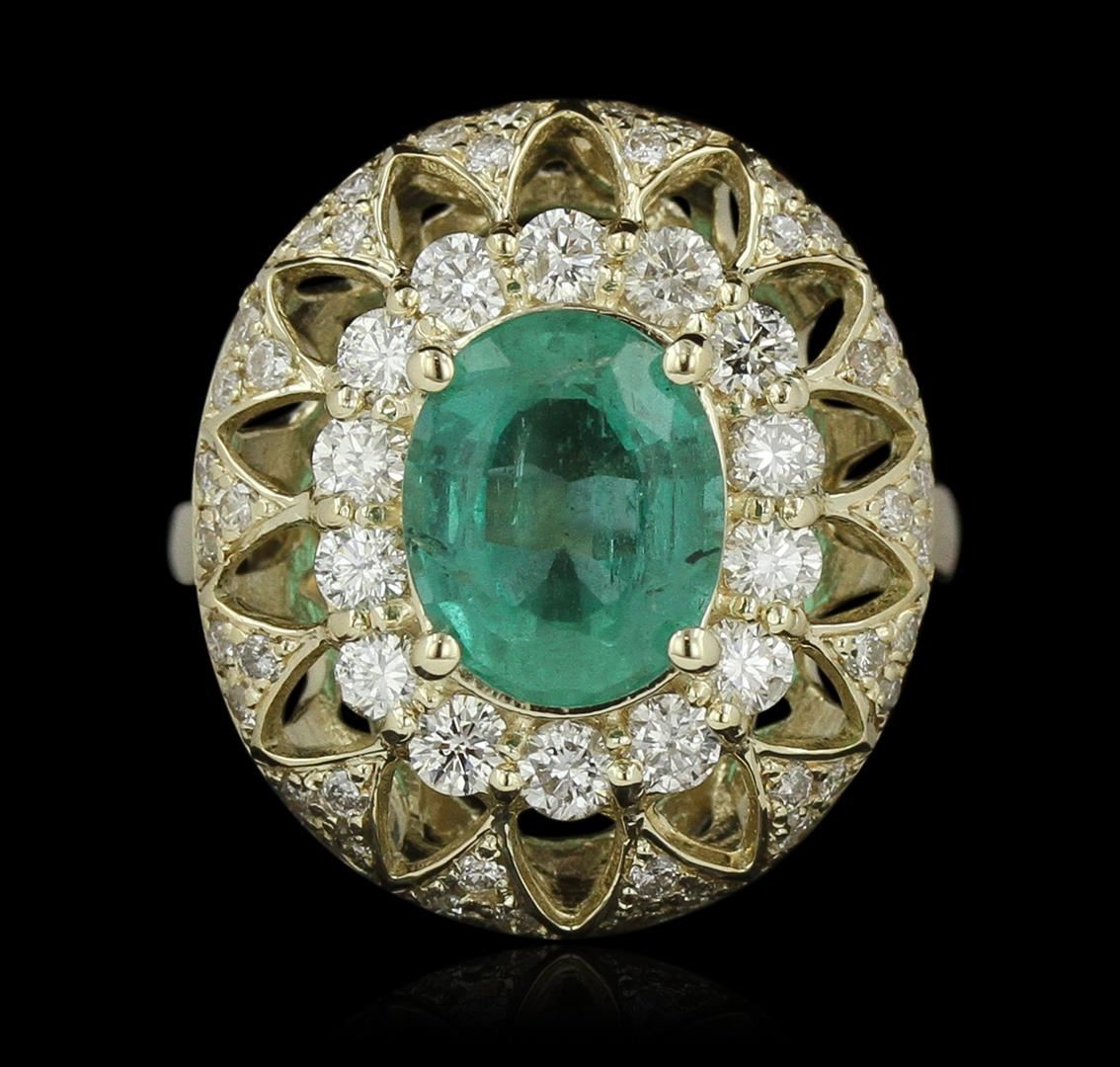 One electronically tested 14KT yellow gold Ladies combination cast & assembled fashion ring with a high polish finish. Condition is new. Identified with markings of "14K". Containing: One prong set oval modified mixed cut natural emerald, measuring 9.80 x 8.00 x 5.30mm, approximate weight of 2.28ct., clarity is moderately included, type III, medium light, very slightly grayish, very slightly bluish green color, (GIA vslbG 4/3), cut is good. Colored gemstones are presumed to have been subjected to commonly used and possible undetectable color/clarity enhancement processes. Fourteen prong set round brilliant cut diamonds, measuring 2.50 - 2.50 x 1.50mm (depth est.) approximate total weight of 14 Stones = 0.80ct. Clarity of SI-1 to SI-2, Color of I - K, Cut is Good. Forty-Two bead set round brilliant cut diamonds, measuring 1.10 - 1.10 x 0.66mm (depth est.) approximate total weight of 42 Stones = 0.20ct. Clarity of I-1 to I-2, Color of I - J, Cut is Good. Total Weight of Colored Stones 2.28ct. Total Weight of Diamonds 1.00ct. Total Weight of Ring 7.70 grams. GGL Appraised at $9,405.00.