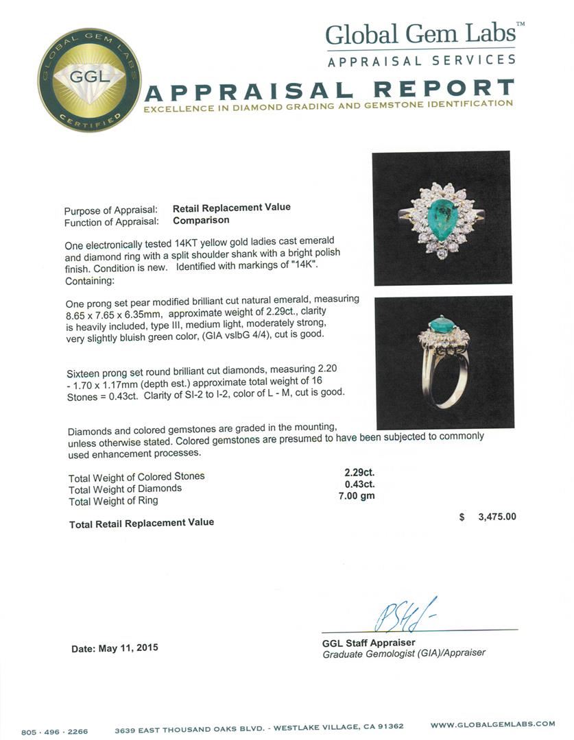 One electronically tested 14KT yellow gold ladies cast emerald and diamond ring with a split shoulder shank with a bright polish finish. Identified with markings of "14K". Condition is new. Containing: One prong set pear modified brilliant cut natural emerald, measuring 8.65 x 7.65 x 6.35mm, approximate weight of 2.29ct., clarity is heavily included, type III, medium light, moderately strong, very slightly bluish green color, (GIA vslbG 4/4), cut is good. Sixteen prong set round brilliant cut diamonds, measuring 2.20 - 1.70 x 1.17mm (depth est.) approximate total weight of 16 Stones = 0.43ct. Clarity: SI-2 to I-2. Color: L - M, Cut is Good. Diamonds and colored gemstones are graded in the mounting, unless otherwise stated. Colored gemstones are presumed to have been subjected to commonly used enhancement processes. Total Weight of Colored Stones 2.29ct. Total Weight of Diamonds 0.43ct. Total Weight of Ring 7.00 grams. GGL Appraised at $3,475.00.