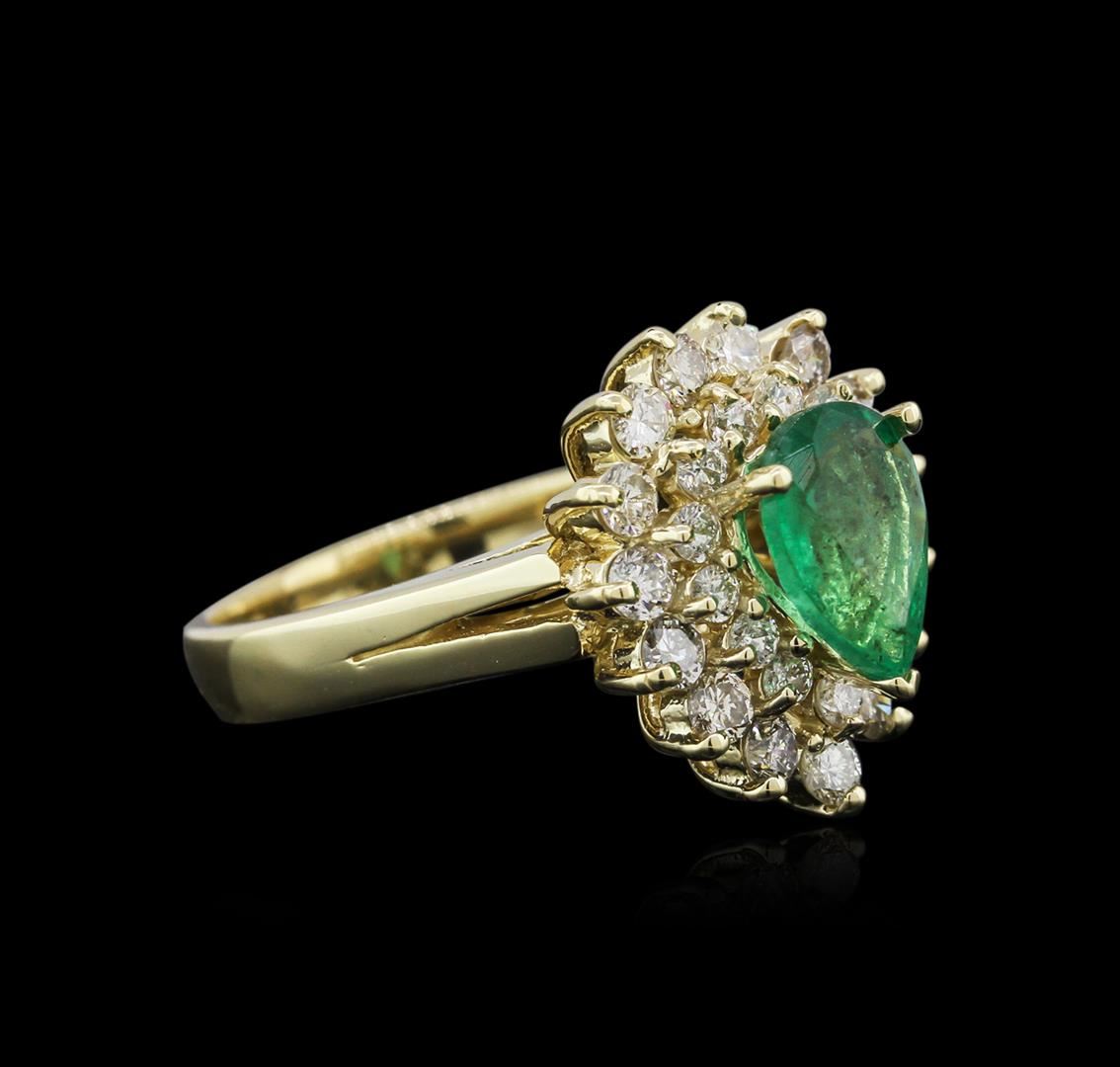 One electronically tested 14KT yellow gold ladies cast emerald and diamond ring with a split shoulder shank with a bright polish finish. Identified with markings of "14K". Condition is new. Containing: One prong set pear modified brilliant cut natural emerald, measuring 8.65 x 7.65 x 6.35mm, approximate weight of 2.29ct., clarity is heavily included, type III, medium light, moderately strong, very slightly bluish green color, (GIA vslbG 4/4), cut is good. Sixteen prong set round brilliant cut diamonds, measuring 2.20 - 1.70 x 1.17mm (depth est.) approximate total weight of 16 Stones = 0.43ct. Clarity: SI-2 to I-2. Color: L - M, Cut is Good. Diamonds and colored gemstones are graded in the mounting, unless otherwise stated. Colored gemstones are presumed to have been subjected to commonly used enhancement processes. Total Weight of Colored Stones 2.29ct. Total Weight of Diamonds 0.43ct. Total Weight of Ring 7.00 grams. GGL Appraised at $3,475.00.