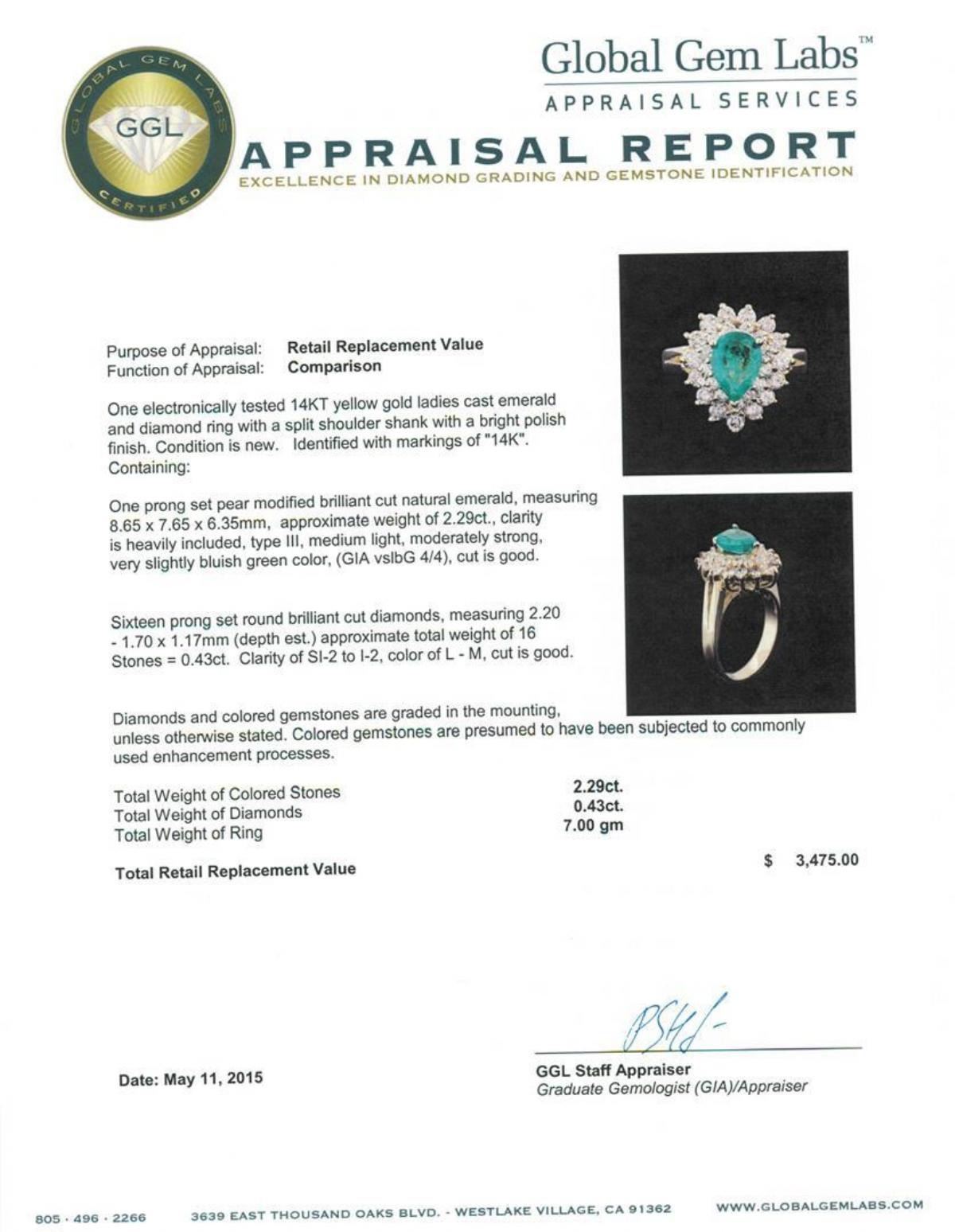One electronically tested 14KT yellow gold ladies cast emerald and diamond ring with a split shoulder shank with a bright polish finish. Identified with markings of "14K". Condition is new. Containing: One prong set pear modified brilliant cut natural emerald, measuring 8.65 x 7.65 x 6.35mm, approximate weight of 2.29ct., clarity is heavily included, type III, medium light, moderately strong, very slightly bluish green color, (GIA vslbG 4/4), cut is good. Sixteen prong set round brilliant cut diamonds, measuring 2.20 - 1.70 x 1.17mm (depth est.) approximate total weight of 16 Stones = 0.43ct. Clarity: SI-2 to I-2. Color: L - M, Cut is Good. Diamonds and colored gemstones are graded in the mounting, unless otherwise stated. Colored gemstones are presumed to have been subjected to commonly used enhancement processes. Total Weight of Colored Stones 2.29ct. Total Weight of Diamonds 0.43ct. Total Weight of Ring 7.00 grams. GGL Appraised.
