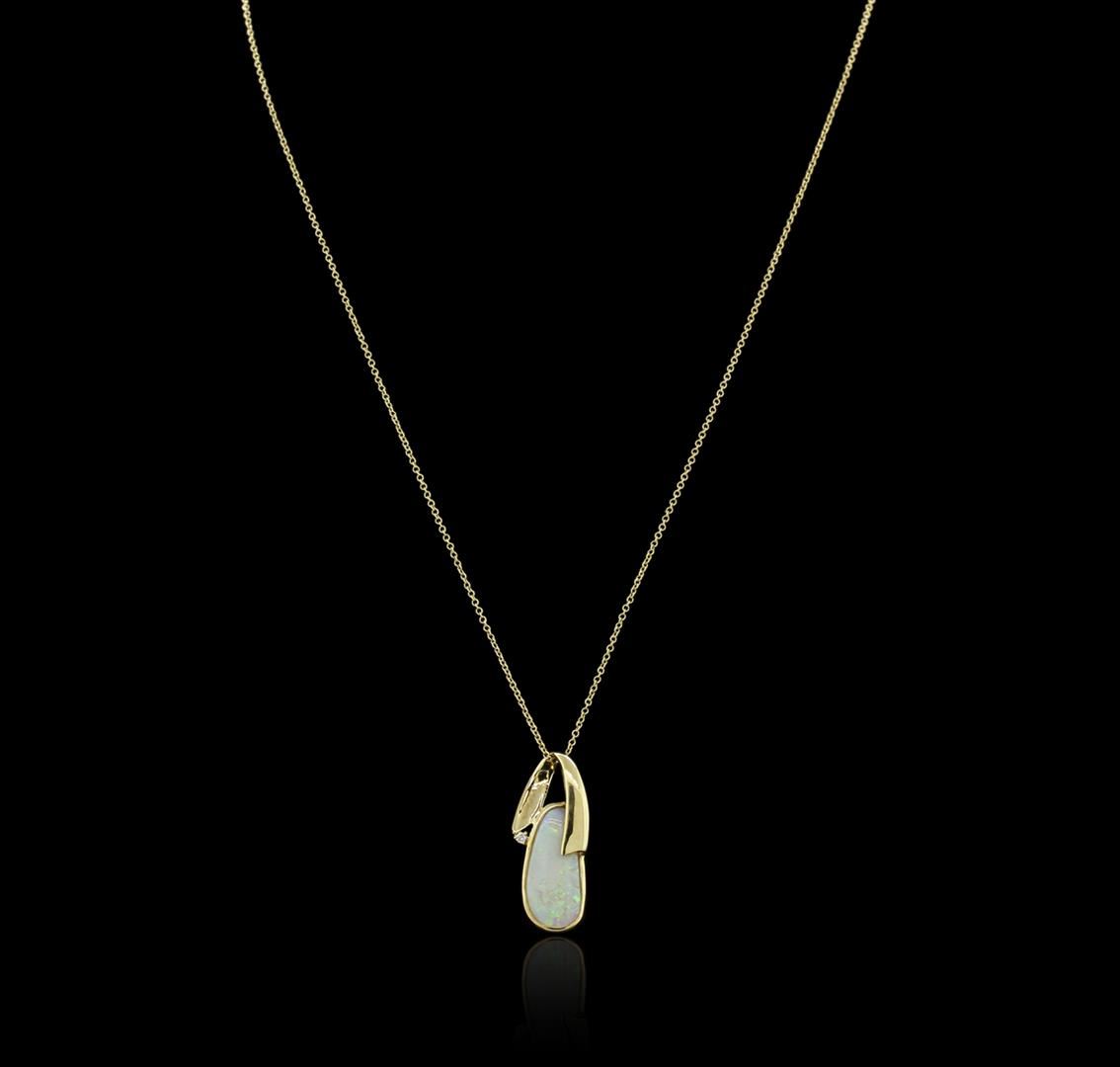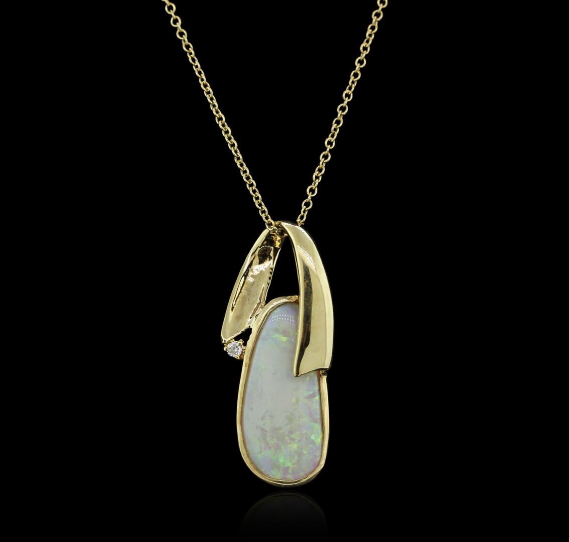 One pendant with chain featuring: 14KT yellow gold weighing 2.30 grams containing one opal center stone with a total weight of 2.31ct and one diamond with a total weight of 0.02ct.