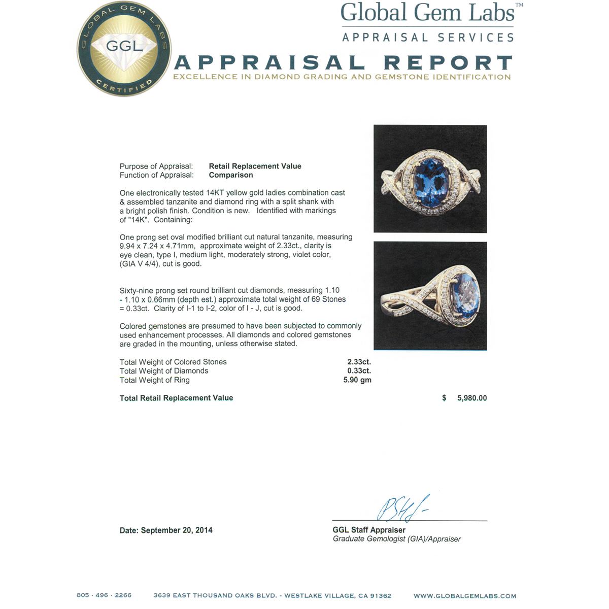 One electronically tested 14KT yellow gold ladies combination cast & assembled tanzanite and diamond ring with a split shank with a bright polish finish. Identified with markings of "14K". Condition is new. Containing: One prong set oval modified brilliant cut natural tanzanite, measuring 9.94 x 7.24 x 4.71mm, approximate weight of 2.33ct., clarity is eye clean, type I, medium light, moderately strong, violet color, (GIA V 4/4), cut is good. Sixty-Nine prong set round brilliant cut diamonds, measuring 1.10 - 1.10 x 0.66mm (depth est.) approximate total weight of 69 Stones = 0.33ct. Clarity: I-1 to I-2. Color: I - J, Cut is Good. Colored gemstones are presumed to have been subjected to commonly used enhancement processes. All diamonds and colored gemstones are graded in the mounting, unless otherwise stated. Total Weight of Colored Stones 2.33ct. Total Weight of Diamonds 0.33ct. Total Weight of Ring 5.90 grams. GGL Appraised at $5,980.00.