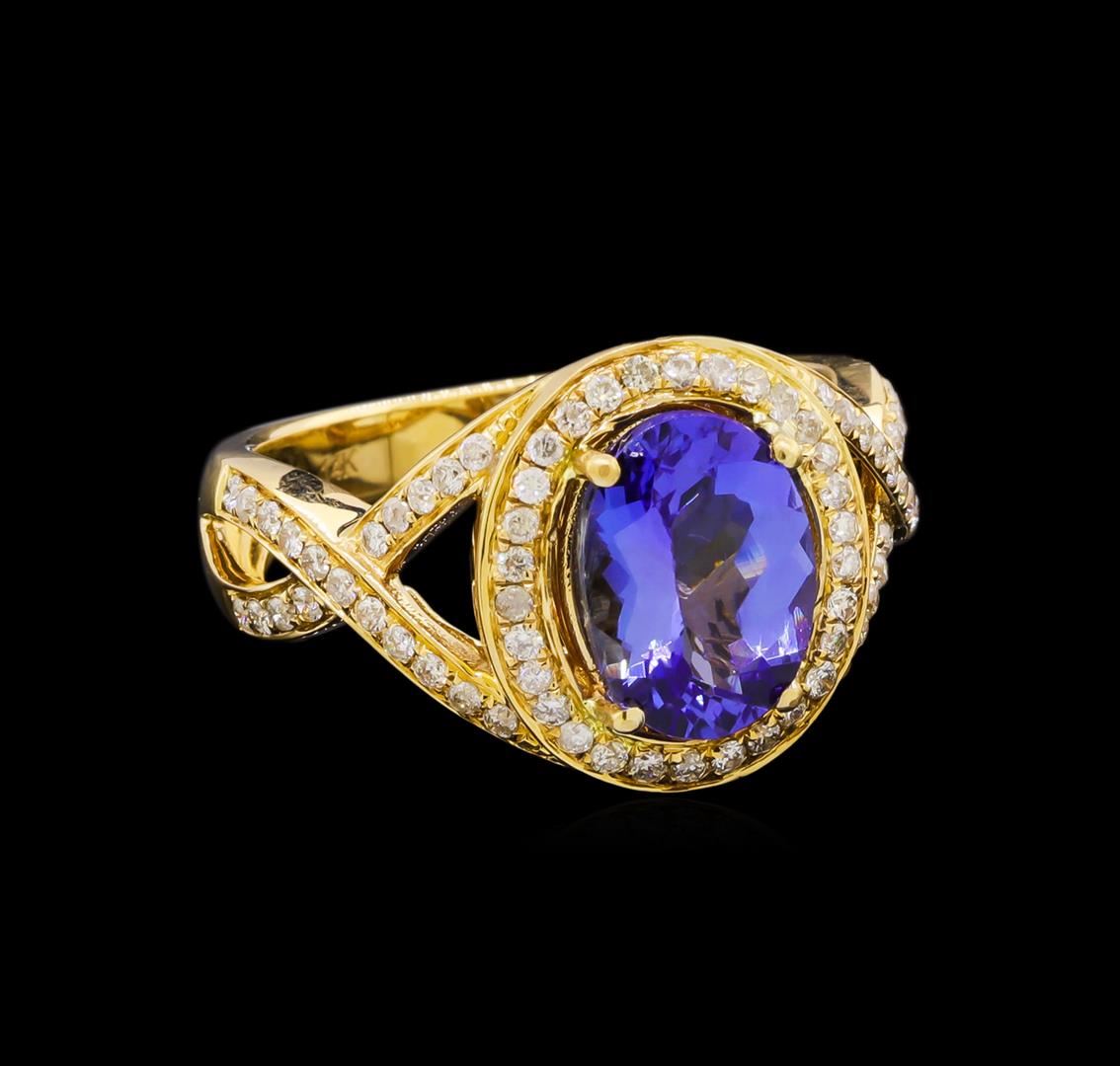 One electronically tested 14KT yellow gold ladies combination cast & assembled tanzanite and diamond ring with a split shank with a bright polish finish. Identified with markings of "14K". Condition is new. Containing: One prong set oval modified brilliant cut natural tanzanite, measuring 9.94 x 7.24 x 4.71mm, approximate weight of 2.33ct., clarity is eye clean, type I, medium light, moderately strong, violet color, (GIA V 4/4), cut is good. Sixty-Nine prong set round brilliant cut diamonds, measuring 1.10 - 1.10 x 0.66mm (depth est.) approximate total weight of 69 Stones = 0.33ct. Clarity: I-1 to I-2. Color: I - J, Cut is Good. Colored gemstones are presumed to have been subjected to commonly used enhancement processes. All diamonds and colored gemstones are graded in the mounting, unless otherwise stated. Total Weight of Colored Stones 2.33ct. Total Weight of Diamonds 0.33ct. Total Weight of Ring 5.90 grams. GGL Appraised at $5,980.00.