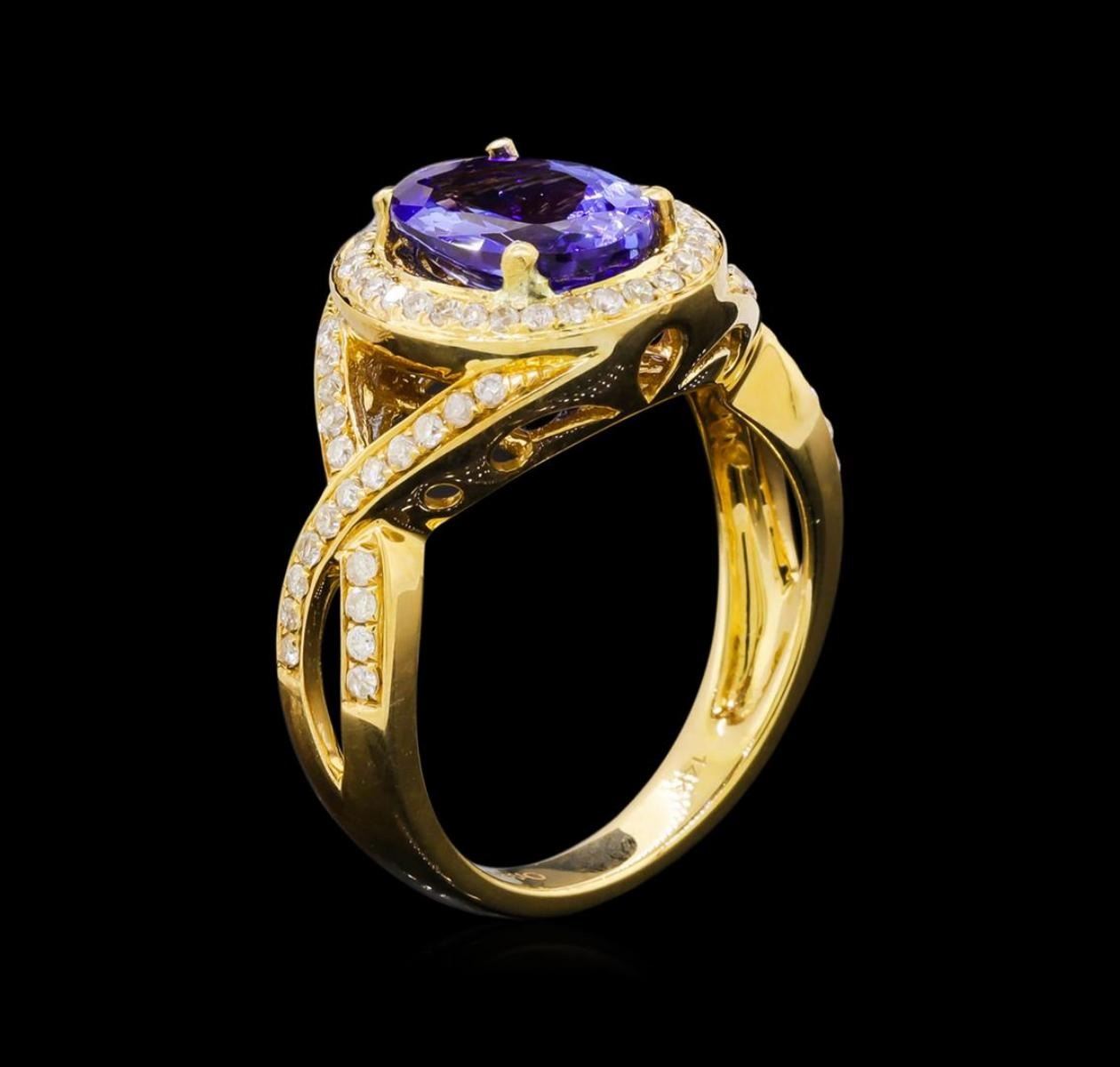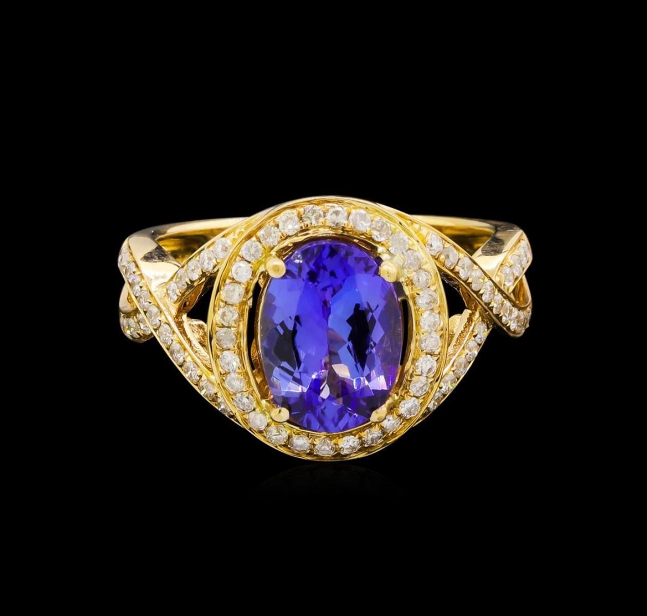One electronically tested 14KT yellow gold ladies combination cast & assembled tanzanite and diamond ring with a split shank with a bright polish finish. Identified with markings of "14K". Condition is new. Containing: One prong set oval modified brilliant cut natural tanzanite, measuring 9.94 x 7.24 x 4.71mm, approximate weight of 2.33ct., clarity is eye clean, type I, medium light, moderately strong, violet color, (GIA V 4/4), cut is good. Sixty-Nine prong set round brilliant cut diamonds, measuring 1.10 - 1.10 x 0.66mm (depth est.) approximate total weight of 69 Stones = 0.33ct. Clarity: I-1 to I-2. Color: I - J, Cut is Good. Colored gemstones are presumed to have been subjected to commonly used enhancement processes. All diamonds and colored gemstones are graded in the mounting, unless otherwise stated. Total Weight of Colored Stones 2.33ct. Total Weight of Diamonds 0.33ct. Total Weight of Ring 5.90 grams. GGL Appraised.