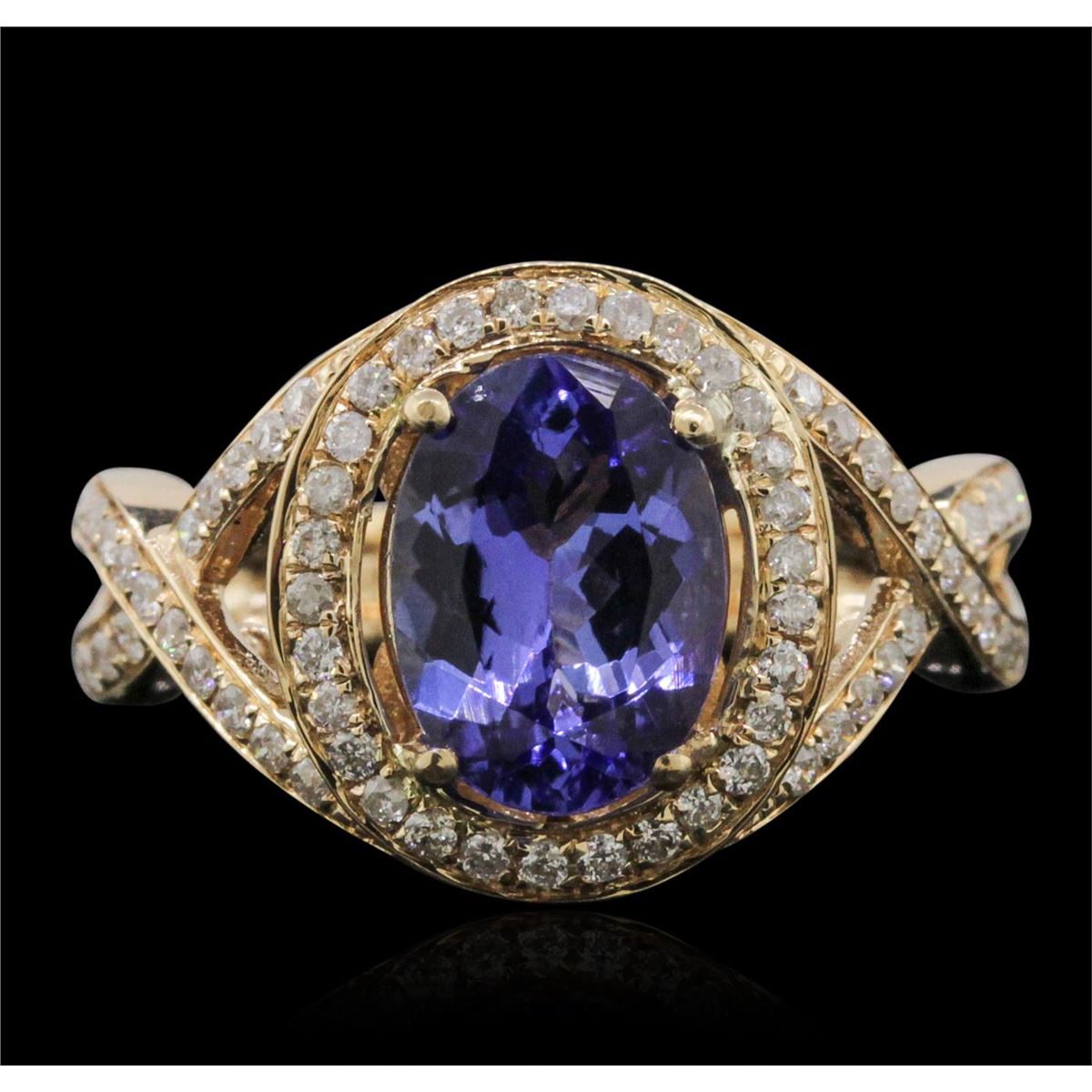 One electronically tested 14KT yellow gold ladies combination cast & assembled tanzanite and diamond ring with a split shank with a bright polish finish. Identified with markings of "14K". Condition is new. Containing: One prong set oval modified brilliant cut natural tanzanite, measuring 9.94 x 7.24 x 4.71mm, approximate weight of 2.33ct., clarity is eye clean, type I, medium light, moderately strong, violet color, (GIA V 4/4), cut is good. Sixty-Nine prong set round brilliant cut diamonds, measuring 1.10 - 1.10 x 0.66mm (depth est.) approximate total weight of 69 Stones = 0.33ct. Clarity: I-1 to I-2. Color: I - J, Cut is Good. Colored gemstones are presumed to have been subjected to commonly used enhancement processes. All diamonds and colored gemstones are graded in the mounting, unless otherwise stated. Total Weight of Colored Stones 2.33ct. Total Weight of Diamonds 0.33ct. Total Weight of Ring 5.90 grams. GGL Appraised at $5,980.00.