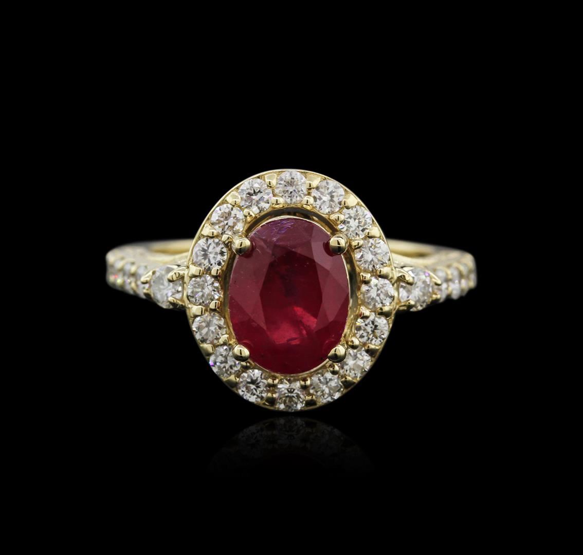One electronically tested 14KT yellow gold ladies cast ruby and diamond ring with a half round shank with a bright polish finish. Identified with markings of "K14". Condition is new. Containing: One prong set oval modified brilliant cut natural ruby, measuring 8.87 x 6.76 x 4.33mm, exact weight 2.35ct., clarity is moderately included, type II, medium, very slightly brownish, strongly purplish red color, (GIA stpR 5/3), cut is good. Seventy-Four prong set round brilliant cut diamonds, measuring 1.70 - 1.70 x 1.02mm (depth est.) approximate total weight of 74 Stones = 1.07ct. Clarity: SI-1 to I-1. Color: I - J, Cut is Good. All diamonds and colored gemstones are graded in the mounting, unless otherwise stated. Colored gemstones are presumed to have been subjected to commonly used enhancement processes.. Total Weight of Colored Stones 2.35ct. Total Weight of Diamonds 1.07ct. Total Weight of Ring 5.20 grams. GGL Appraised at $3,590.00.