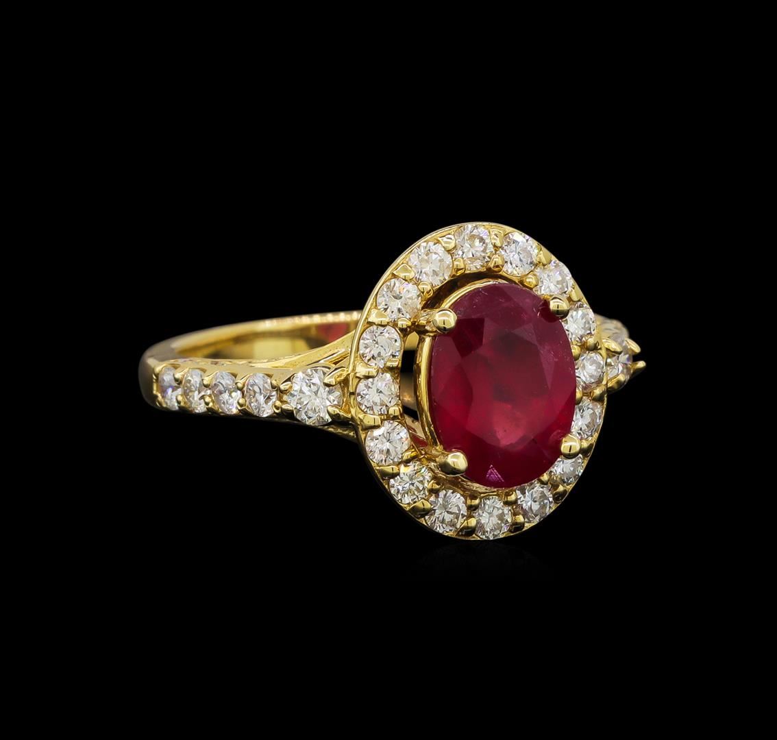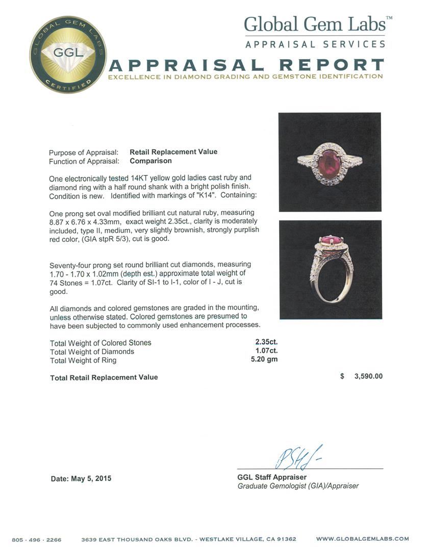 One electronically tested 14KT yellow gold ladies cast ruby and diamond ring with a half round shank with a bright polish finish. Identified with markings of "K14". Condition is new. Containing: One prong set oval modified brilliant cut natural ruby, measuring 8.87 x 6.76 x 4.33mm, exact weight 2.35ct., clarity is moderately included, type II, medium, very slightly brownish, strongly purplish red color, (GIA stpR 5/3), cut is good. Seventy-Four prong set round brilliant cut diamonds, measuring 1.70 - 1.70 x 1.02mm (depth est.) approximate total weight of 74 Stones = 1.07ct. Clarity: SI-1 to I-1. Color: I - J, Cut is Good. All diamonds and colored gemstones are graded in the mounting, unless otherwise stated. Colored gemstones are presumed to have been subjected to commonly used enhancement processes.. Total Weight of Colored Stones 2.35ct. Total Weight of Diamonds 1.07ct. Total Weight of Ring 5.20 grams. GGL Appraised at $3,590.00.