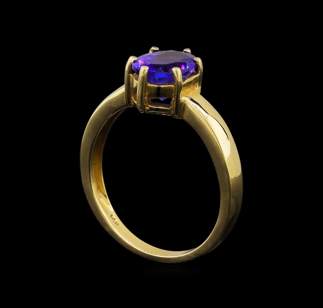 One electronically tested 14KT yellow gold ladies cast tanzanite ring with a bright polish finish. Identified with markings of "14K". Condition is new. Containing: One prong set oval modified brilliant cut natural tanzanite, measuring 9.30 x 6.90 x 5.20mm, approximate weight of 2.35ct., clarity is eye clean, type I, medium, moderately strong, blue color, (GIA B 5/4), cut is good. Colored gemstones are presumed to have been subjected to commonly used enhancement processes. All colored gemstones are graded in the mounting, unless otherwise stated. Total Weight of Colored Stones 2.35ct. Total Weight of Ring 3.80 grams. GGL Appraised at $1,640.00.
