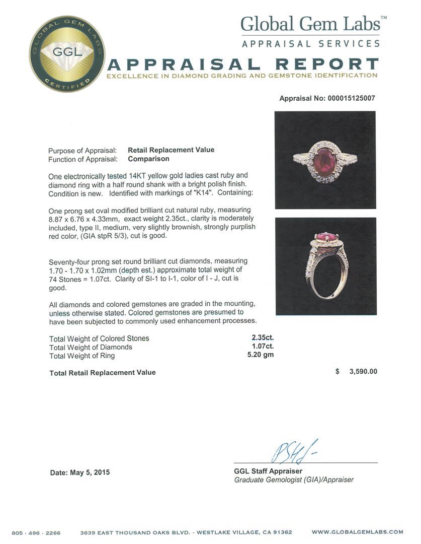 One electronically tested 14KT yellow gold ladies cast ruby and diamond ring with a half round shank with a bright polish finish. Identified with markings of "K14". Condition is new. Containing: One prong set oval modified brilliant cut natural ruby, measuring 8.87 x 6.76 x 4.33mm, exact weight 2.35ct., clarity is moderately included, type II, medium, very slightly brownish, strongly purplish red color, (GIA stpR 5/3), cut is good. Seventy-Four prong set round brilliant cut diamonds, measuring 1.70 - 1.70 x 1.02mm (depth est.) approximate total weight of 74 Stones = 1.07ct. Clarity: SI-1 to I-1. Color: I - J, Cut is Good. All diamonds and colored gemstones are graded in the mounting, unless otherwise stated. Colored gemstones are presumed to have been subjected to commonly used enhancement processes.. Total Weight of Colored Stones 2.35ct. Total Weight of Diamonds 1.07ct. Total Weight of Ring 5.20 grams. GGL Appraised at $3,590.00.