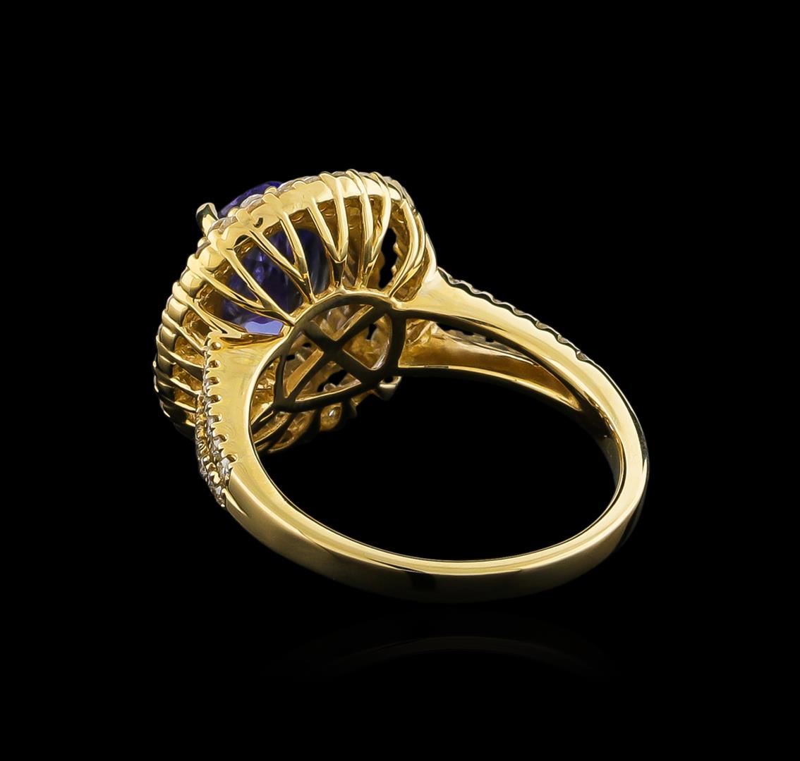 One electronically tested 14KT yellow gold ladies combination cast & assembled tanzanite and diamond ring with a split shank with a bright polish finish. Identified with markings of "14K". Condition is new. Containing: One prong set oval modified brilliant cut natural tanzanite, measuring 9.52 x 7.51 x 4.88mm, approximate weight of 2.37ct., clarity is eye clean, type I, medium, moderately strong, bluish violet color, (GIA bV 5/4), cut is good. Seventy-Six prong set round brilliant cut diamonds, measuring 1.30 - 1.10 x 0.72mm (depth est.) approximate total weight of 76 Stones = 0.48ct. Clarity: I-1 to I-2. Color: J - K, Cut is Good. Colored gemstones are presumed to have been subjected to commonly used enhancement processes. All diamonds and colored gemstones are graded in the mounting, unless otherwise stated total weight of Colored Stones 2.37ct. Total Weight of Diamonds 0.48ct. Total Weight of Ring 5.50 grams. GGL Appraised at $6,640.00.