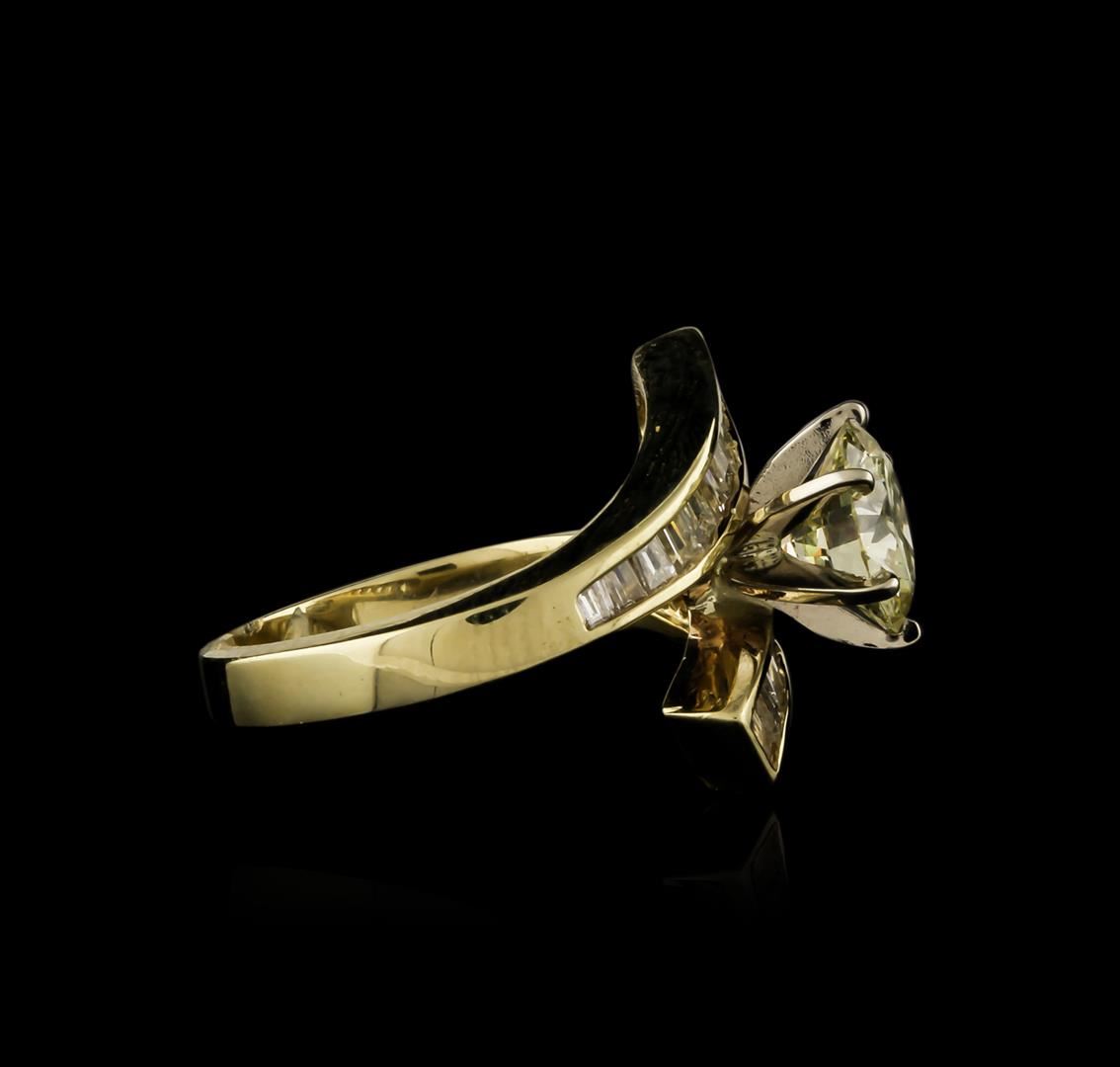 One electronically tested 14KT yellow gold ladies cast diamond engagement ring with a bright polish finish. Identified with markings of "14K". Condition is new. Containing: One prong set round brilliant cut diamond, measuring 7.85 - 7.85 x 4.71mm (depth est.) approximate weight of 1.77ct. Clarity: VS-2. Color: M, Cut is Good. Twenty channel set baguette cut diamonds, measuring from 1.50 x 1.00 x 0.85mm (depth est.) to 2.50 x 1.80 x 1.53mm (depth est.) approximate total weight of 20 Stones = 0.61ct. Clarity: I-1. Color: J - K, Cut is Good. All diamonds are graded in the mounting, unless otherwise stated. Total Weight of Diamonds 2.38ct. Total Weight of Engagement Ring 4.90 grams. GGL Appraised at $10,965.00.
