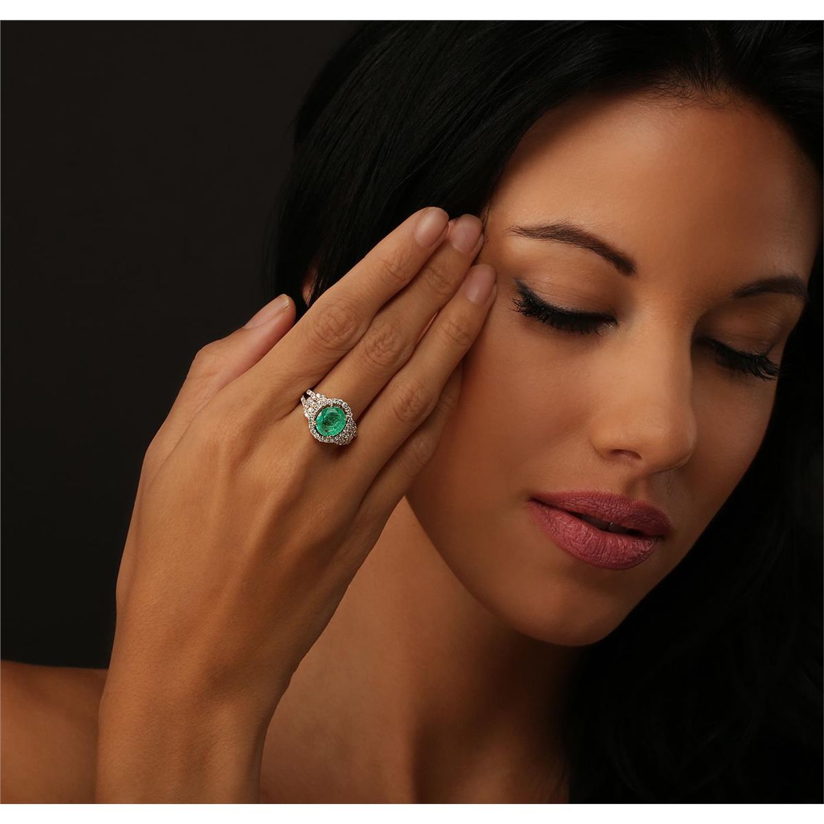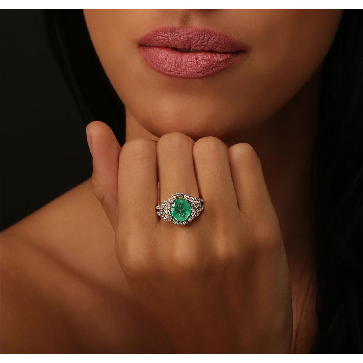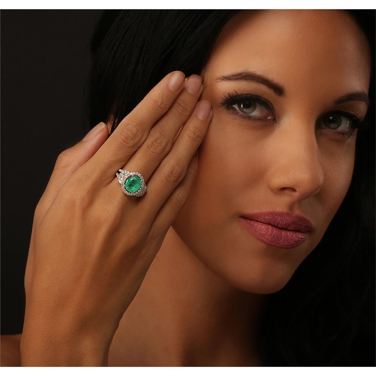One electronically tested 14KT yellow gold Ladies combination cast & assembled ring with a bright polish finish. Condition is new. Identified with markings of "14K". Containing: One prong set oval modified brilliant cut natural emerald, measuring 9.60 x 8.38 x 5.45mm, approximate weight of 2.40ct., clarity is moderately included, type III, medium light, moderately strong, green color, (GIA G 4/4), cut is good. Colored gemstones are presumed to have been subjected to commonly used enhancement processes. All diamonds and colored gemstones are graded in the mounting, unless otherwise stated. Fifty-Eight prong set round brilliant cut diamonds, measuring 2.00 - 1.30 x 0.99mm (depth est.) approximate total weight of 58 Stones = 0.68ct. Clarity: I-1 to I-2. Color: I - J, Cut is Good. Total Weight of Colored Stones 2.40ct. Total Weight of Diamonds 0.68ct. Total Weight of Ring 5.30 grams. GGL Appraised at $7,445.00.