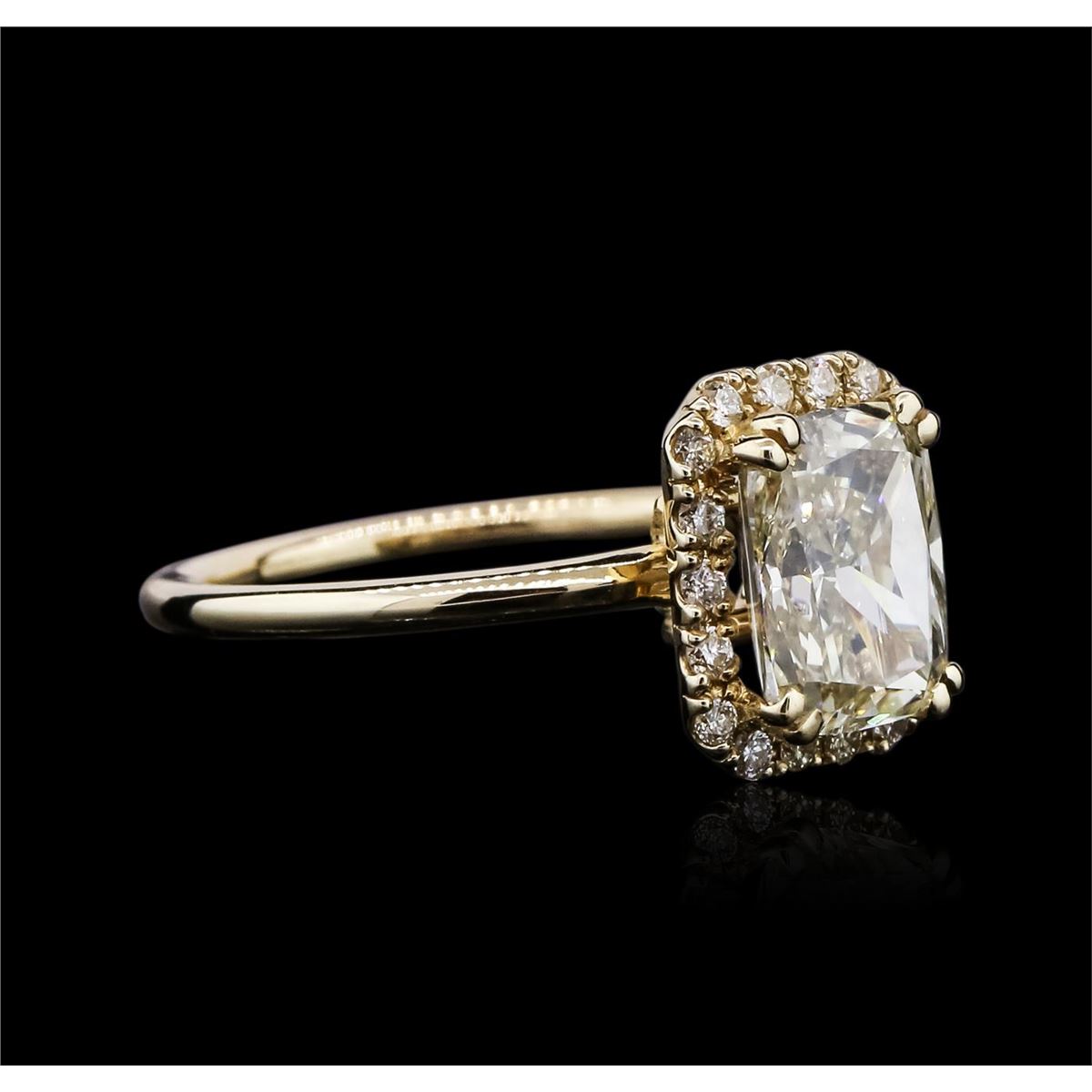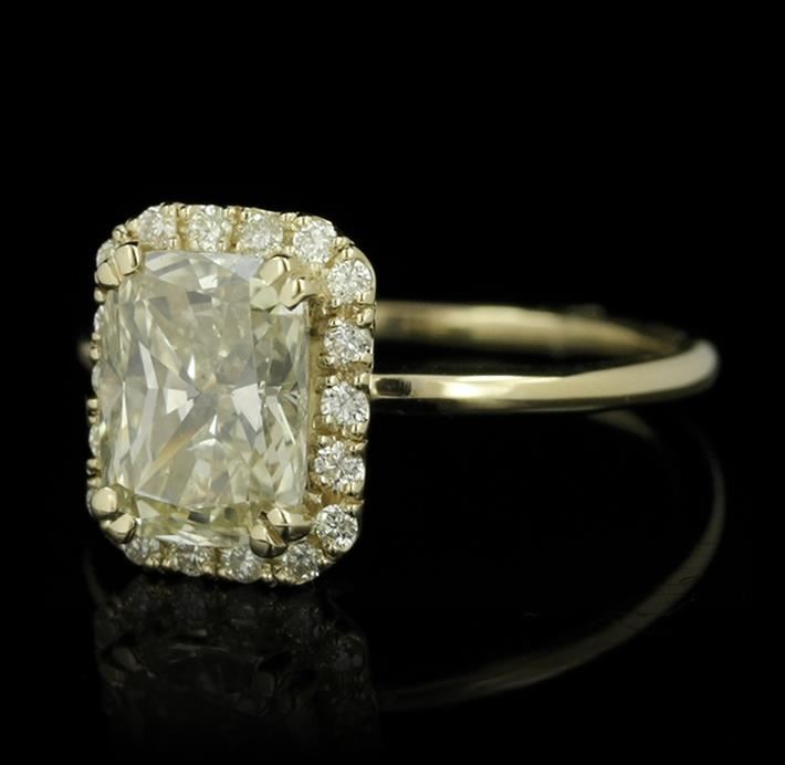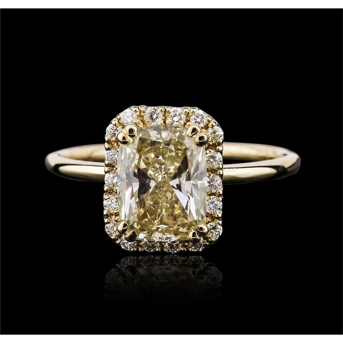 One electronically tested 14KT yellow gold ladies cast & assembled diamond unity ring with a bright polish finish. Condition is new, good workmanship. The featured diamond is set within a diamond bezel, completed by a one and one-half millimeter wide band. Identified with markings of "14K". Containing: One prong set radiant shaped cut diamond, measuring 8.70 x 6.65 x 4.30mm (depth est.), 10.00% GTCF approximate weight of 2.22ct. Diamond Grading Report attached. Graded in the setting. Clarity SI-2 . Color Very Light Yellow. Depth 64.%. Table 67.7%. Eighteen prong set round brilliant cut diamonds, measuring 1.50 - 1.40 x 0.87mm (depth est.) approximate total weight of 18 stones = 0.19ct. Graded in the setting. Clarity SI-1 to I-1. Color I-L. Total weight of Diamonds 2.41ct. Total weight of Ring 2.68m. AIG Appraised at $24,130.00.