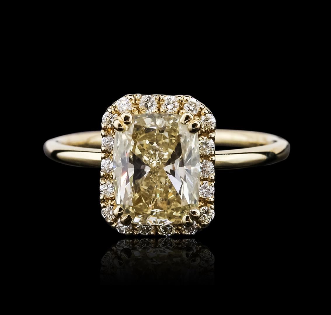 One electronically tested 14KT yellow gold ladies cast & assembled diamond unity ring with a bright polish finish. Condition is new, good workmanship. The featured diamond is set within a diamond bezel, completed by a one and one-half millimeter wide band. Identified with markings of "14K". Containing: One prong set radiant shaped cut diamond, measuring 8.70 x 6.65 x 4.30mm (depth est.), 10.00% GTCF approximate weight of 2.22ct. Diamond Grading Report attached. Graded in the setting. Clarity SI-2 . Color Very Light Yellow. Depth 64.%. Table 67.7%. Eighteen prong set round brilliant cut diamonds, measuring 1.50 -- 1.40 x 0.87mm (depth est.) approximate total weight of 18 stones = 0.19ct. Graded in the setting. Clarity SI-1 to I-1. Color I-L. Total weight of Diamonds 2.41ct. Total weight of Ring 2.68m. AIG Appraised at $24,130.00.