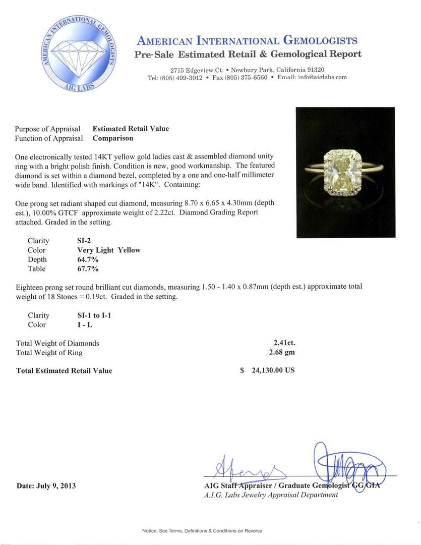 One electronically tested 14KT yellow gold ladies cast & assembled diamond unity ring with a bright polish finish. Condition is new, good workmanship. The featured diamond is set within a diamond bezel, completed by a one and one-half millimeter wide band. Identified with markings of "14K". Containing: One prong set radiant shaped cut diamond, measuring 8.70 x 6.65 x 4.30mm (depth est.), 10.00% GTCF approximate weight of 2.22ct. Diamond Grading Report attached. Graded in the setting. Clarity SI-2 . Color Very Light Yellow. Depth 64.%. Table 67.7%. Eighteen prong set round brilliant cut diamonds, measuring 1.50 -- 1.40 x 0.87mm (depth est.) approximate total weight of 18 stones = 0.19ct. Graded in the setting. Clarity SI-1 to I-1. Color I-L. Total weight of Diamonds 2.41ct. Total weight of Ring 2.68m. AIG Appraised at $24,130.00.