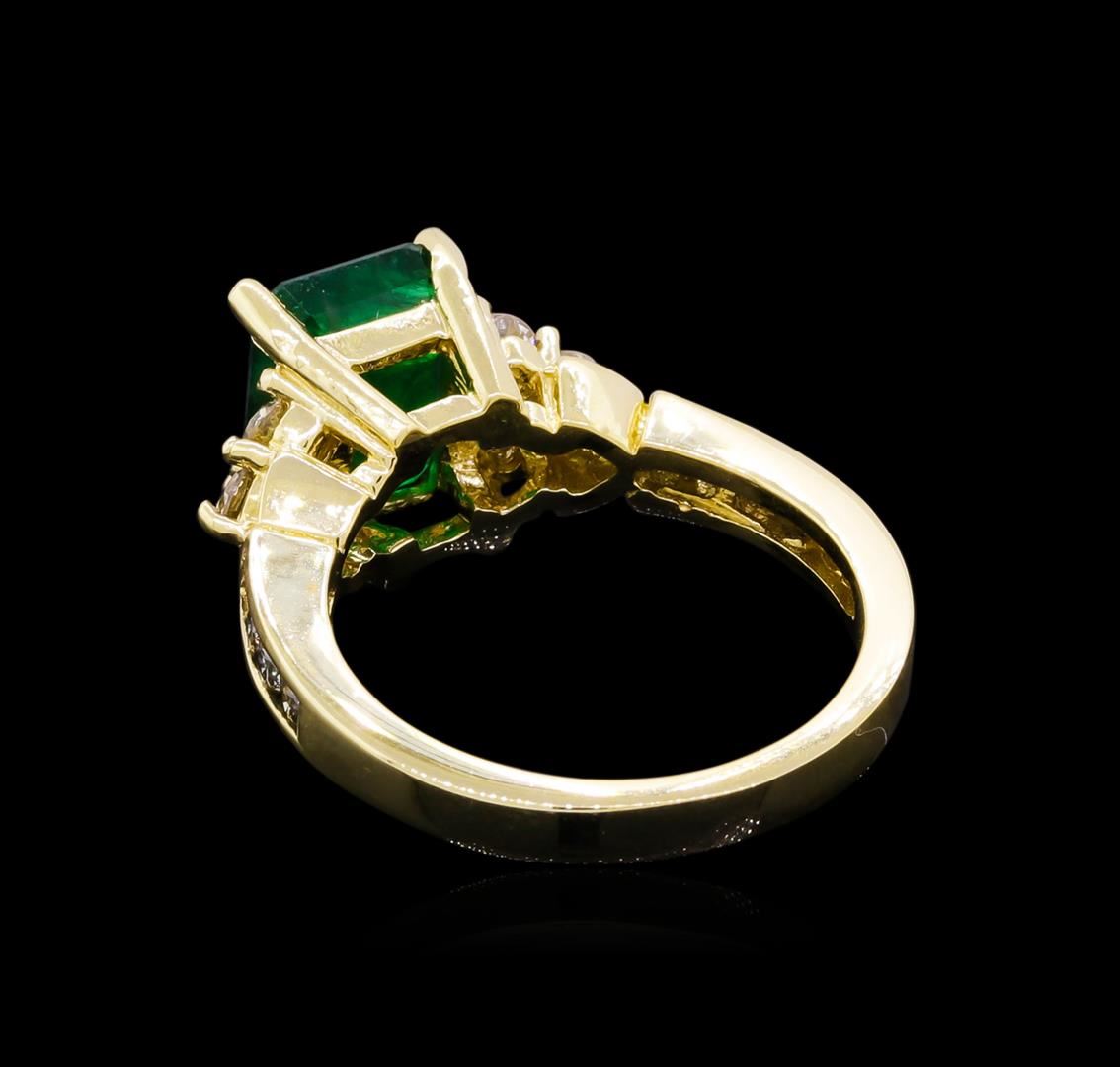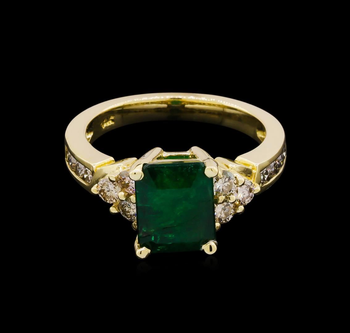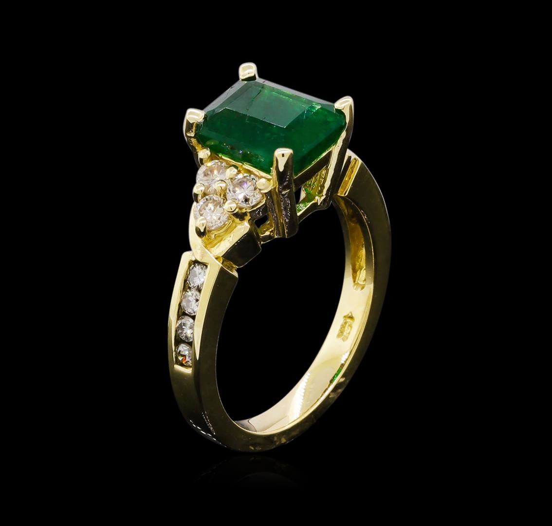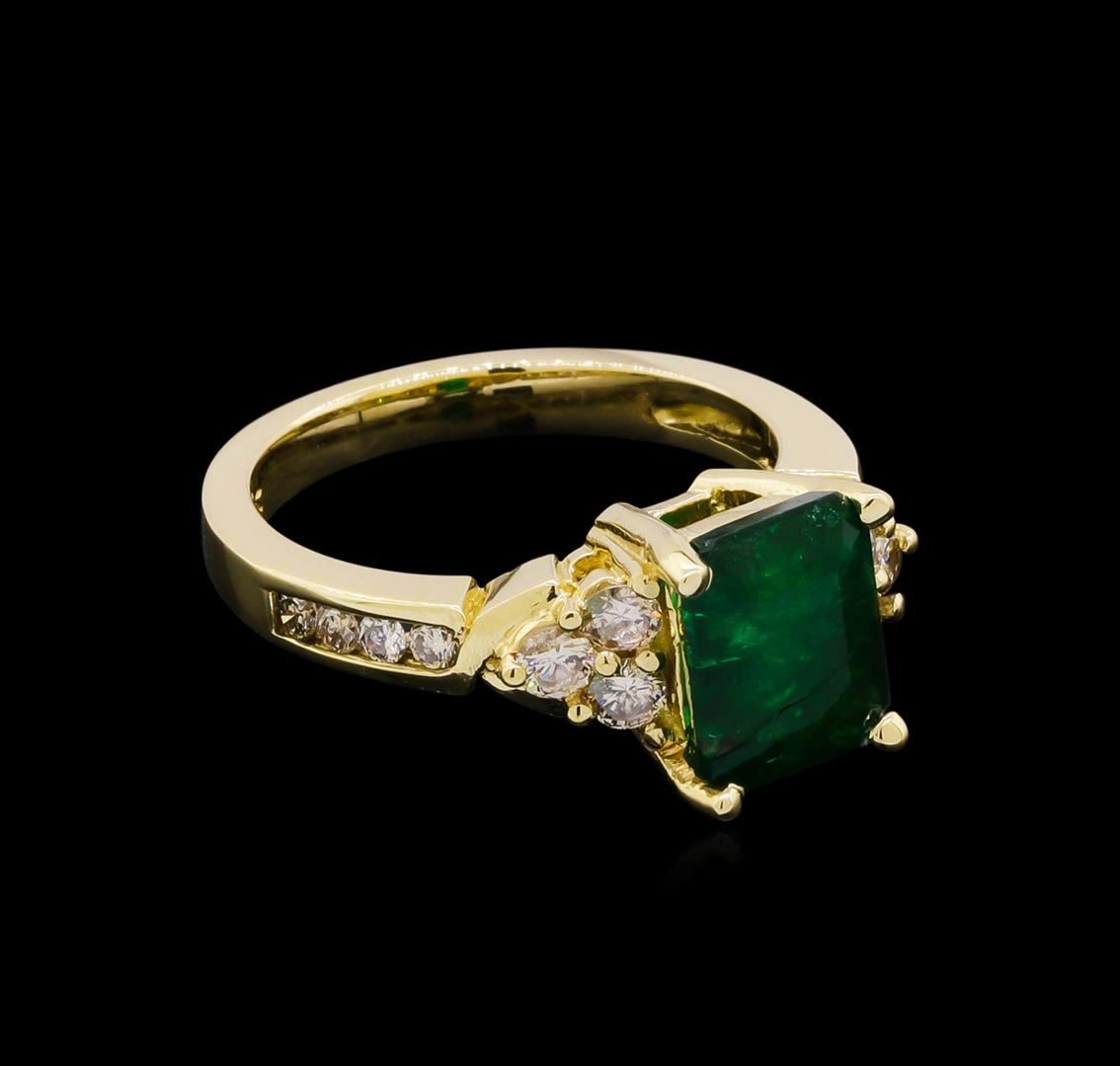 One electronically tested 14KT yellow gold ladies cast emerald and diamond ring with a bright polish finish. The featured emerald is supported by elaborate diamond set shoulders, completed by a two and one-half millimeter wide band. Identified with markings of "14K". Condition is new, good workmanship. Containing: One prong set rectangular step cut natural emerald, measuring 8.80 x 7.15 x 4.42mm, 8%. bulge factor, approximate weight of 2.45ct., clarity is heavily included, type III, medium dark, very slightly grayish, very slightly bluish green color, (GIA vslbG 6/3), cut is good. Transmitting light with a minimum of distortion, transparent. Naturally occurring internal & external characteristics are present. Indications of oil & opticon residue. Graded in the setting. Six prong set round brilliant cut diamonds, measuring 2.60 - 2.50 x 1.53mm (depth est.) approximate. Total Weight of 6 Stones = 0.46ct. Graded in the setting. Clarity: SI-1 to I-1 . Color: H - J Eight channel set round brilliant cut diamonds, measuring 1.80 - 1.80 x 1.08mm (depth est.) approximate. Total Weight of 8 Stones = 0.27ct. Graded in the setting. Clarity: SI-1 to I-1 . Color: G - I. Total Weight of Colored Stones 2.45ct. Total Weight of Diamonds 0.73ct. AIG Appraised at $5,810.00.